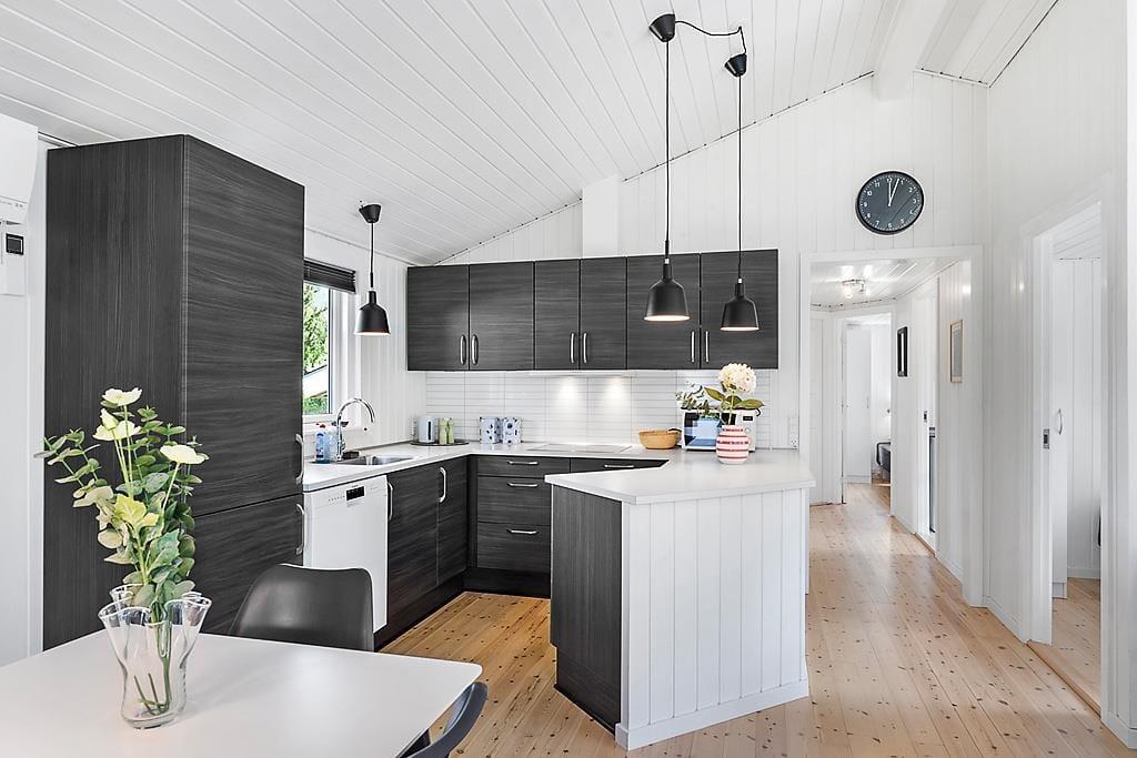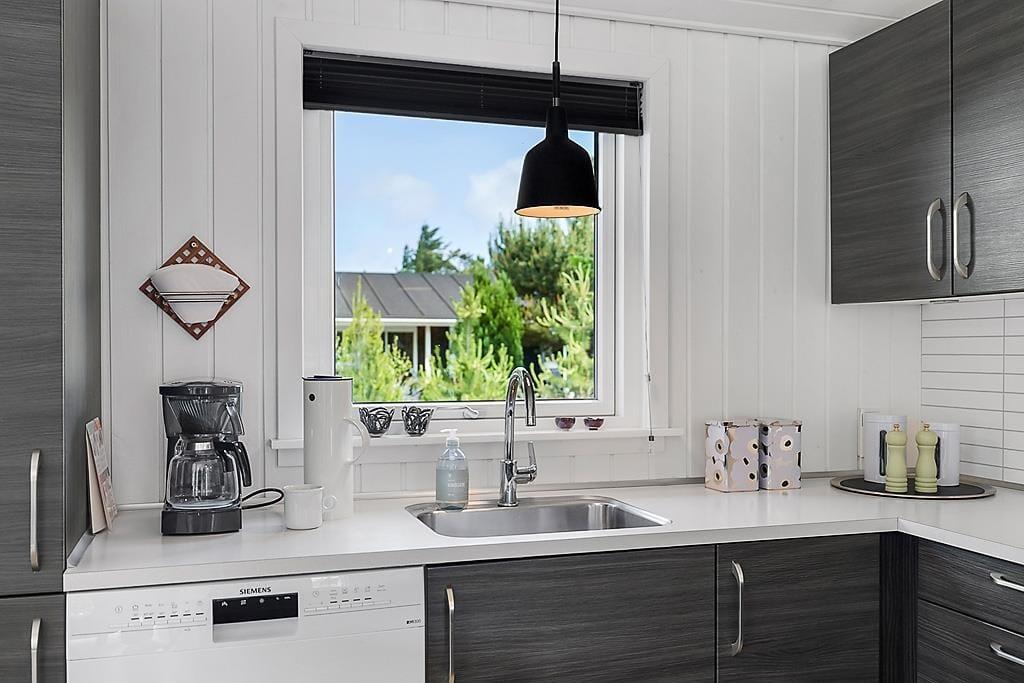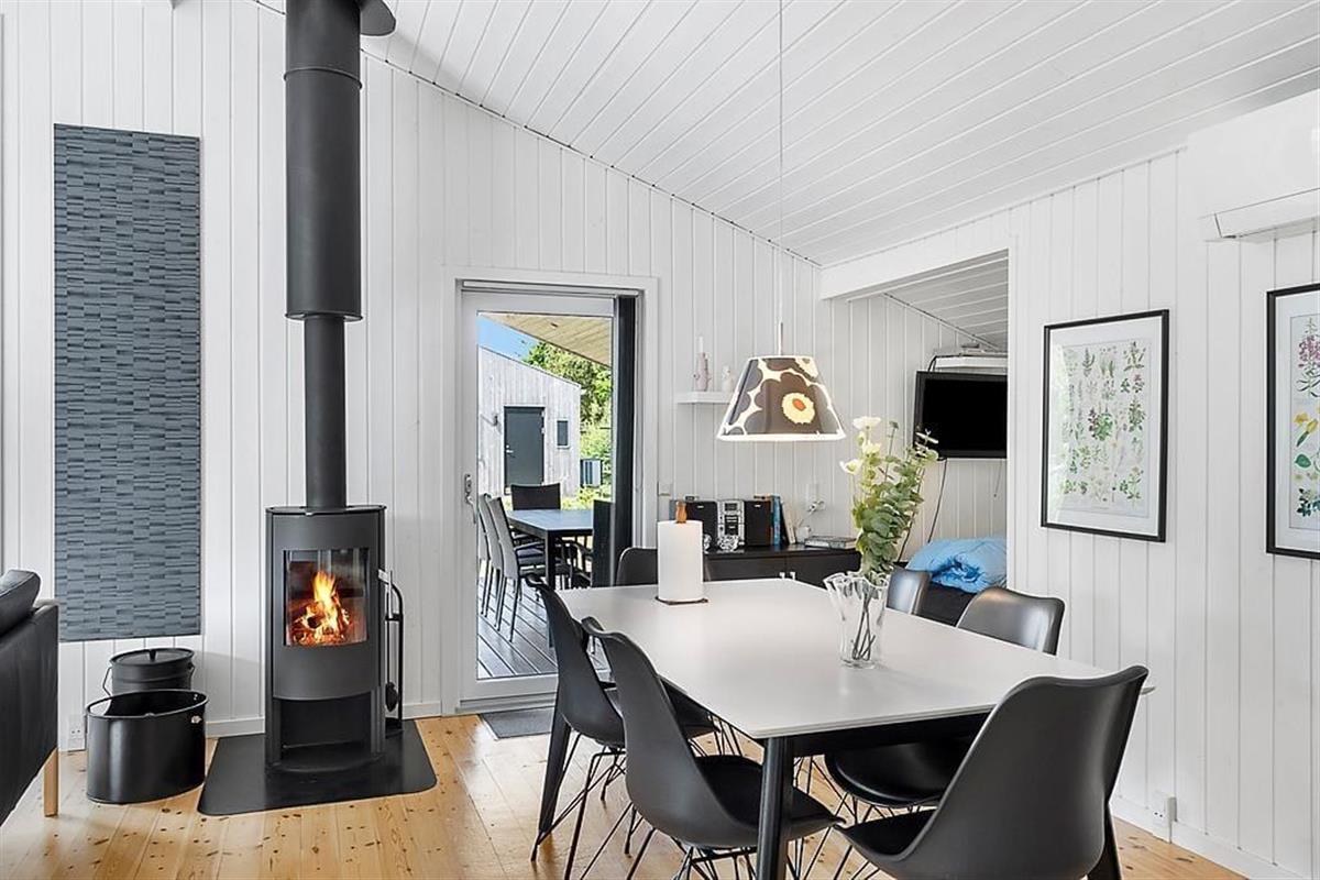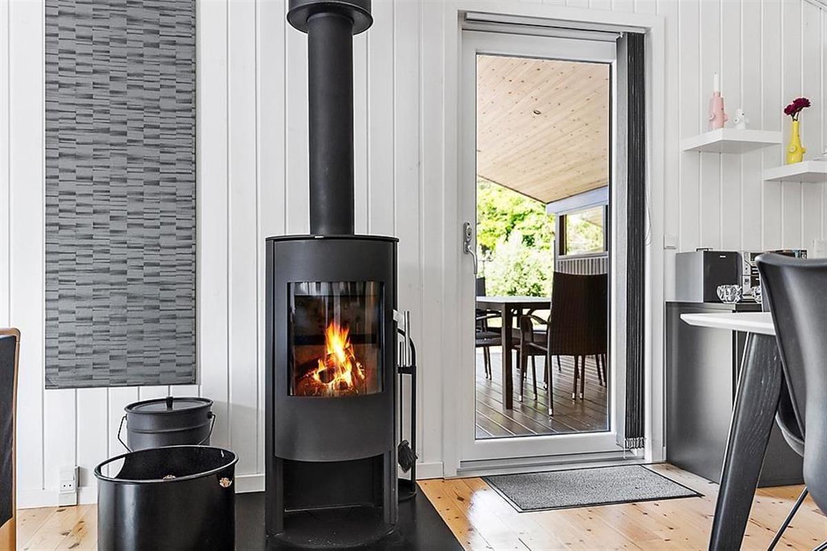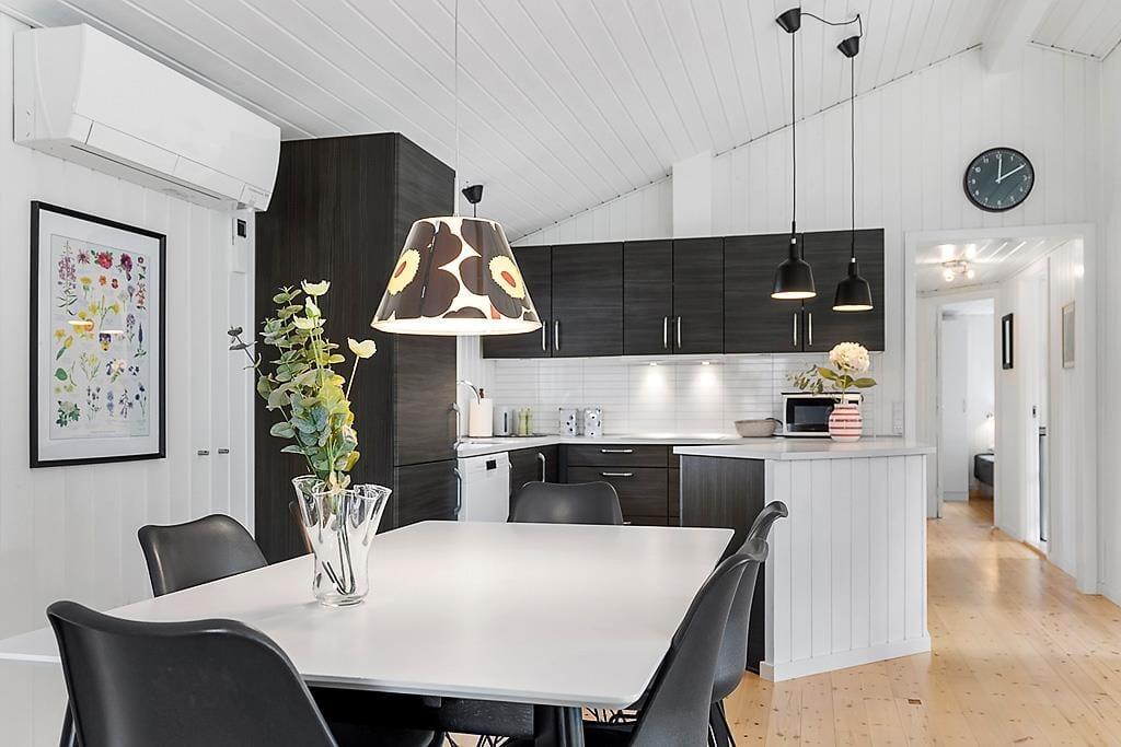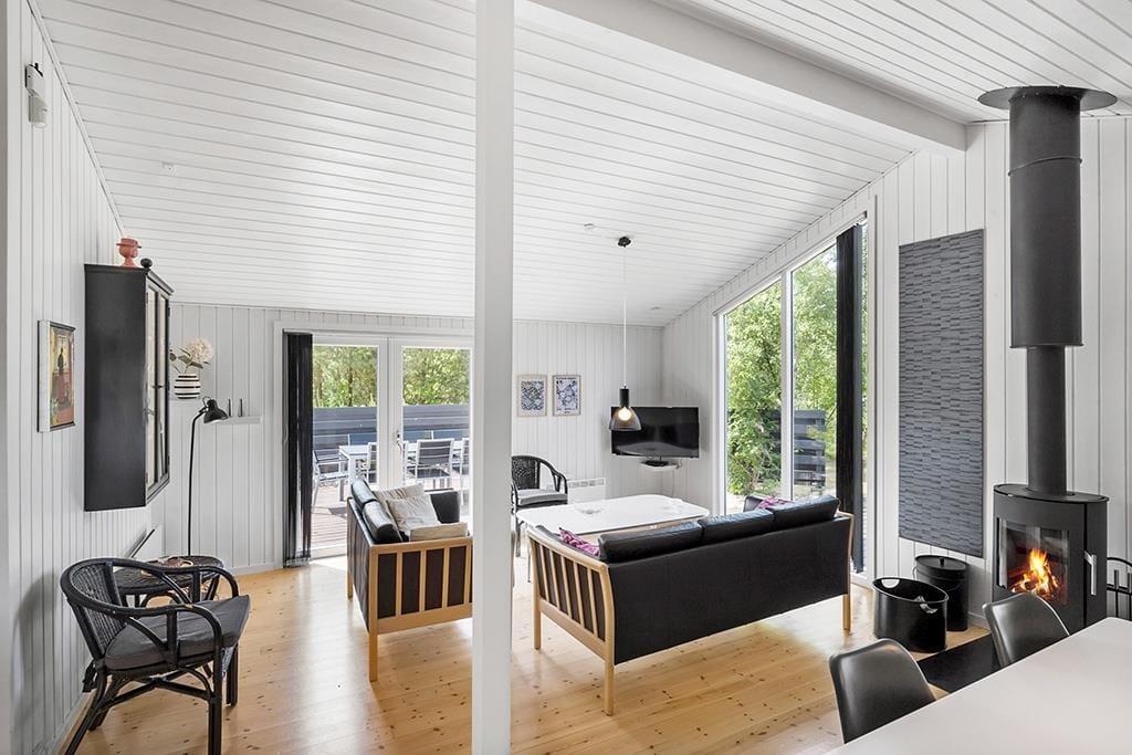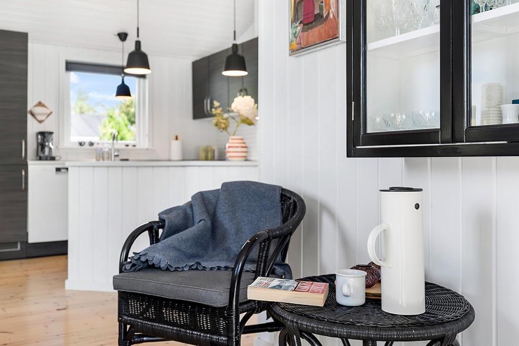 Das Haus ist in hellen Tönen, warmem Stil und mit weißen Holzwänden sowie großen Fenstern und hohen Decken eingerichtet. Bequeme Möbel, viele Details und Wellness in Form von Whirlpool und Sauna im Badezimmer. Es gibt acht Schlafmöglichkeiten, wovon zwei in einer gemütlichen Nische am Wohnzimmer sind. Das Haus eignet sich sowohl für kleine Familien als auch für eine große. Im vorderen Hausteil befinden sich die Schlafräume und das Badezimmer. Im hinteren Abschnitt sind die Küche und das Wohnzimmer mit Kamin. Eine praktische Aufteilung, insbesondere wenn Kinder früher ins Bett müssen. Kostenloses WLAN ist vorhanden, damit Sie auch das Tablet oder den Laptop verbinden können.