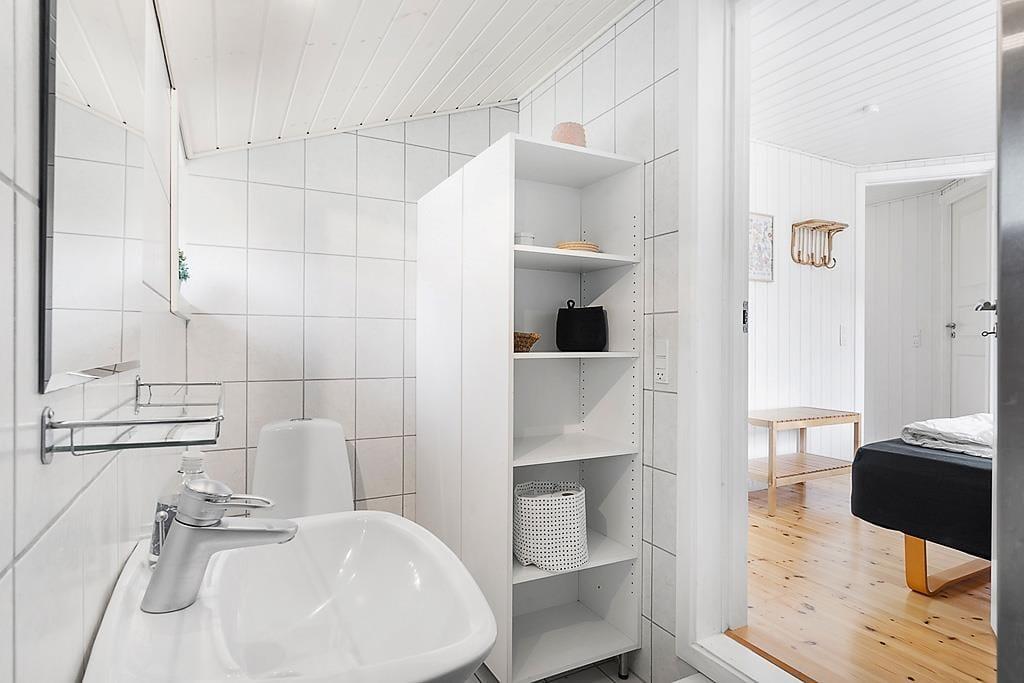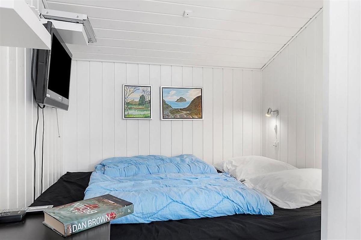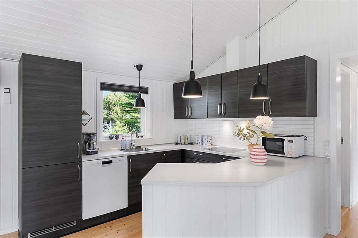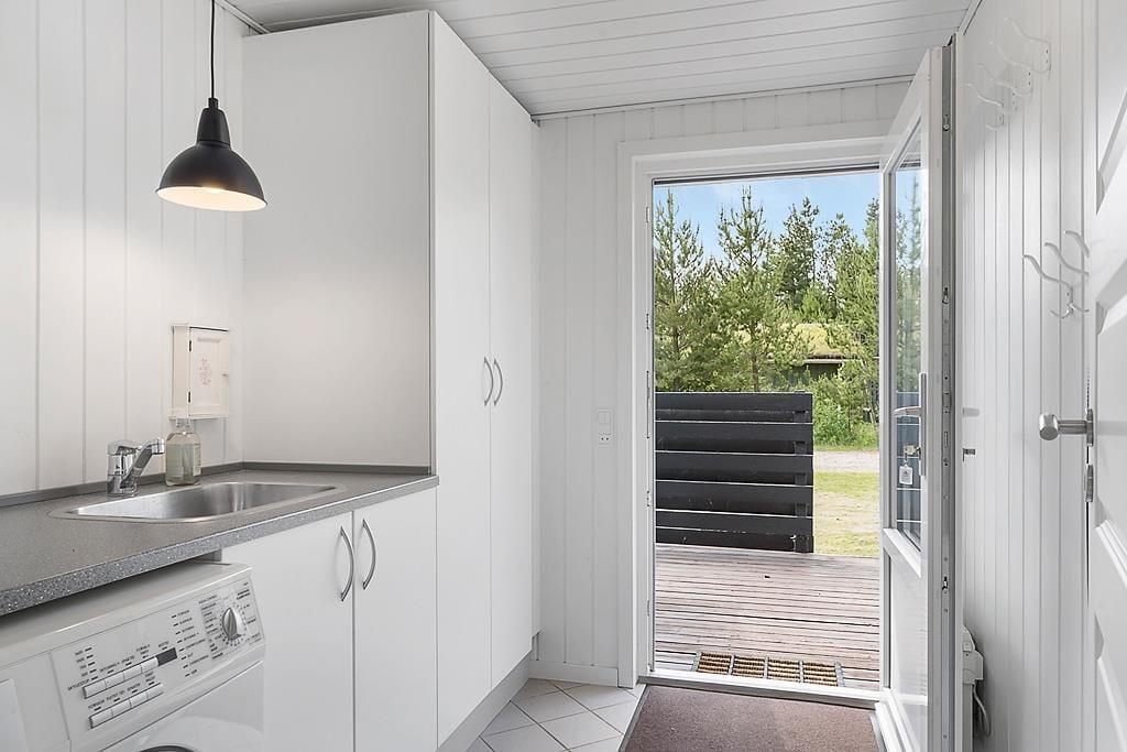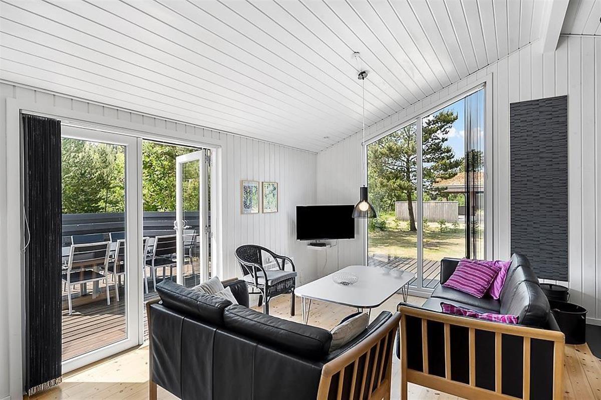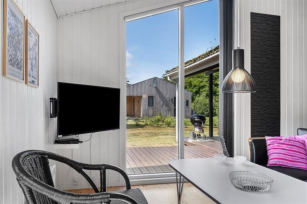 Das Haus ist in hellen Tönen, warmem Stil und mit weißen Holzwänden sowie großen Fenstern und hohen Decken eingerichtet. Bequeme Möbel, viele Details und Wellness in Form von Whirlpool und Sauna im Badezimmer. Es gibt acht Schlafmöglichkeiten, wovon zwei in einer gemütlichen Nische am Wohnzimmer sind. Das Haus eignet sich sowohl für kleine Familien als auch für eine große. Im vorderen Hausteil befinden sich die Schlafräume und das Badezimmer. Im hinteren Abschnitt sind die Küche und das Wohnzimmer mit Kamin. Eine praktische Aufteilung, insbesondere wenn Kinder früher ins Bett müssen. Kostenloses WLAN ist vorhanden, damit Sie auch das Tablet oder den Laptop verbinden können.