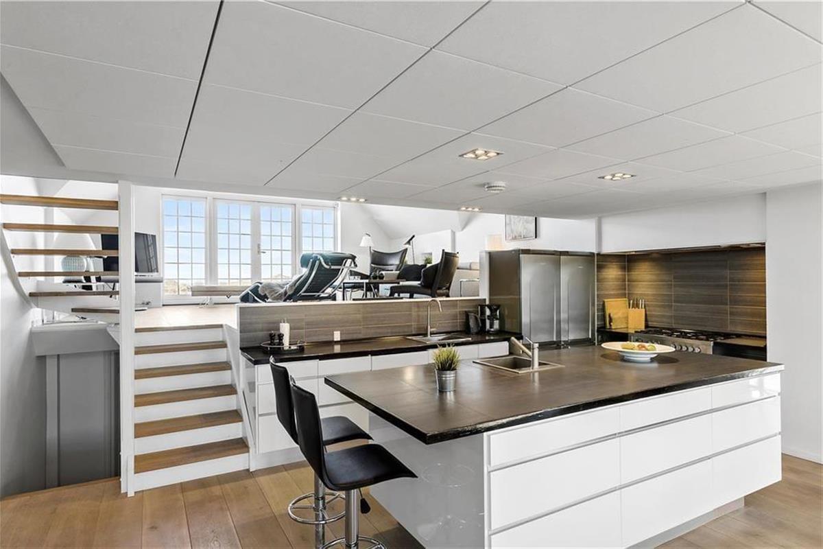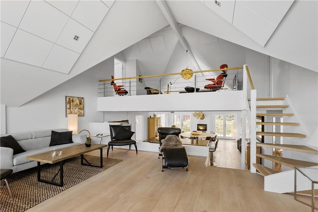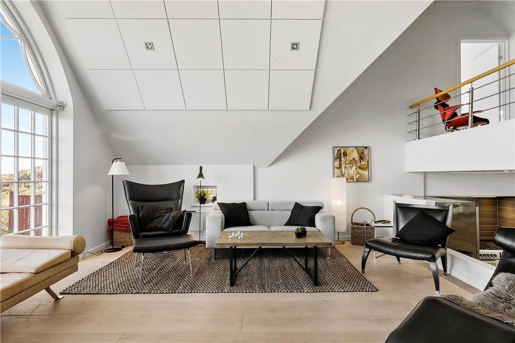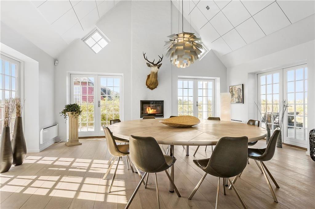 Wenn du dieses einladende Ferienhaus betrittst, wirst du von hellen, offenen Räumen empfangen, die sich über mehrere Etagen erstrecken. Große Fensterpartien im Wohnzimmer sorgen für viel Tageslicht und einen atemberaubenden Blick auf das Meer. Das Wohnzimmer ist in mehrere Ebenen unterteilt, was zu einer angenehmen Atmosphäre beiträgt. Es ist der perfekte Ort, um Zeit mit Familie oder Freunden zu verbringen – entweder am großen Esstisch, der Platz für festliche Mahlzeiten bietet, oder in der gemütlichen Sofaecke vor dem Kamin. Die offenen Verbindungen zwischen Wohnbereich und Küche ermöglichen es, sowohl gesellige Momente als auch Kochspaß zu teilen – während im Hintergrund das Rauschen des Meeres zu hören ist.