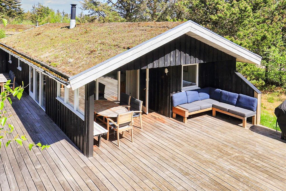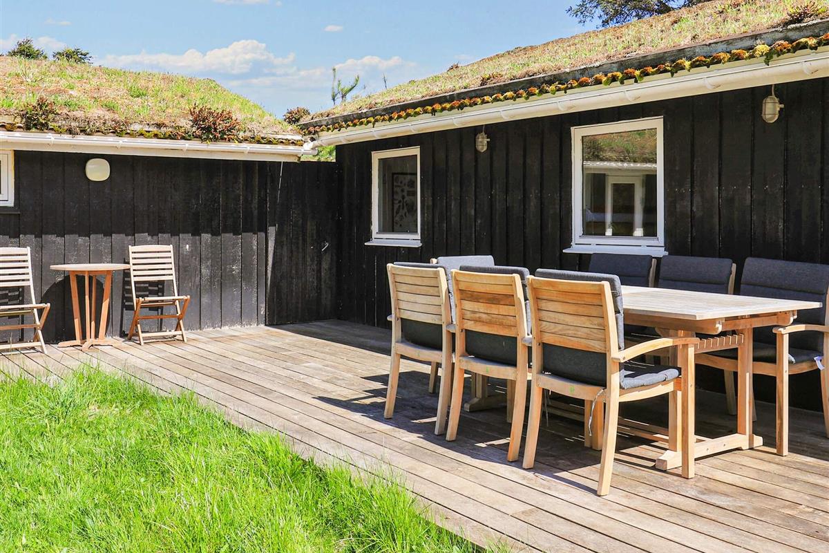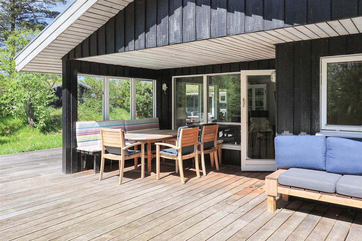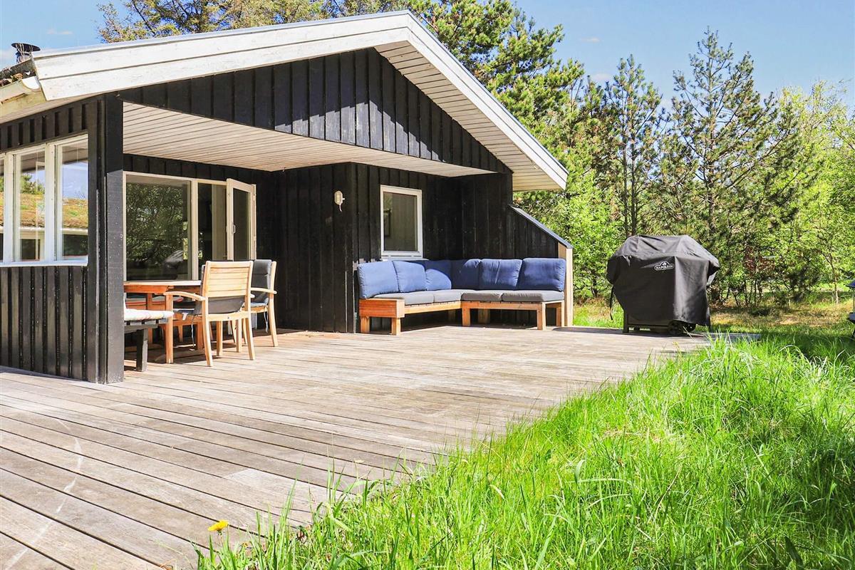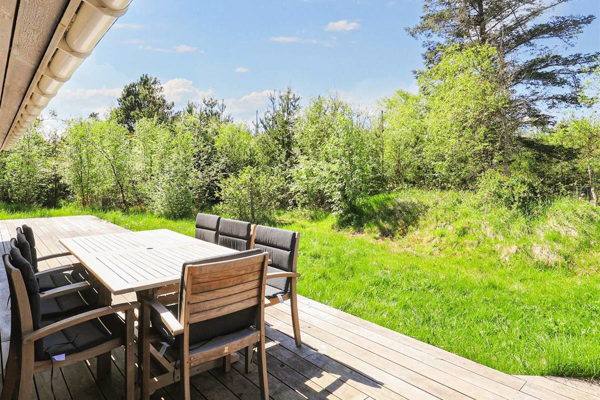 Rund um das Haus findet man eine große Holzterrasse mit Gartenmöbeln und einem Grill. Dort besteht fast immer die Möglichkeit, eine sonnige Ecke zu finden.