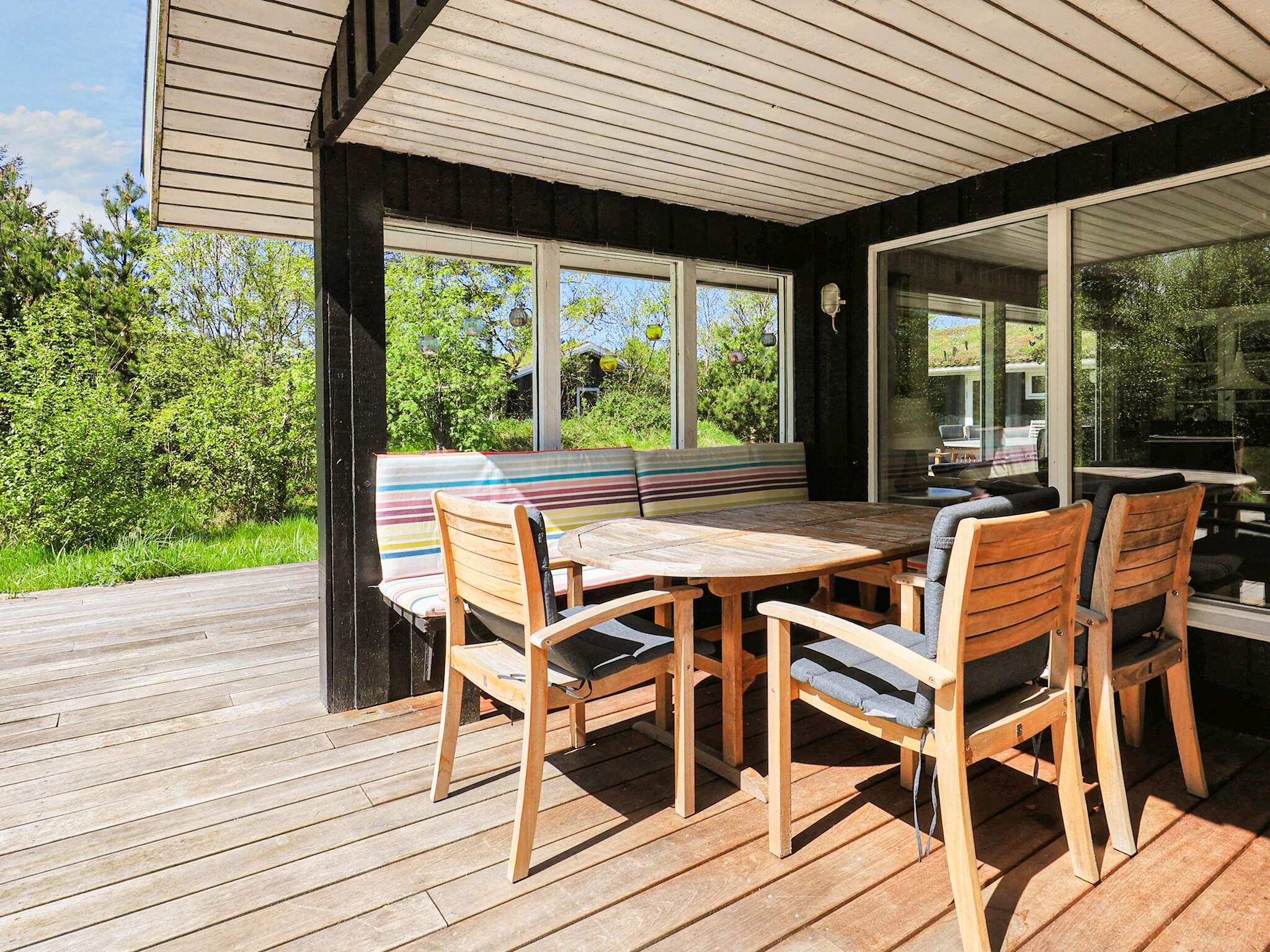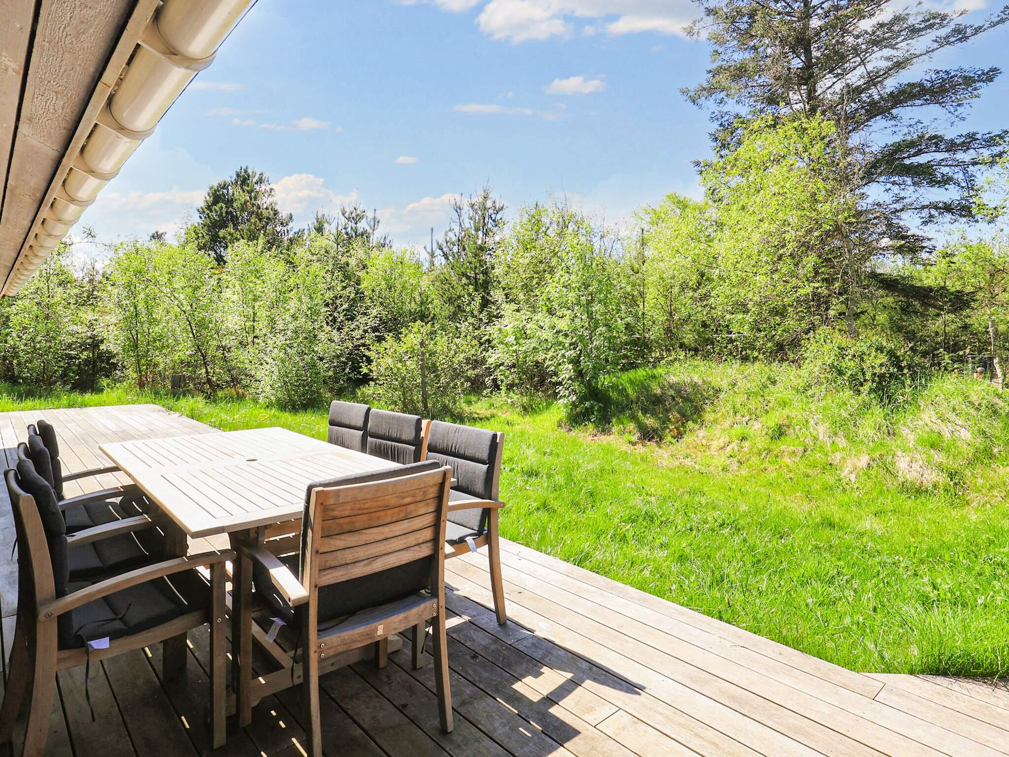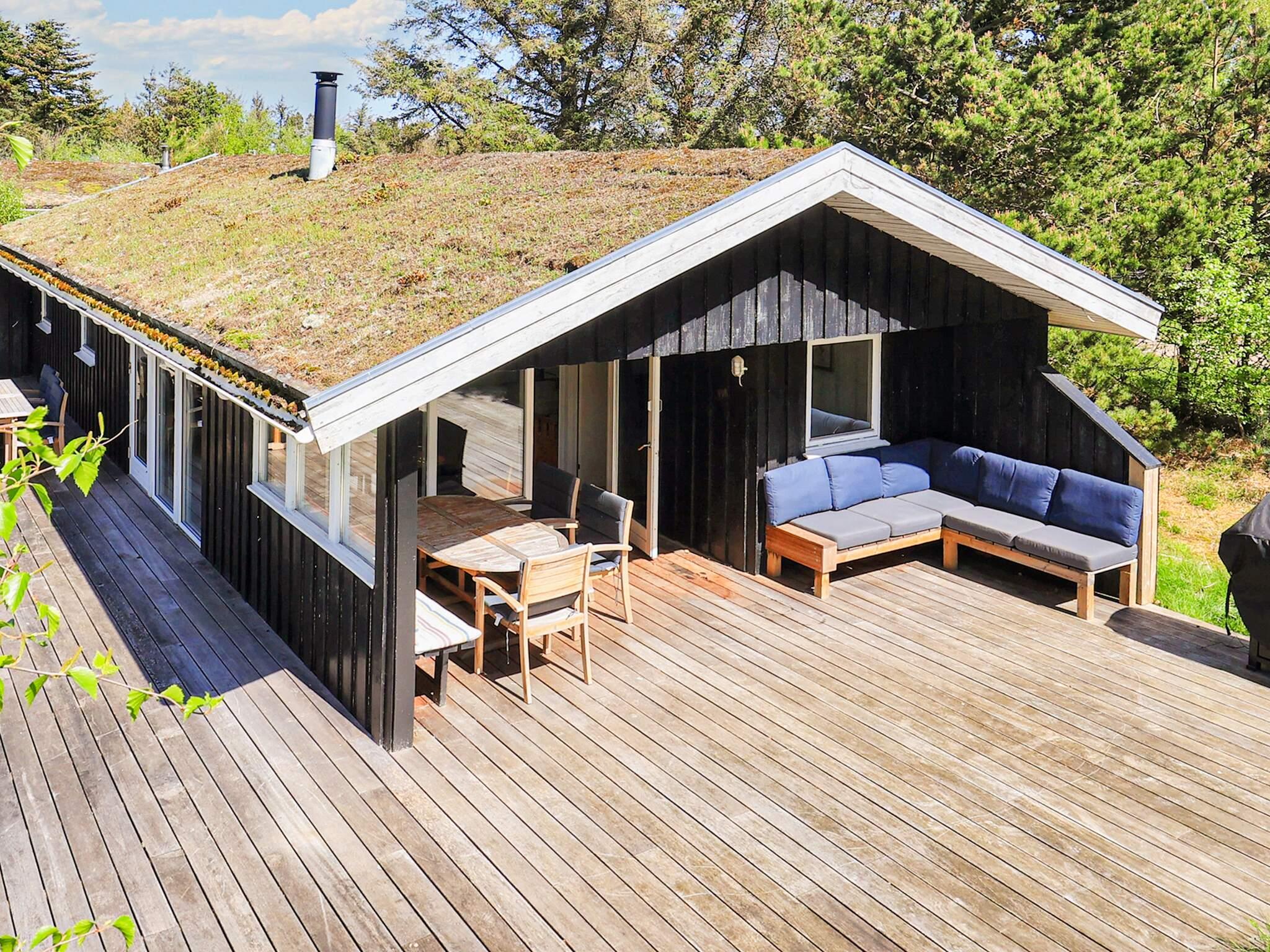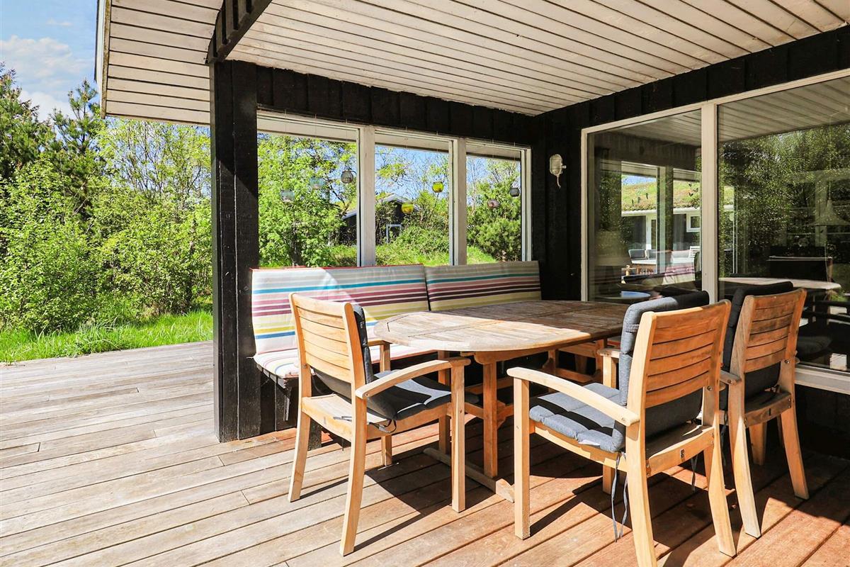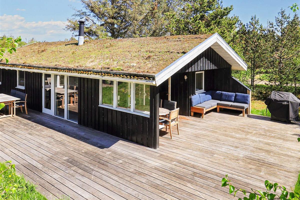 Rund um das Haus findet man eine große Holzterrasse mit Gartenmöbeln und einem Grill. Dort besteht fast immer die Möglichkeit, eine sonnige Ecke zu finden.