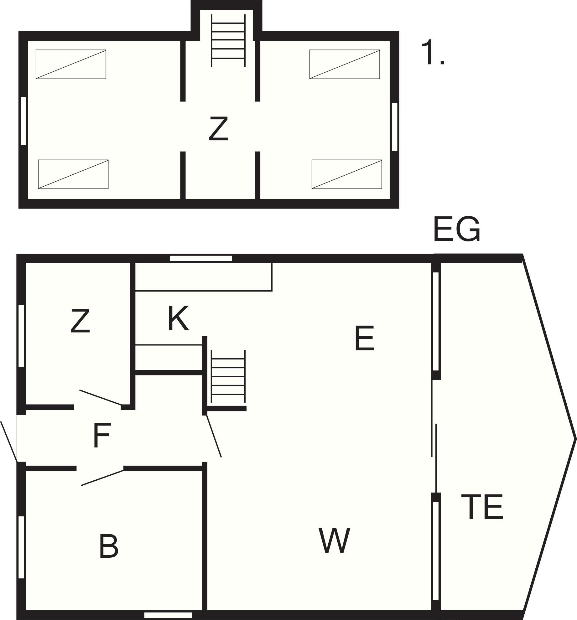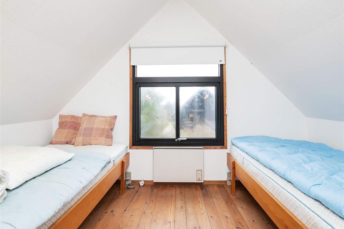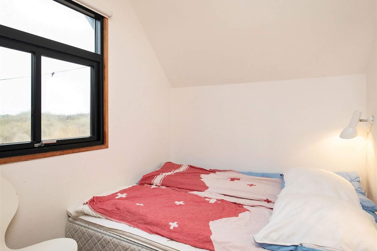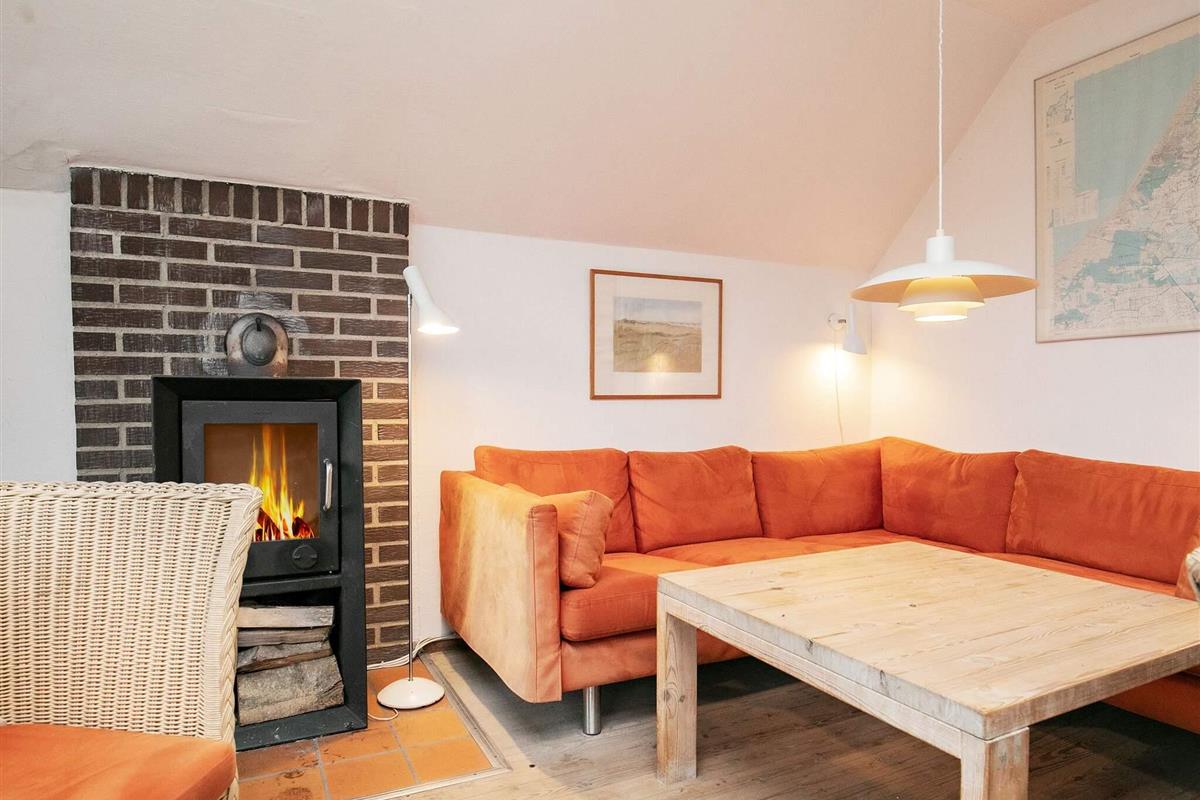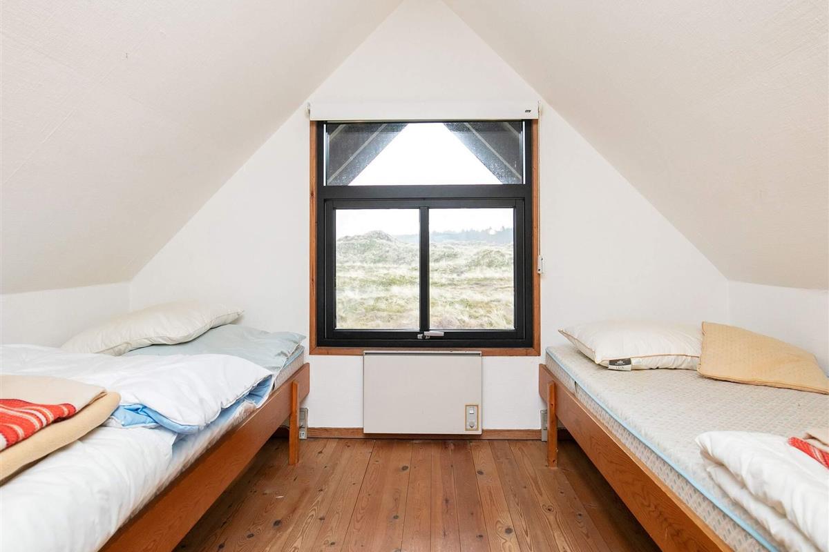 Ferienhaus auf zwei Etagen u. mit Bad von 2001. Das Obergeschoss ist über eine offene, steile Treppe erreichbar. Oben liegt auch das eine der beiden Schlafzimmer, das eigentlich aus zwei offenen Räumen besteht, die durch den Treppenabsatz voneinander getrennt sind. Im Erdgeschoss befindet sich der Wohnraum, der mit der offenen Küche kombiniert ist, ein Schlafraum mit Doppelbett und das Bad. Weiterhin sind Terrassenflächen und eine Garage vorhanden. Die Einrichtung ist persönlich und gemütlich. Das Haus steht auf einem Dünen-/Heidegrundstück.