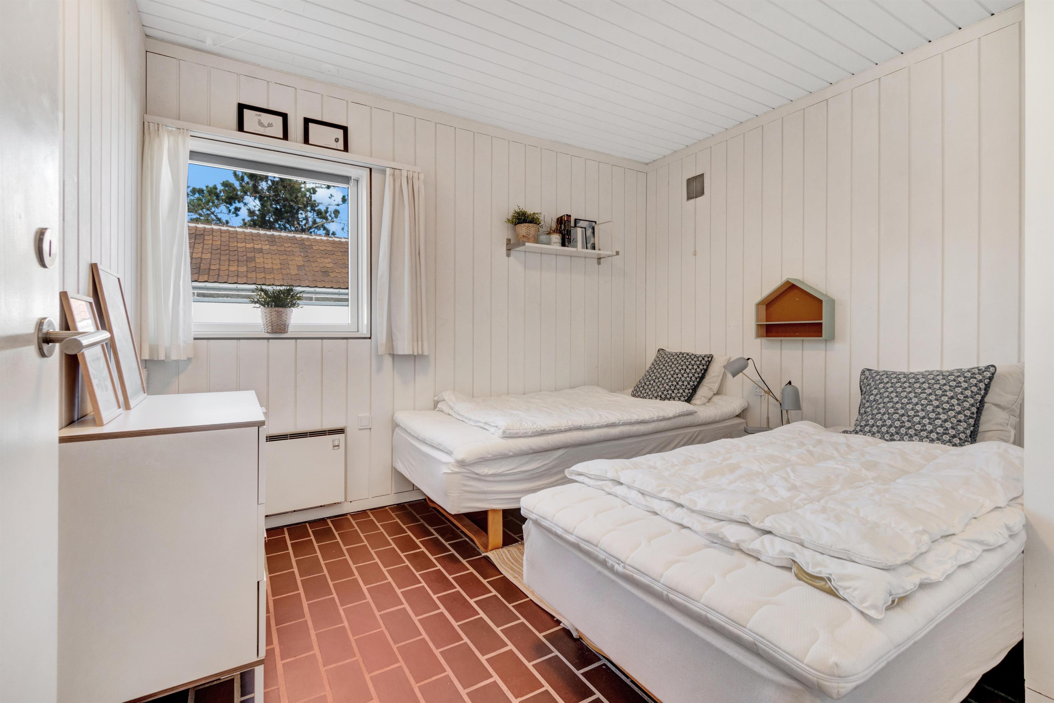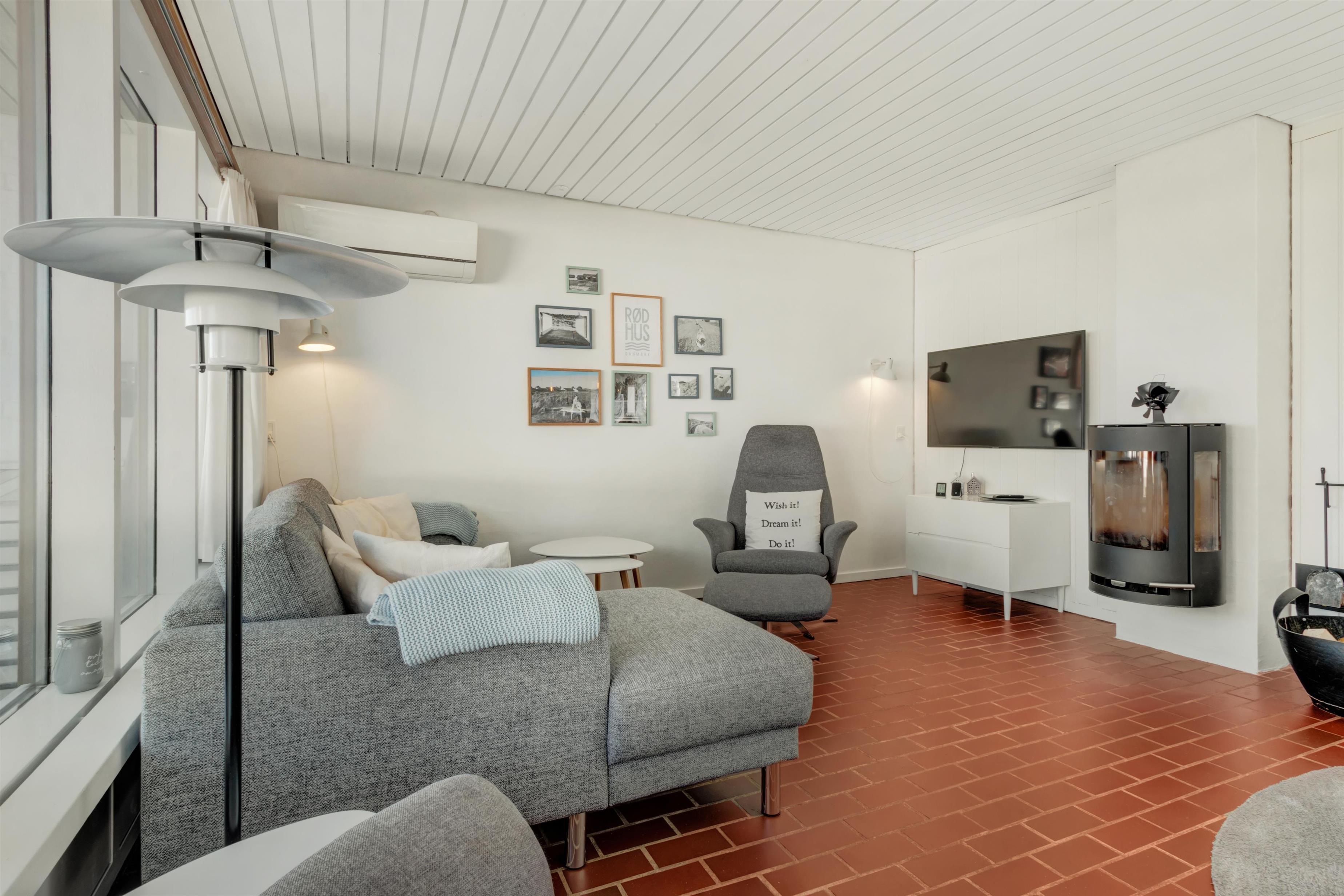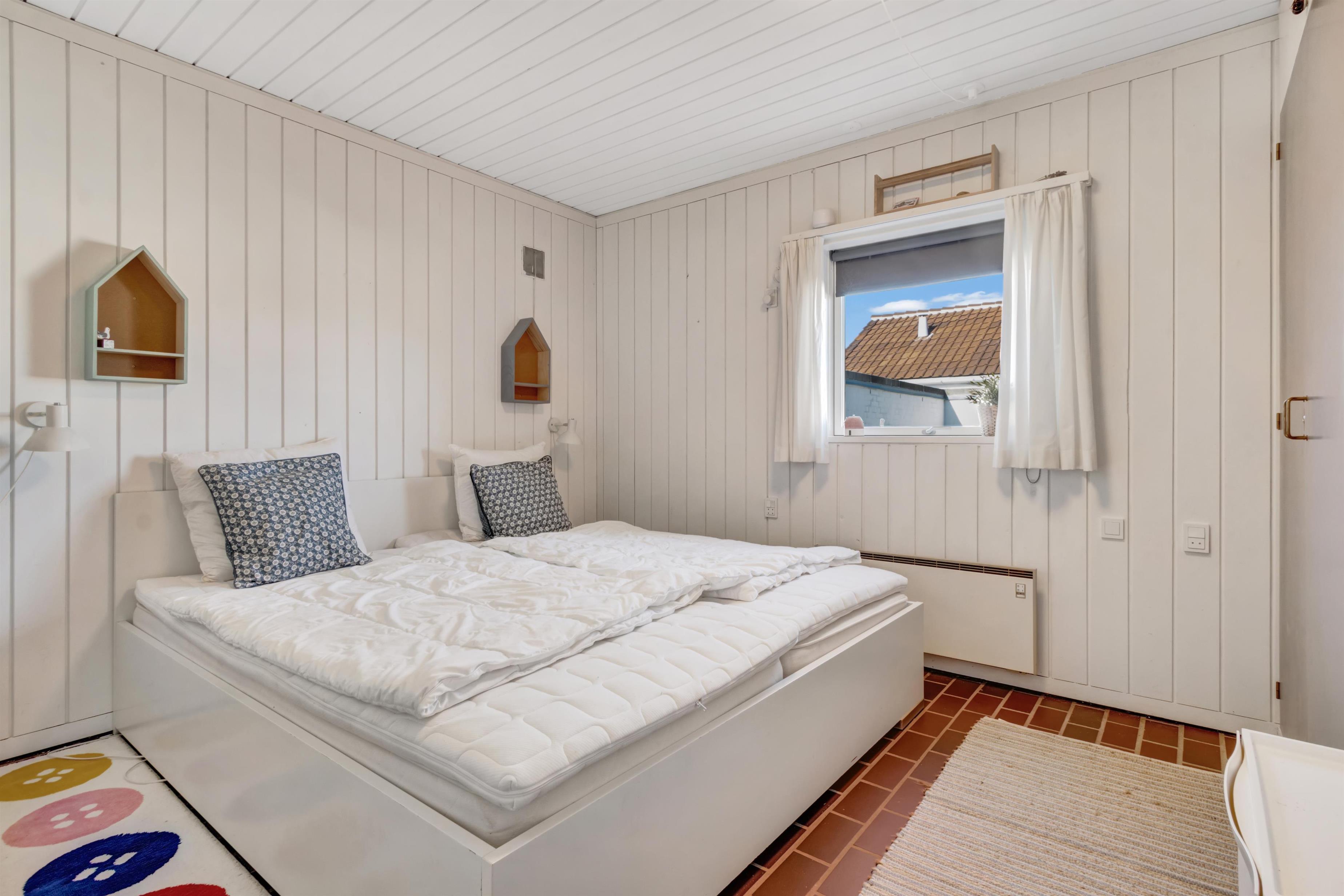 Continuing straight ahead, you enter the house's second bedroom, where there are two single beds. From the hallway, you access the holiday home's beautiful kitchen/dining area and living room, which is stylishly furnished and super cozy with a wood stove and access to the lovely, secluded terrace and garden. The house is smoke-free, and youth groups are not allowed. Remember to order any needed linen packages when booking to avoid additional administration fees.
