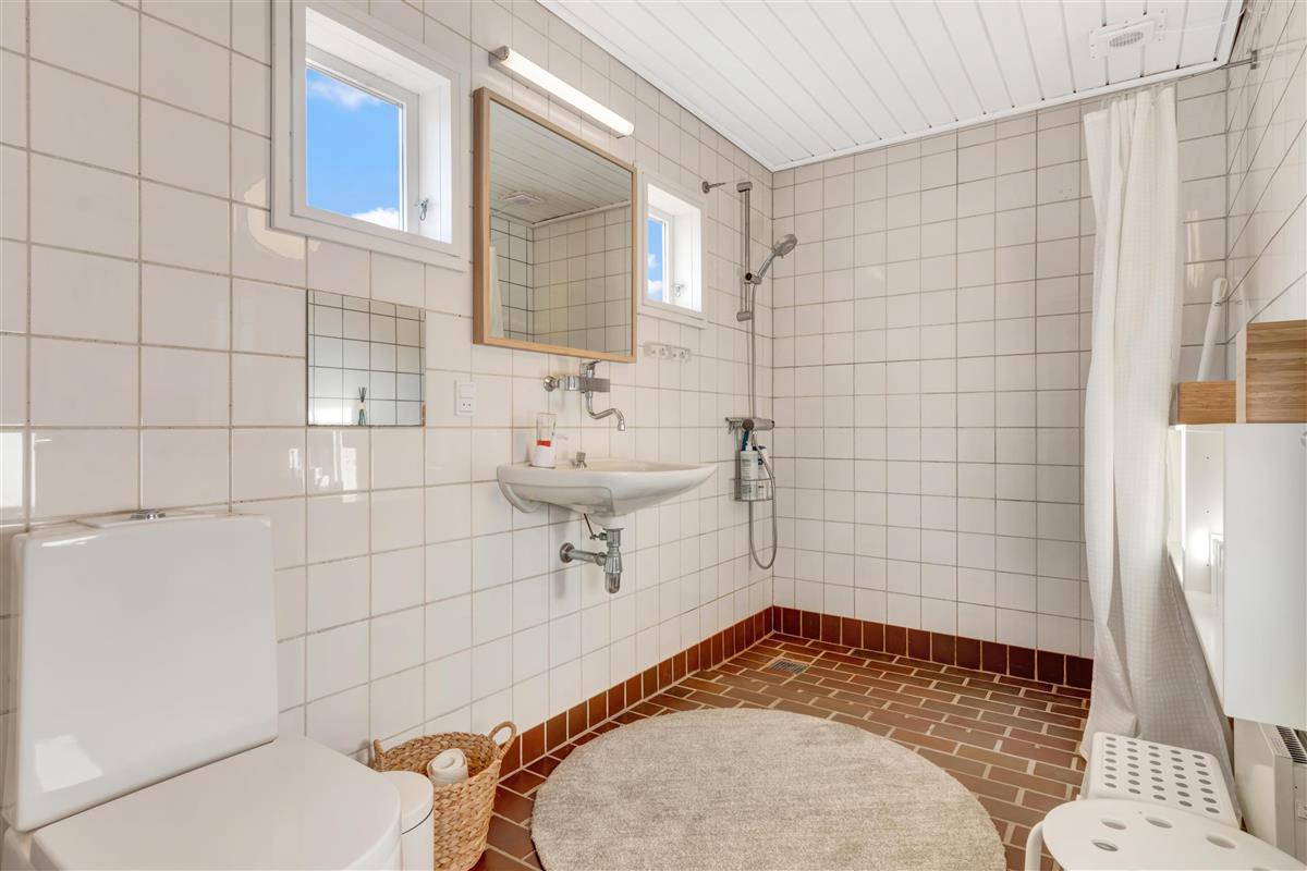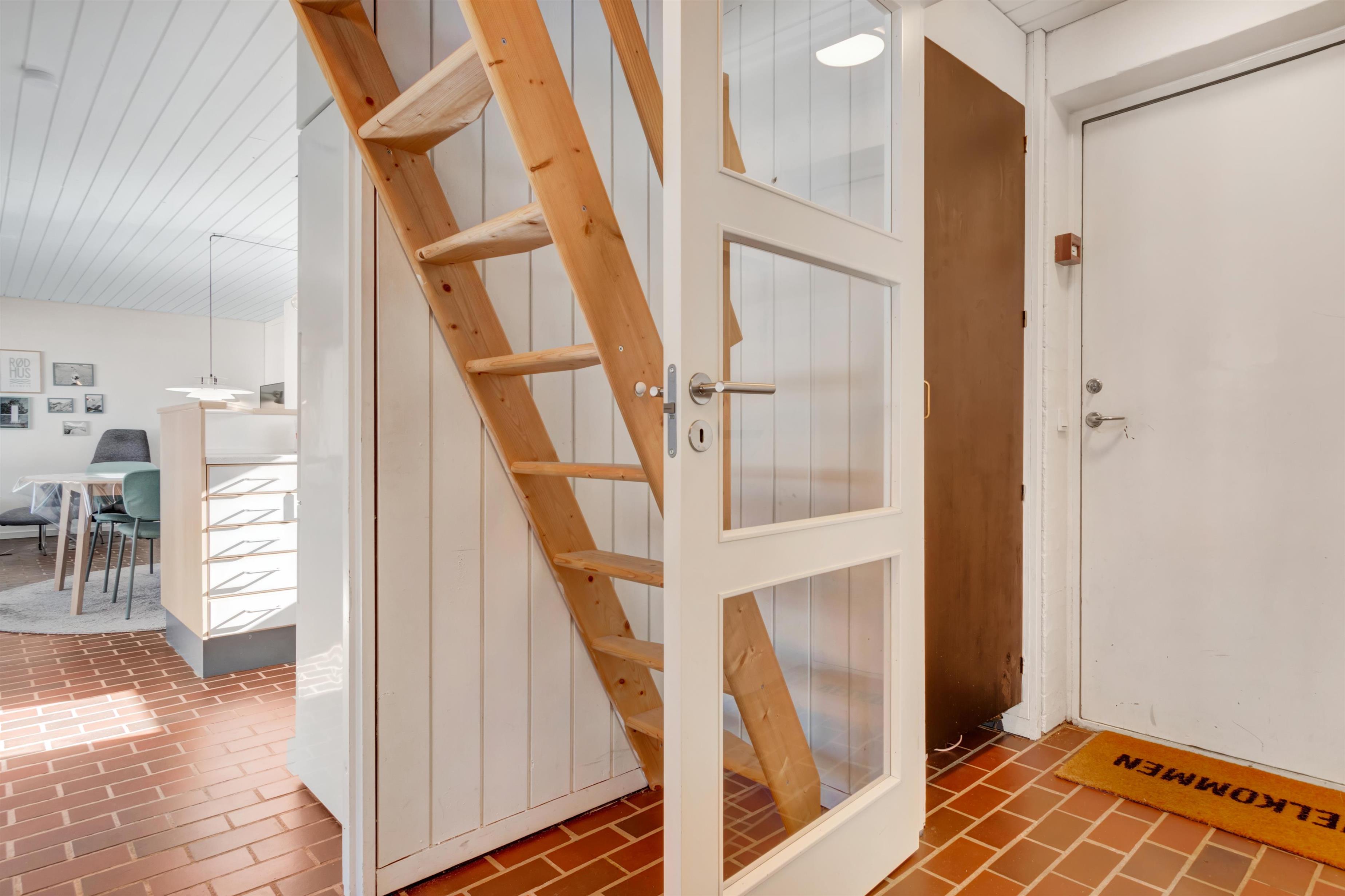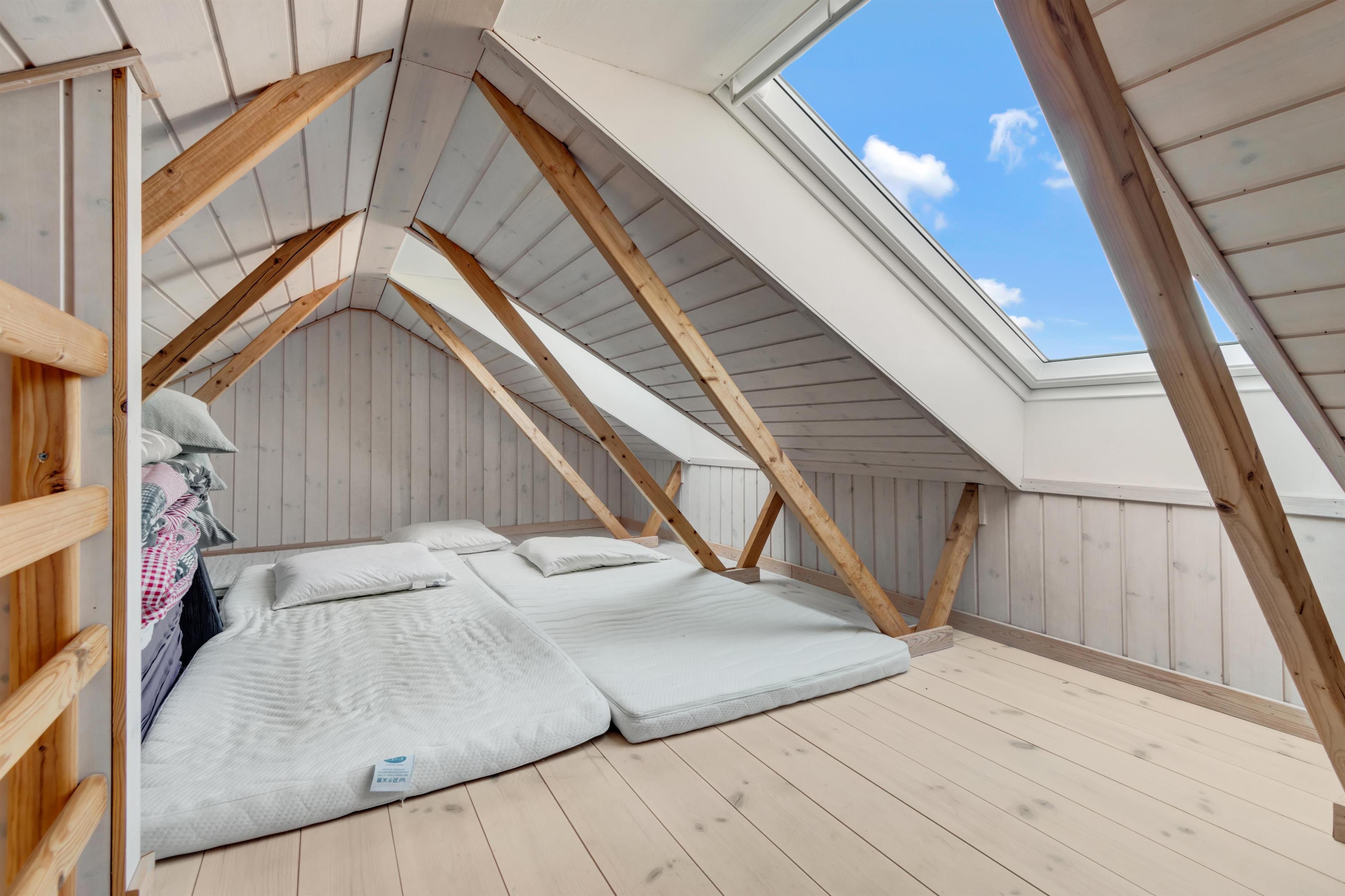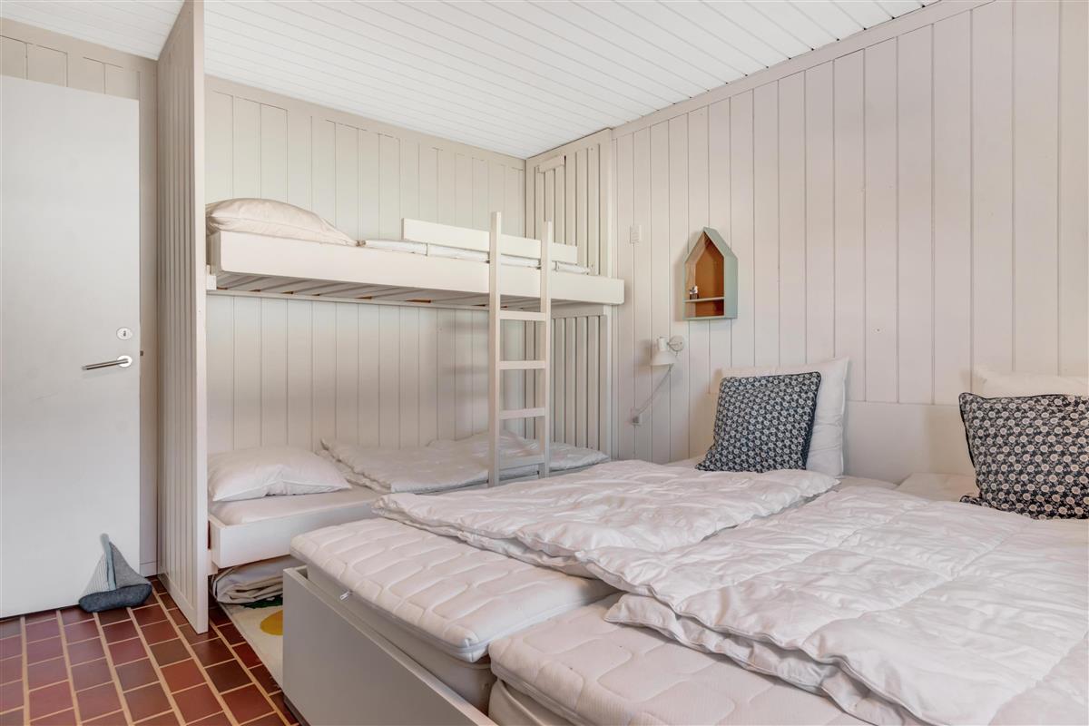 When you enter the front door, there is an entrance for jackets, shoes, and the like. From there, you enter a small hallway where the summer house's bathroom and one bedroom with both bunk and double beds are located on the left. To the right, there is a staircase up to the large and bright loft with windows and the possibility of extra sleeping places.