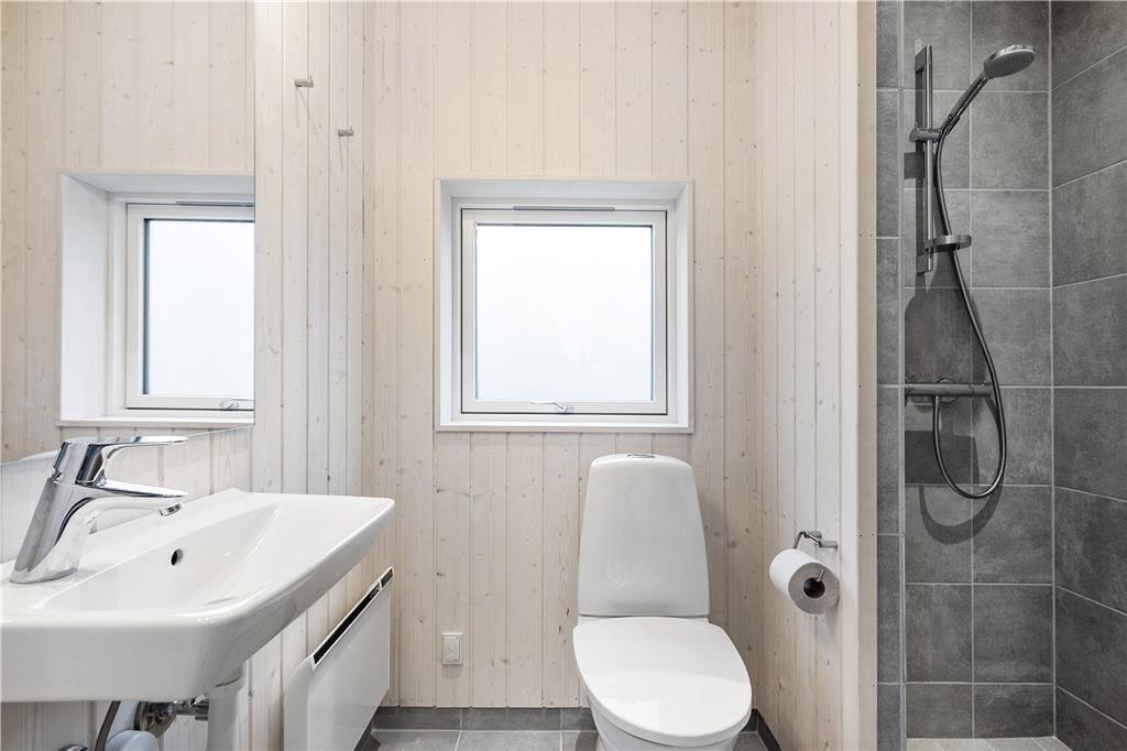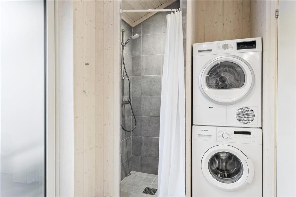1 tolles, großes Badezimmer mit einer Duschnische, einer Toilette, einem Waschbecken, einer Waschmaschine, einem Wäschetrockner und einem Ausgang auf die Westterrasse.
