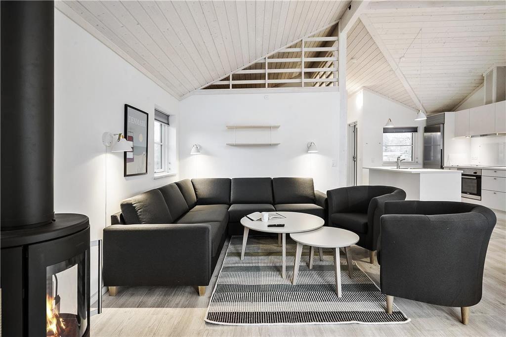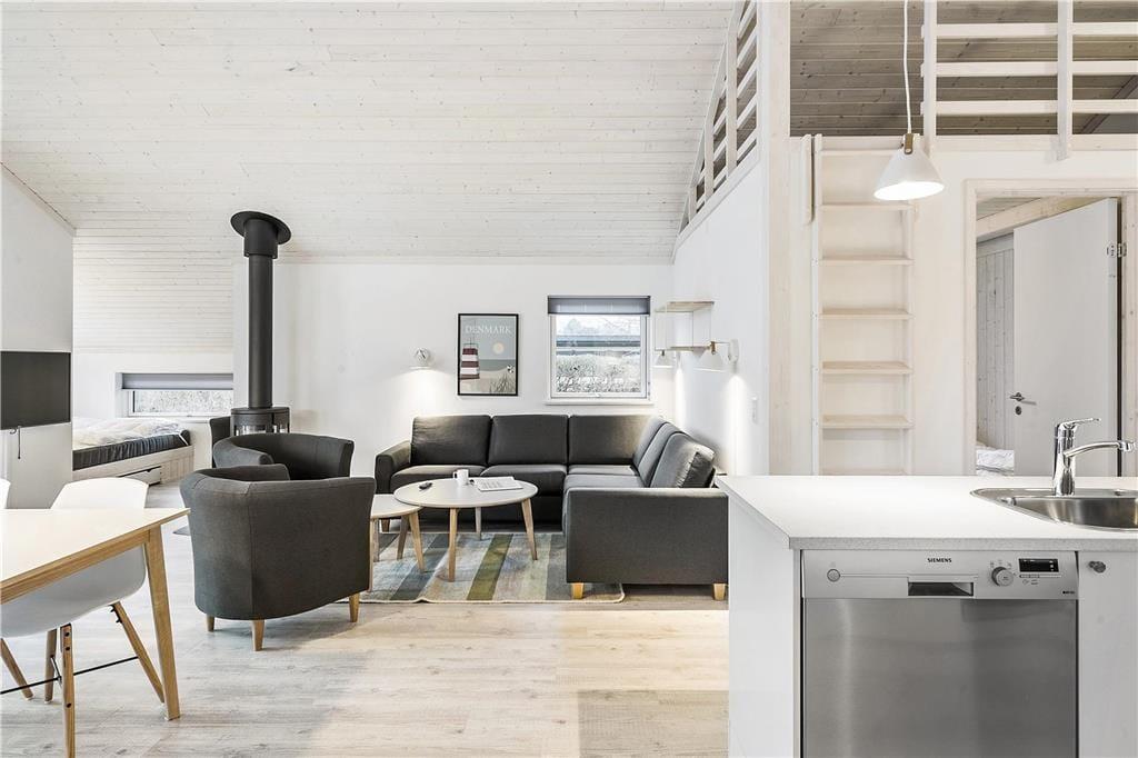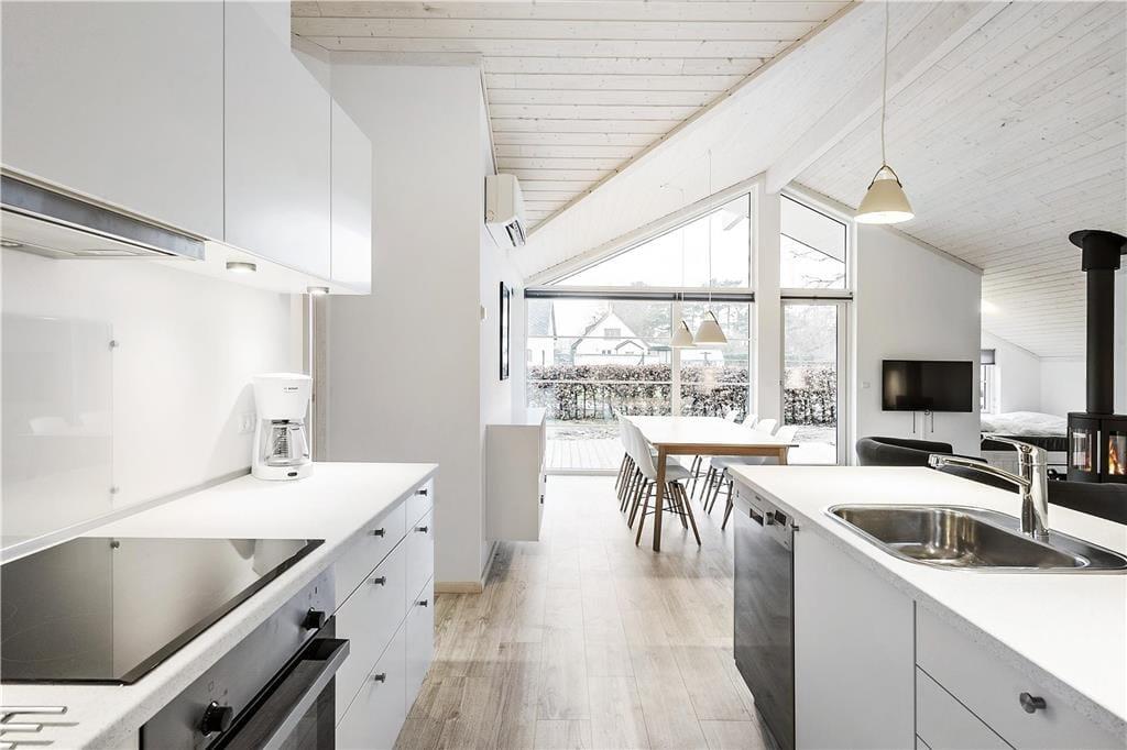 Im Inneren erwartet Sie eine attraktive Küche, die eine offene und harmonische Kombination mit dem gemütlichen Wohnbereich bildet. Die Küche beinhaltet vier Cerankochplatten, einen Backofen, einen Dunstabzug, einen Kühl- und Gefrierschrank, einen Geschirrspüler, eine Kaffeemaschine, einen Wasserkocher und sämtliche Küchenutensilien.
