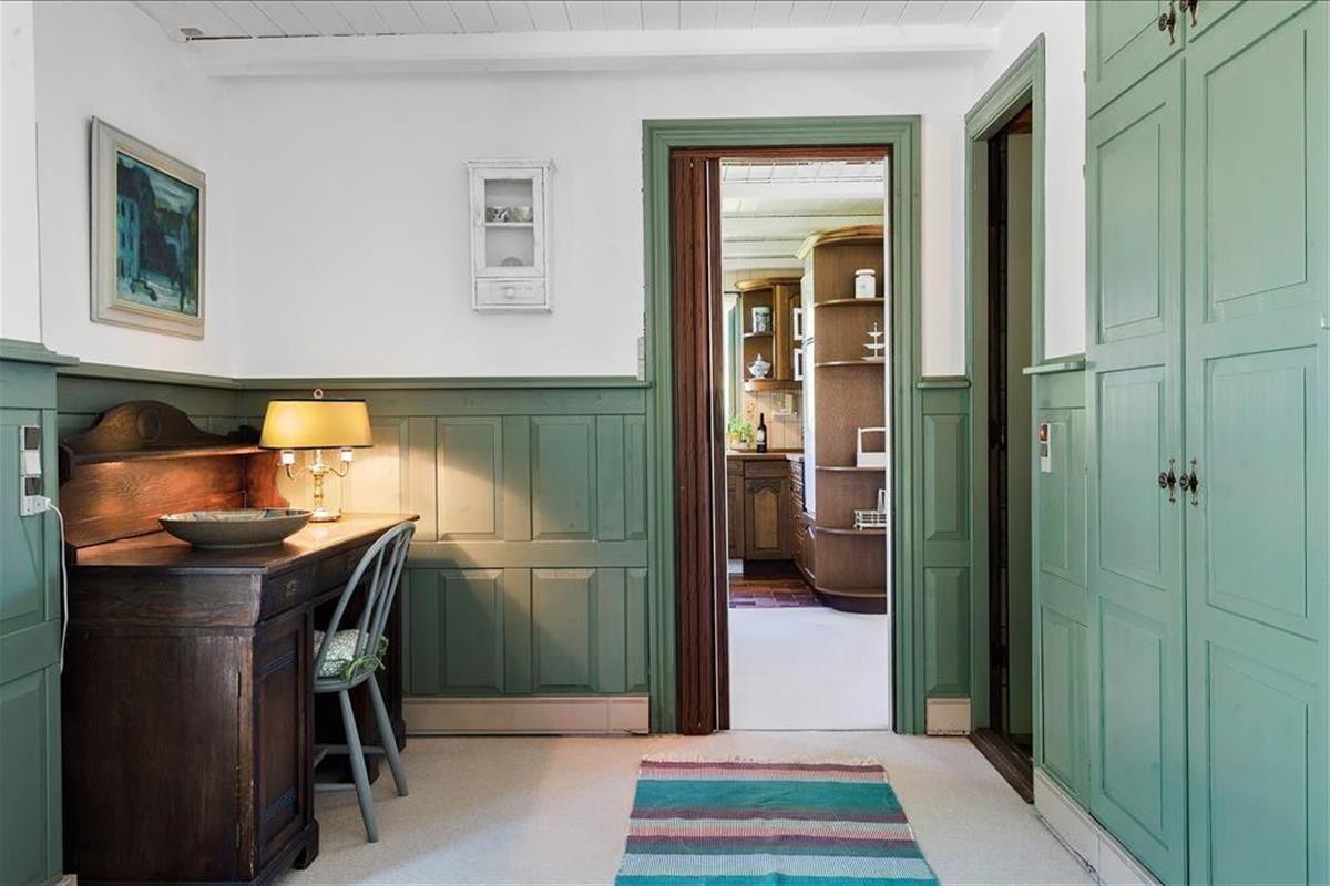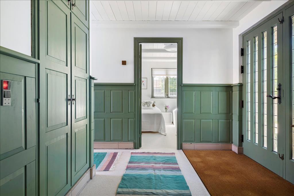 Sie betreten das Haus durch den schönen, großzügigen Eingangsbereich, der durch halbhohe Holzvertäfelungen an den Wänden geprägt wird.