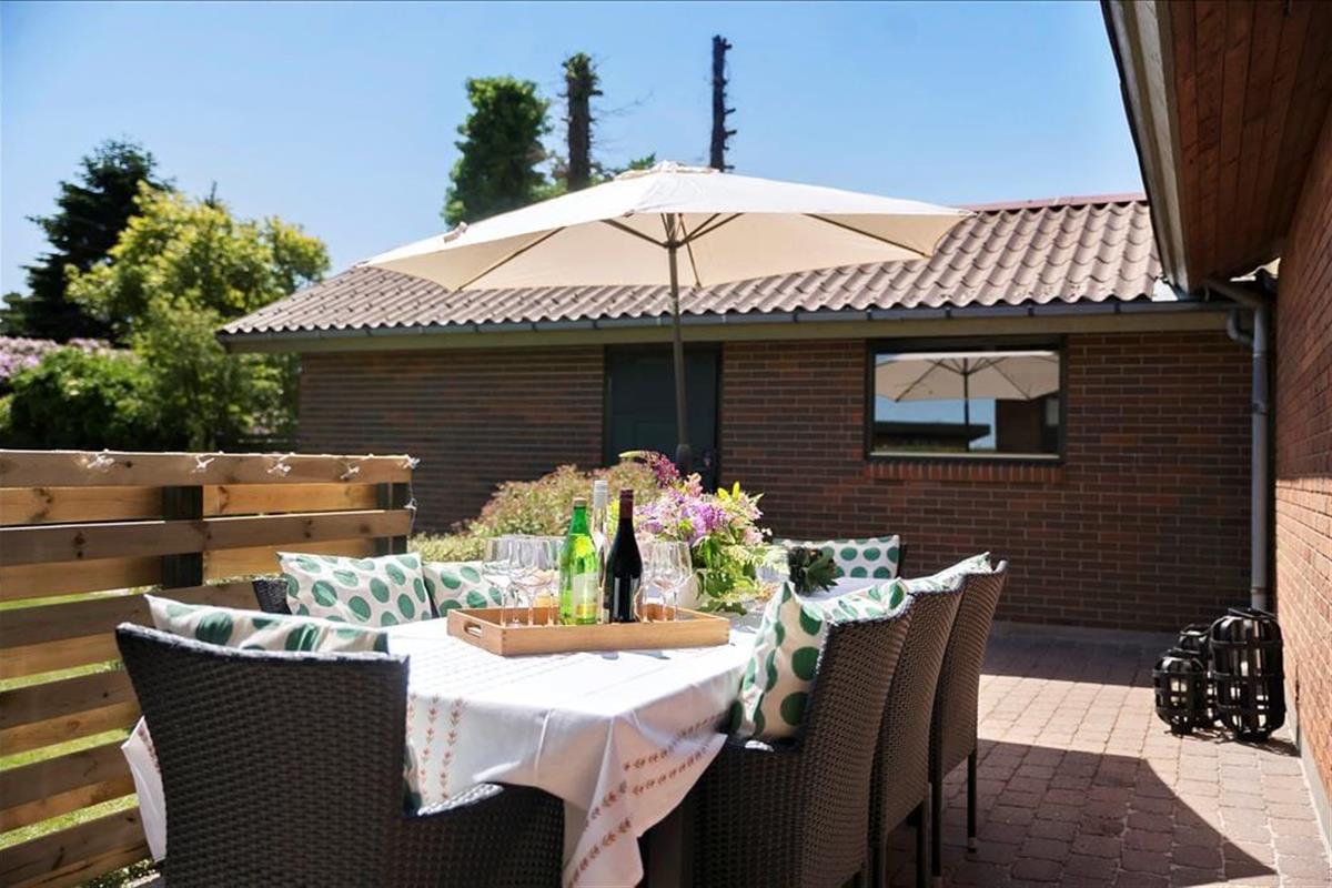 Vom Eingangsbereich gelangen Sie direkt hinaus auf die Steinterrasse, auf der Gartenmöbel für Sie bereit stehen.