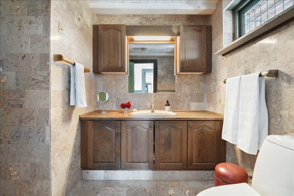 Das große, ansprechende Badezimmer umfasst eine Duschnische, ein WC und ein Handwaschbecken.