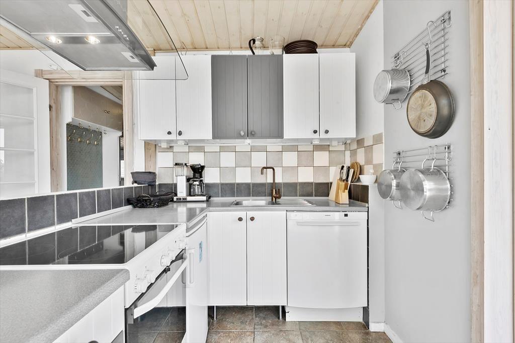 Schöne Küche in offener Verbindung zum Wohnzimmer. In der Küche gibt es einen Elektroherd mit Backofen, einen Kühlschrank mit Gefrierfach, sowie einen Geschirrspüler, eine Kaffeemaschine, einen Wasserkocher und sämtliches Geschirr und Küchenutensilien.