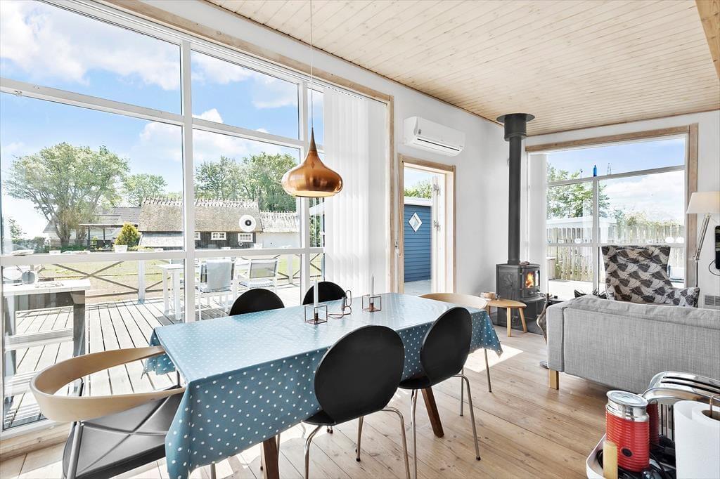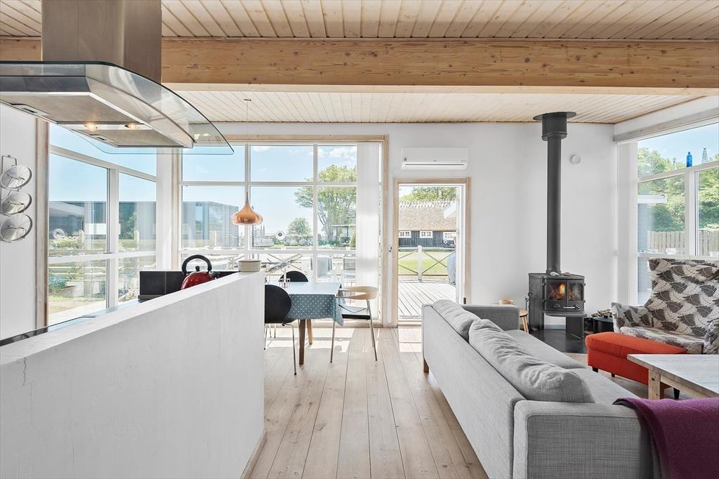 Helles Wohnzimmer (mit großen Fenstern vom Boden bis zur Decke), vom Wohnzimmer aus hat man einen Blick auf das Wasser. Gemütliche Sofaecke und Essbereich im Wohnzimmer. Holzofen und WLAN sowie TV mit der Möglichkeit zum Internet-Streaming (Chromecast).
