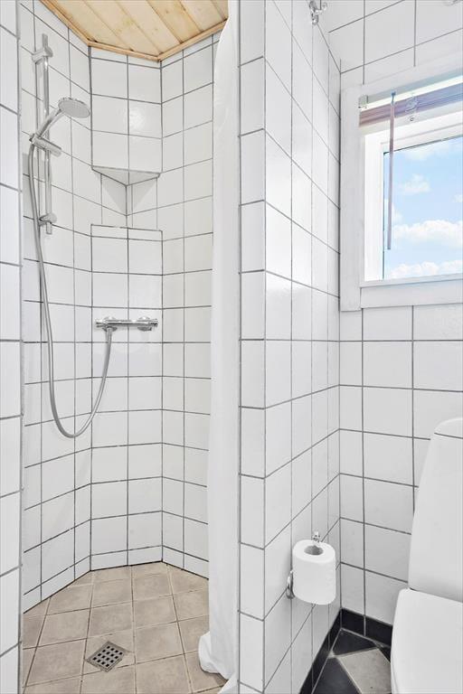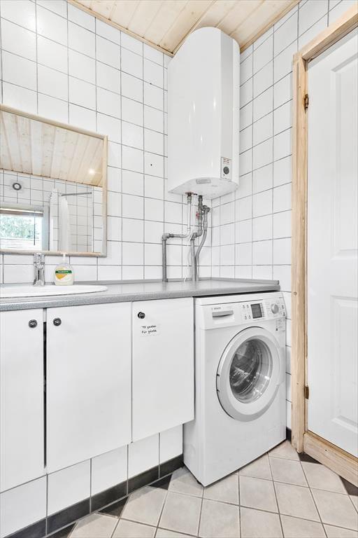 Schönes Badezimmer mit Toilette, Waschbecken und Dusche und Waschmaschine.