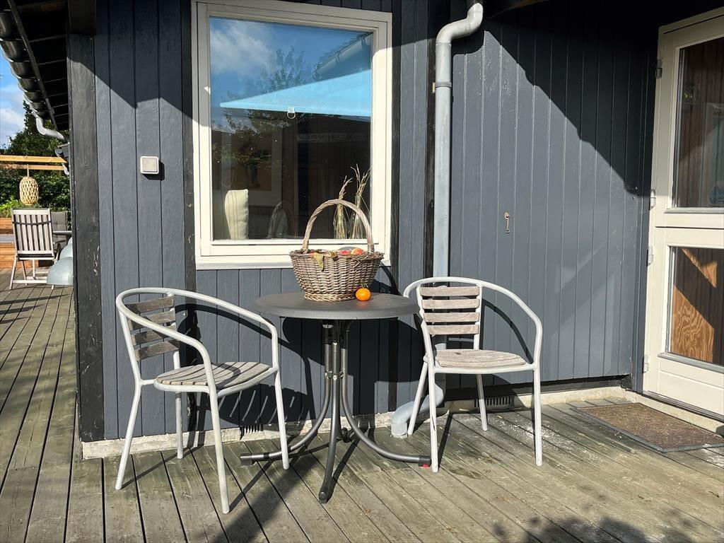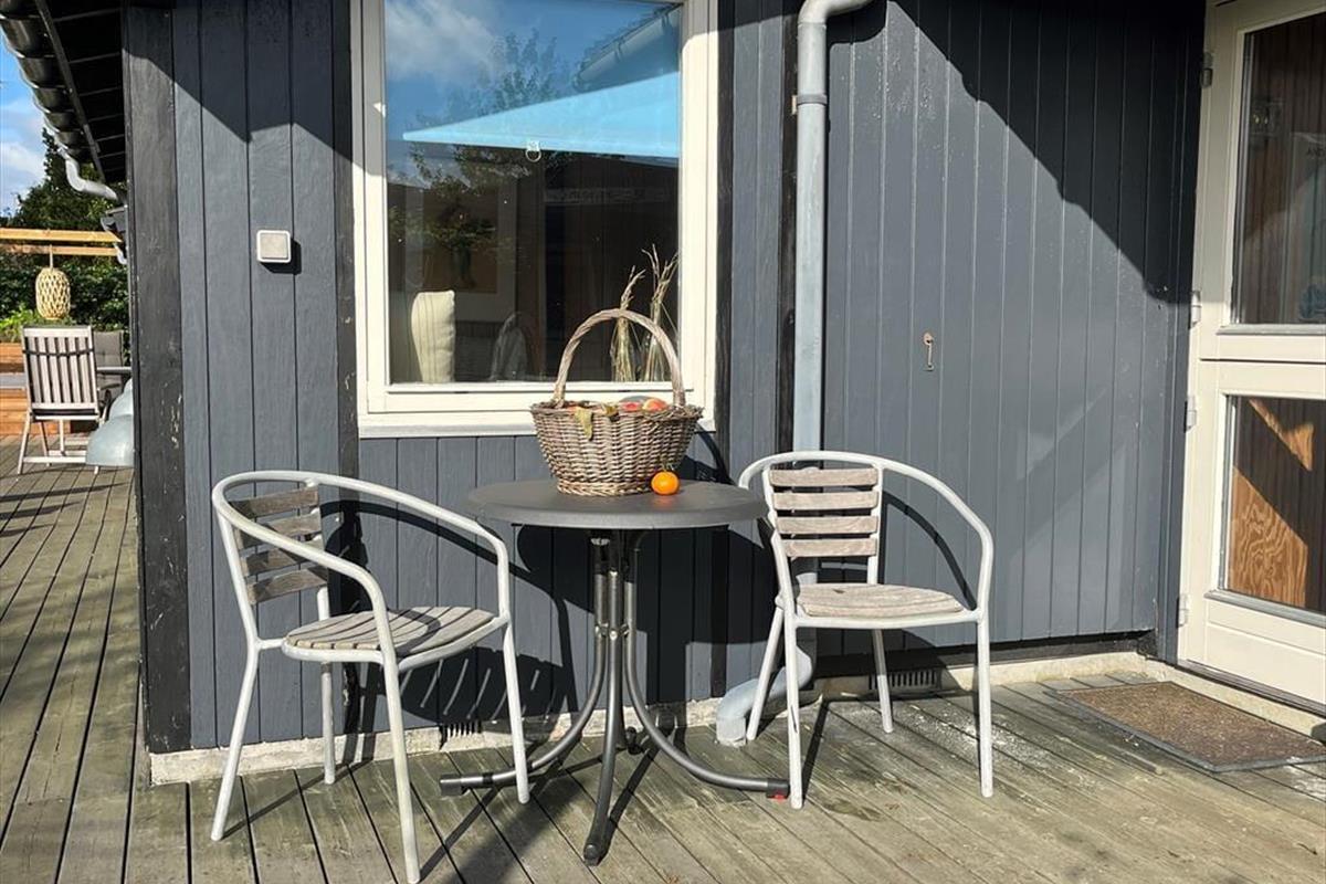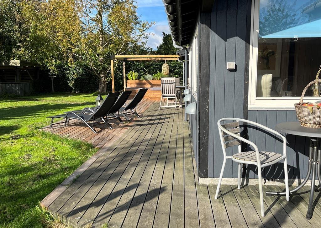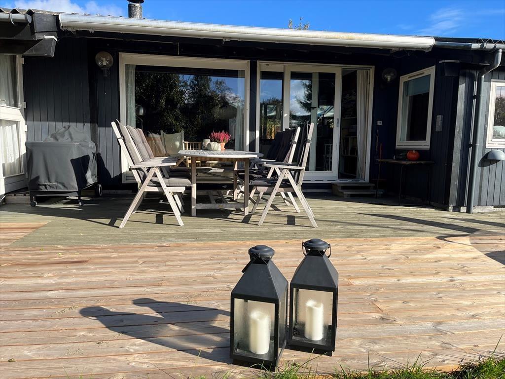 Im schönen Garten können Sie die warmen Tage und lauen Abende genießen, und hier ist die Terrasse teilweise überdacht, wo Sie sitzen können, wenn der Tau fällt. Gibt es etwas Schöneres, als dort zu sitzen und die Dunkelheit und den Frieden bei einem Glas Wein oder einer guten Tasse Tee oder Kaffee zu genießen? Hier finden Sie Raum für Gemütlichkeit, Entspannung und Naturerlebnisse. Vom Haus aus haben Sie nur 150 Meter bis zum Wasser und einem guten Strand.
