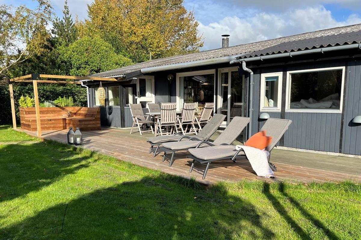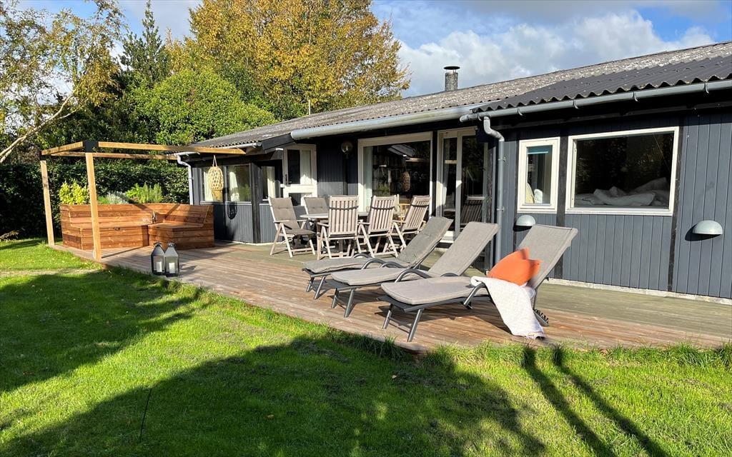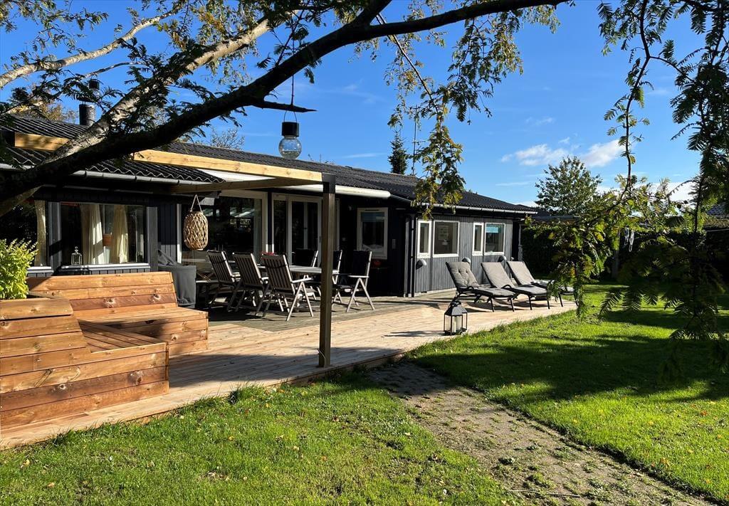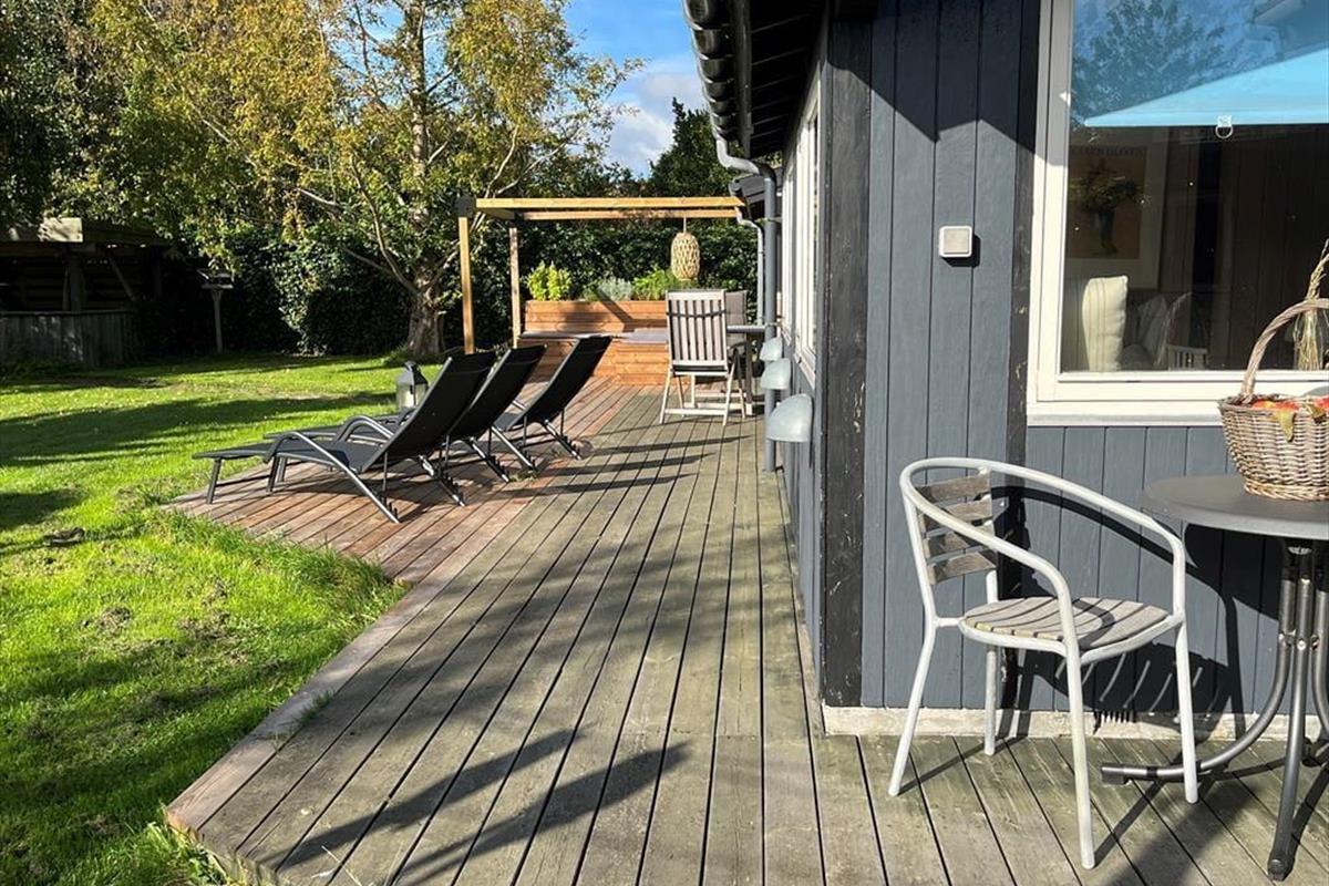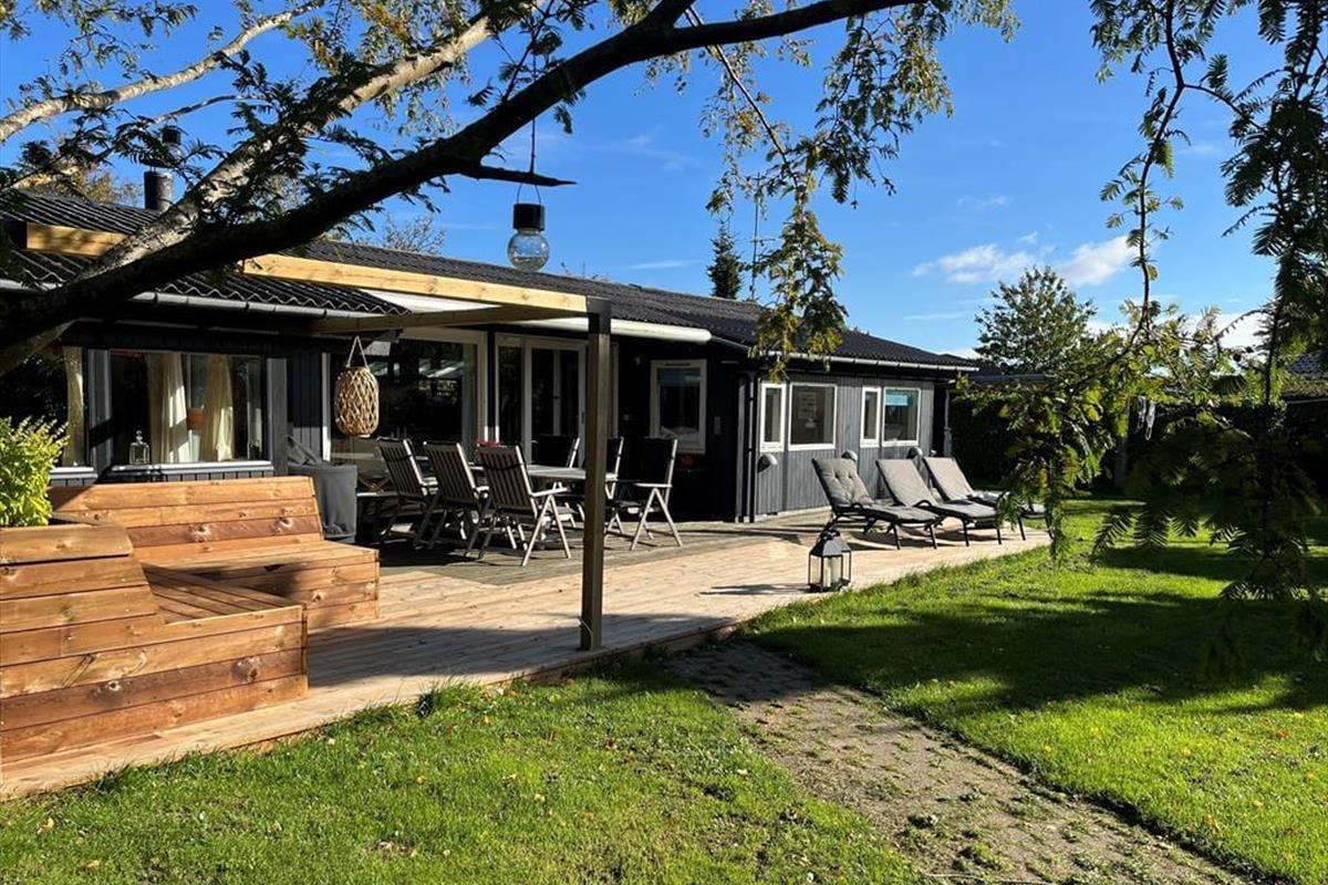 Im schönen Garten können Sie die warmen Tage und lauen Abende genießen, und hier ist die Terrasse teilweise überdacht, wo Sie sitzen können, wenn der Tau fällt. Gibt es etwas Schöneres, als dort zu sitzen und die Dunkelheit und den Frieden bei einem Glas Wein oder einer guten Tasse Tee oder Kaffee zu genießen? Hier finden Sie Raum für Gemütlichkeit, Entspannung und Naturerlebnisse. Vom Haus aus haben Sie nur 150 Meter bis zum Wasser und einem guten Strand.