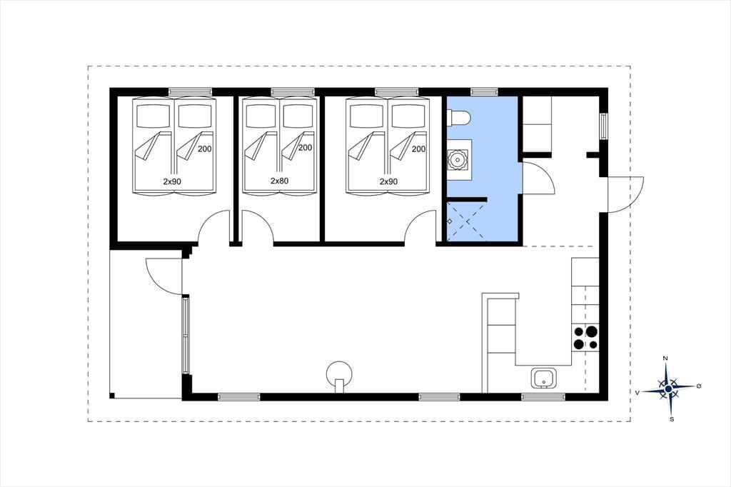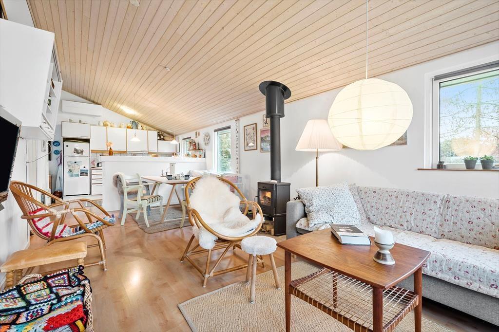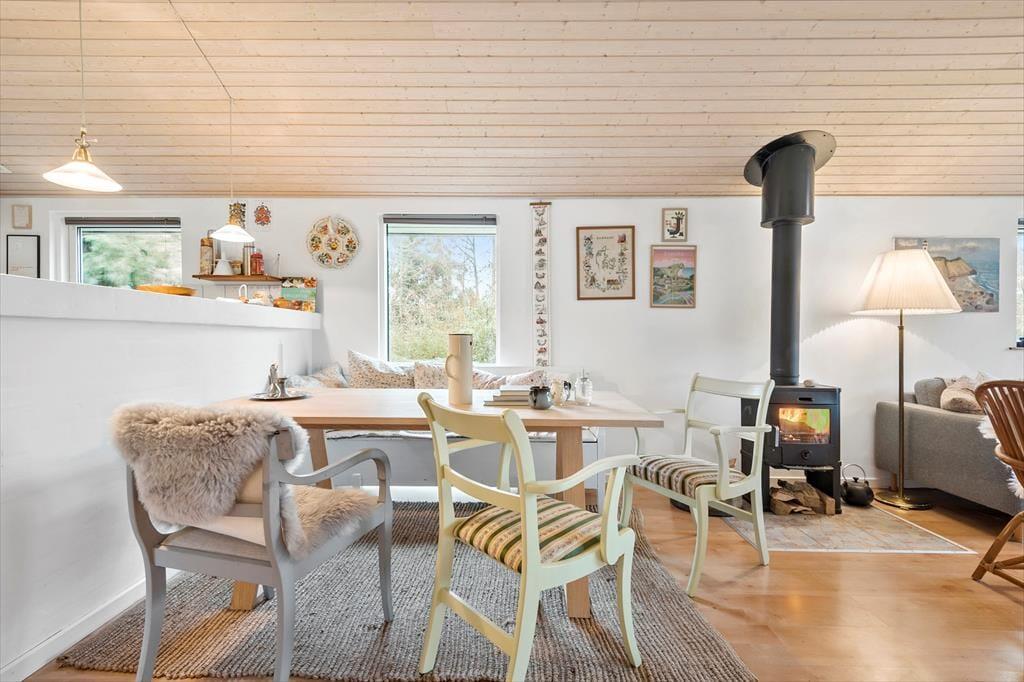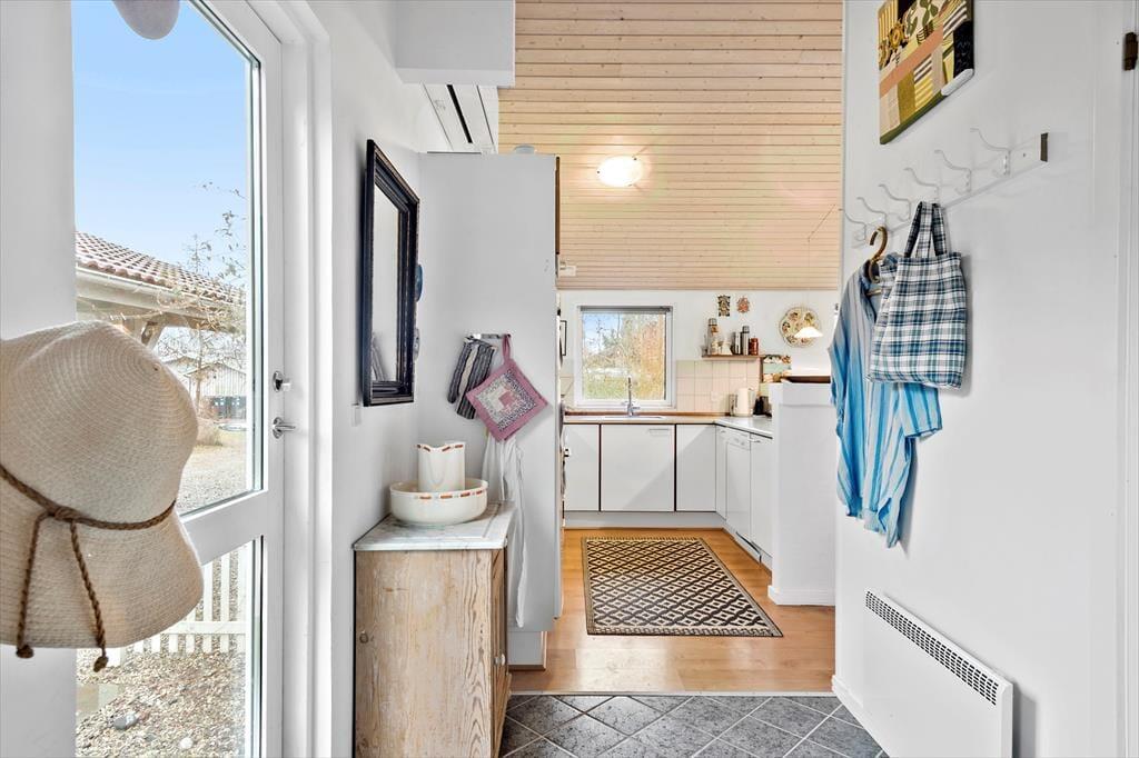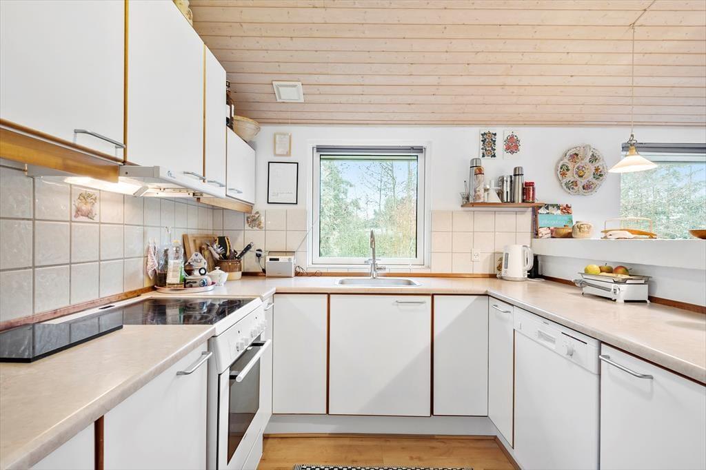 Die hinter dem Eingang platzierte Küche fügt sich offen in den Wohnraum ein. Die Küche ist ausgestattet mit Kochherd mit vier Kochplatten, Backofen, Kaffeemaschine, Wasserkocher, Geschirrspüler, Dunstabzug und Kühlschrank mit Gefriermöglichkeit. Vor der Küche lädt ein gemütlicher Essplatz mit einer schönen Sitzbank zu geselligen Runden ein.