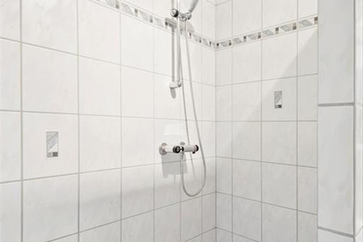 Von dort gelangen Sie in das ansprechenden Badezimmer mit einer Duschnische, einem WC und einem Waschbecken.