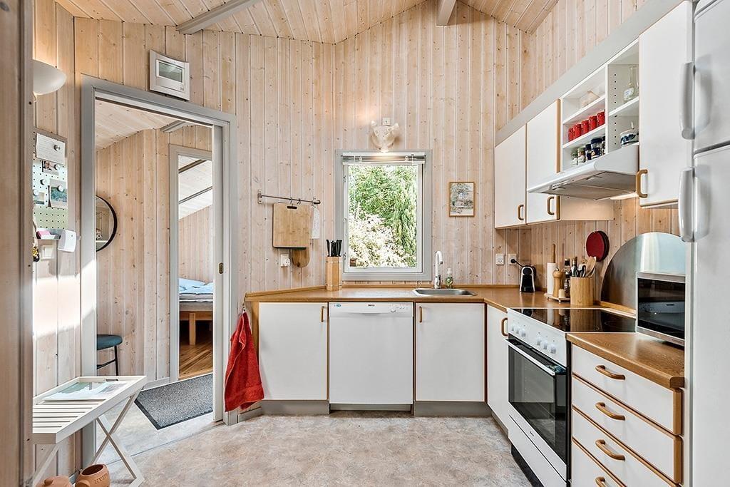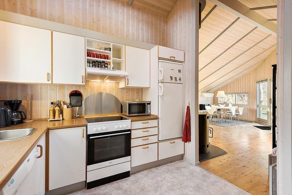 Das Haus empfängt Sie mit einem Eingangsbereich und einer ansprechenden Küche, in der ein Geschirrspüler, ein Herd mit Backofen, eine Mikrowelle, ein Kühl- und Gefrierschrank sowie eine Kaffeemaschine und ein Wasserkocher bereit stehen.