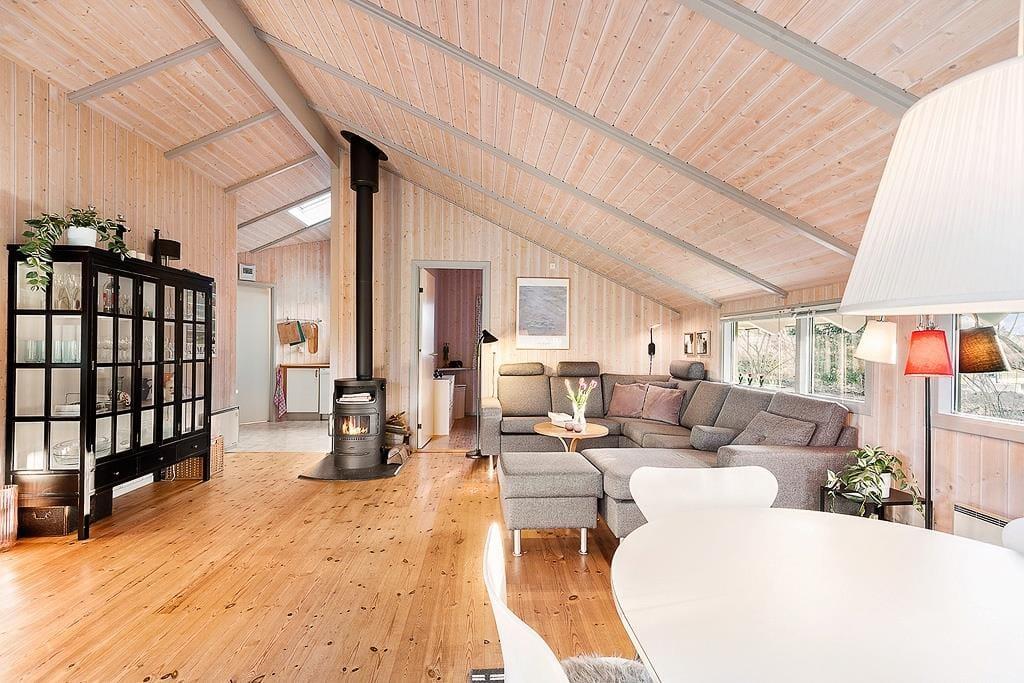 Ein großes Sofa, ein Fernseher, WiFi sowie Wärmepumpe und ein Kaminofen laden im schönen Wohnraum zu gemütlichen, entspannten Stunden ein. Vom Wohnraum gelangen Sie hinaus auf eine schöne, teilweise überdachte Holzterrasse mit Gartenmöbeln.