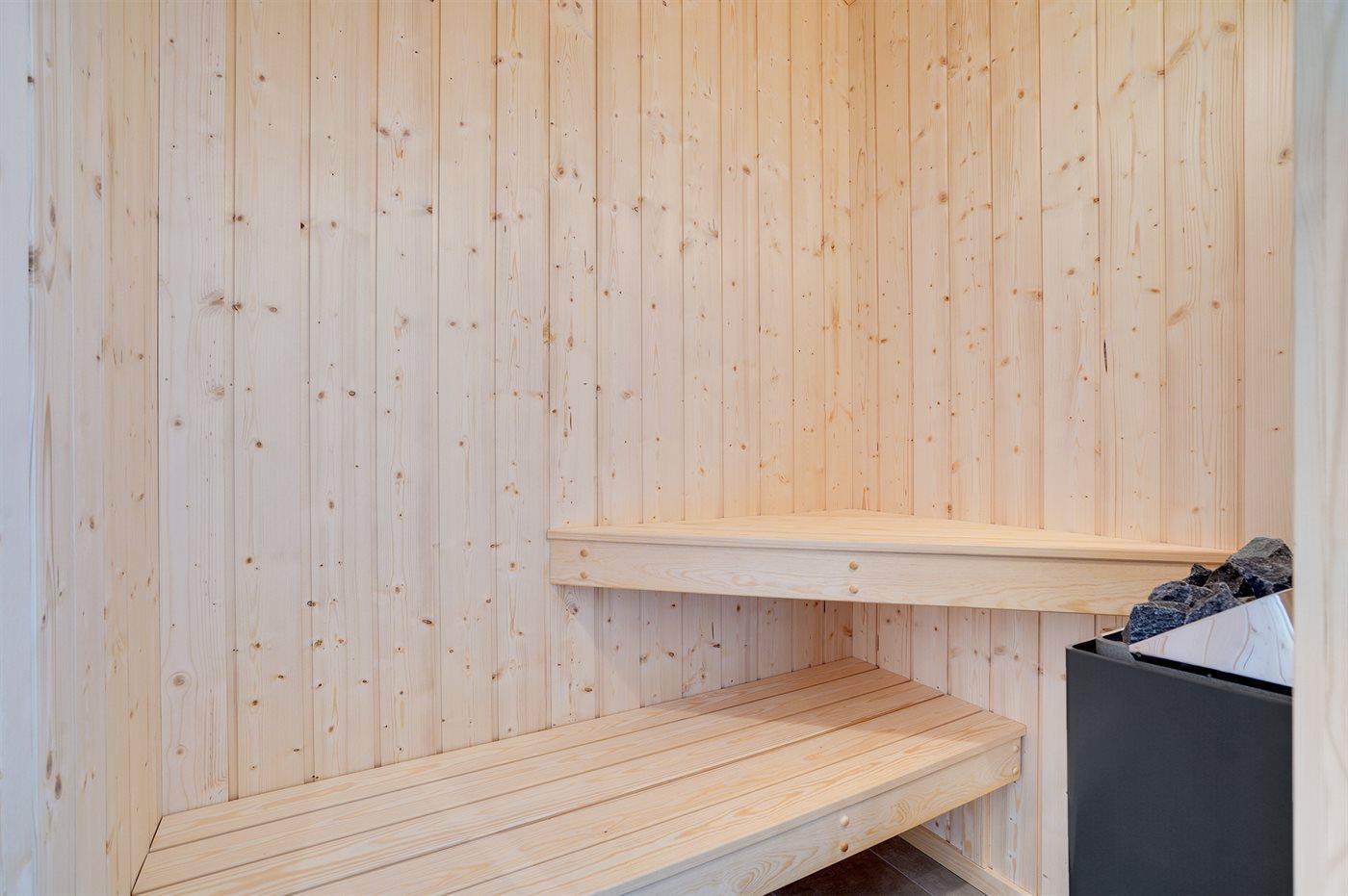 Er is 2 badkamers met douchehok en 2 toiletten. Er is vloerverwarming in 2 van de badkamers. De sauna biedt de gelegenheid tot ontspanning.