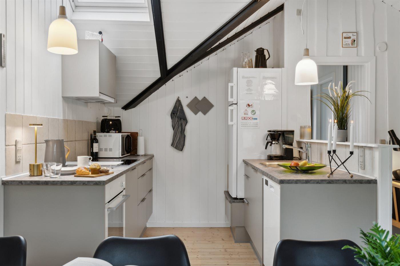 De keuken is uitgerust met koelkast Er zijn 4 keramische kookplaten, heteluchtoven, magnetron en vaatwasser.