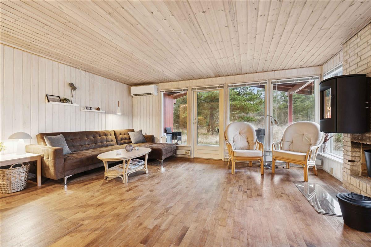 Vakantiehuis voor vijf personen met open indeling, houtkachel en drie slaapkamers. Afgesloten terras en groot natuurperceel met privacy. Dicht bij de Waddenzee, de brede stranden van Rømø en routes met rijk vogelleven.