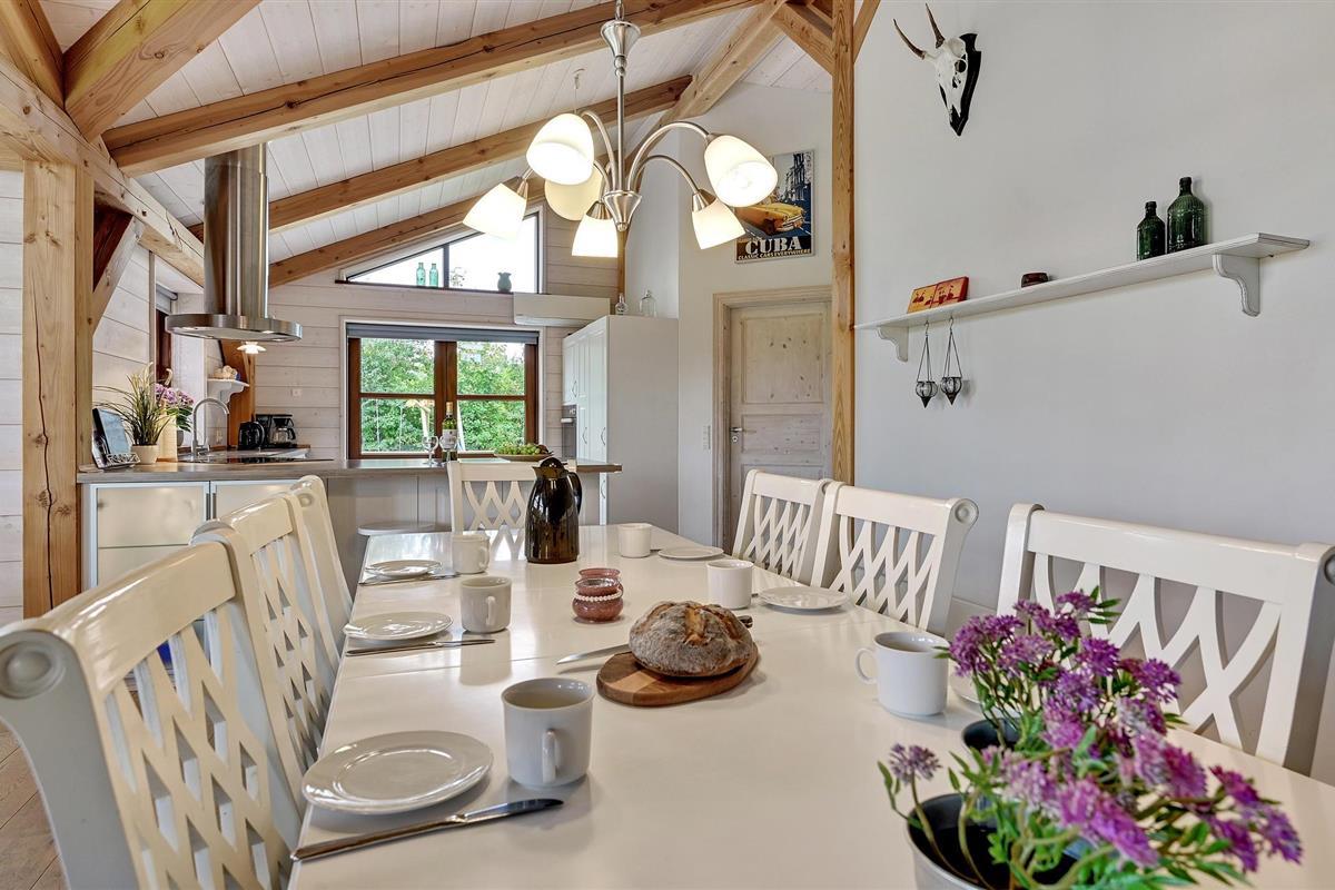Modern vakantiehuis met ruime keuken, dicht bij vismeer, sauna en bubbelbad voor ontspanning.