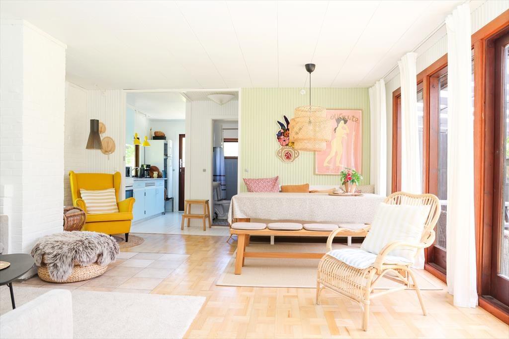 Das Ferienhaus beinhaltet eine offene Küche. Der helle Wohnraum präsentiert sich in Form eines kombinierten, stimmungsvollen Wohn- und Essbereichs, in dem Sie gemeinsam spielen und in Ruhe lesen können. Das Badezimmer mit Dusche und die beiden schönen Schlafräume bestechen mit "Badehotel"-Atmosphäre. Vom Wohnraum aus gelangen Sie auf eine schön überdachte Terrasse, auf der Sie herrliche Stunden im Freien verleben. Das große Grundstück eignet sich zum Ballspielen und Umhertollen. Ihr Hund ist in diesem Ferienhaus herzlich willkommen.
