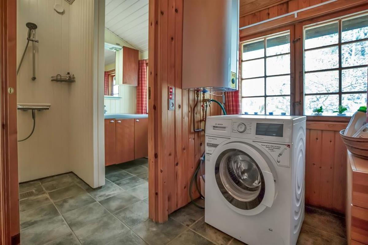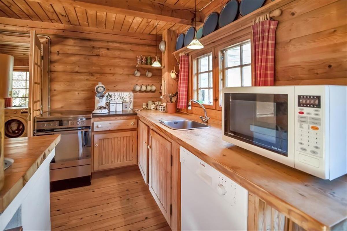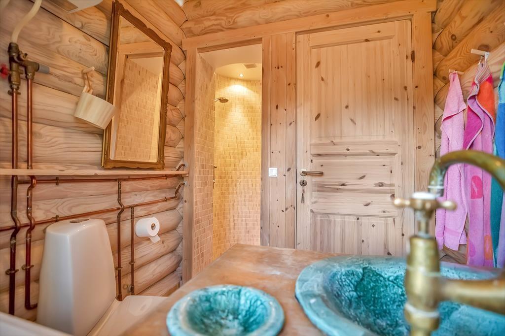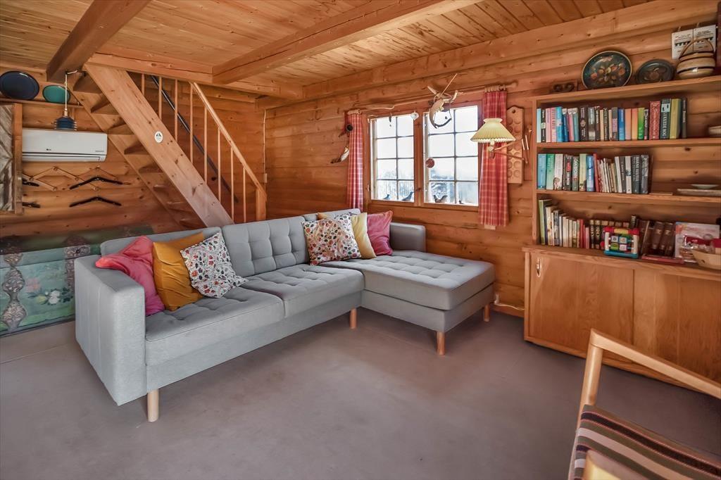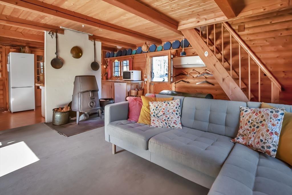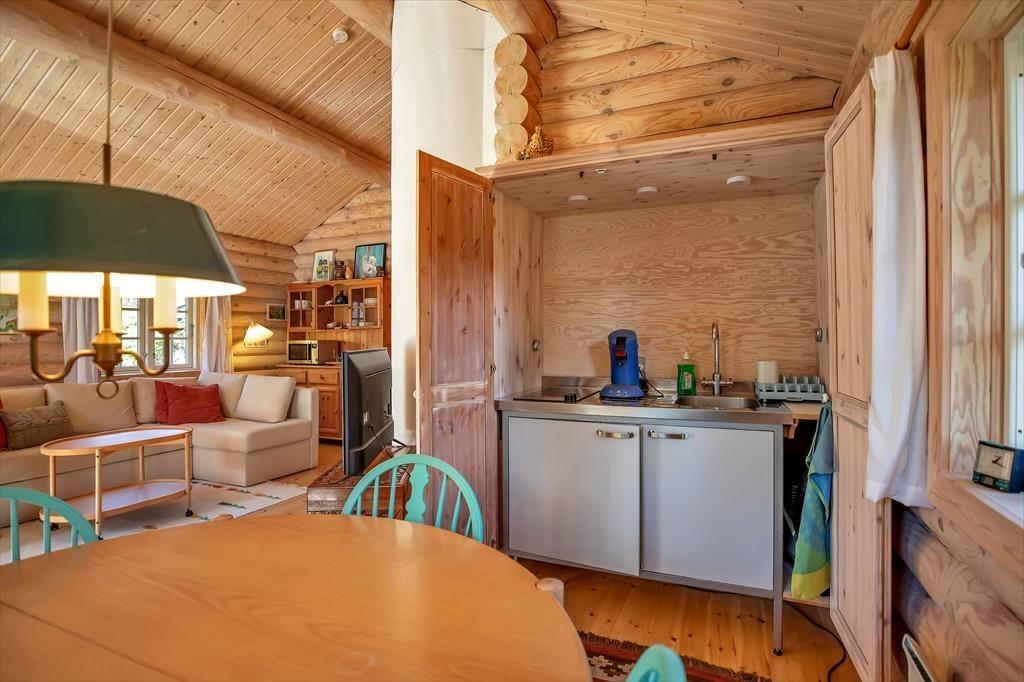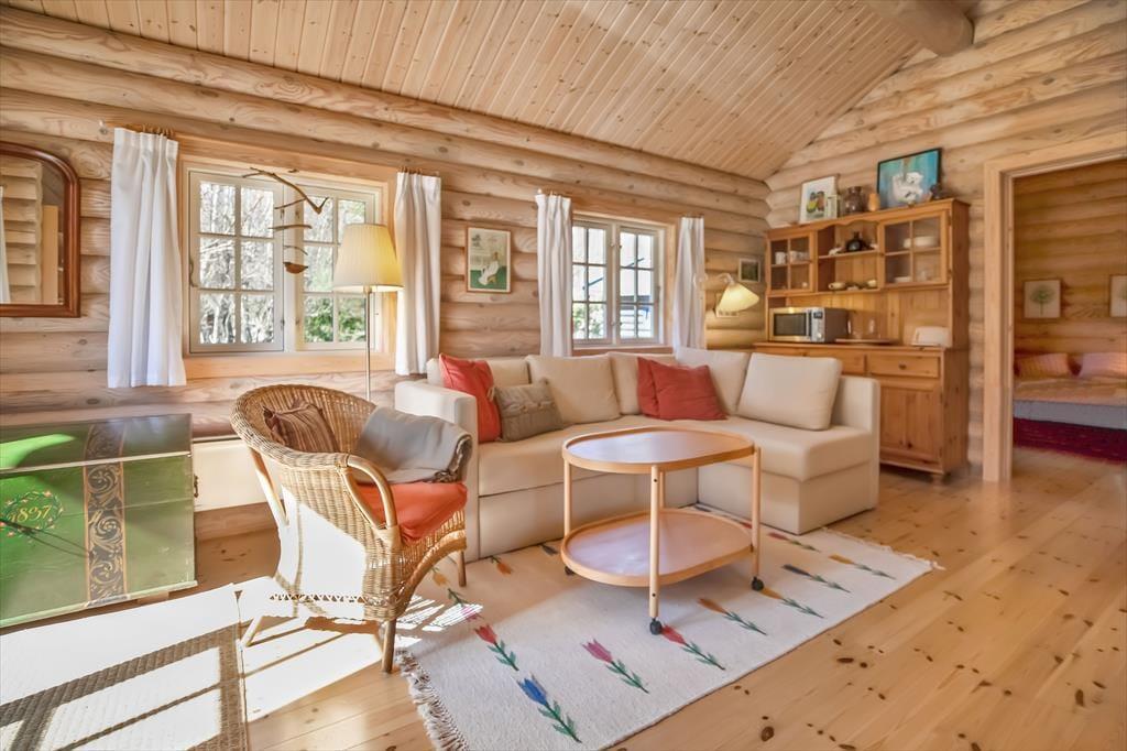 Das Haupthaus Staburet ist, wie es im Namen liegt, ein altes norwegisches Blockhaus mit Sedum Vegetation auf dem Dach und ist der älteren Generation oder der einen Familie mit 2 kleinen Kindern zugedacht. Das Erdgeschoss enthält einen offenen Wohnraum mit Fernseher und eine Küche mit Essbereich für 8 Personen. Es gibt keramische Herdplatten, einen gewöhnlichen Ofen, Kombi/Mikrowellenherd und großen Tiefkühl/Kühlschrank. Einen Waschraum mit Waschmaschine sowie auch ein Badezimmer mit Dusche, Waschbecken und Toilette. Im ersten Stock finden Sie ein großes offenes Schlafzimmer mit einem Doppelbett und dazu ein Entfaltbett (90x2) für 2 Kinder plus eine Toilette mit Waschbecken. Auf der Terrasse gibt es Platz für 8 Personen, einen Außengasgrill und zugedacht dass man sich hier für die größeren Mahlzeiten sammelt.