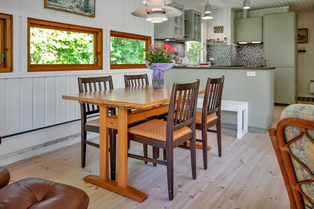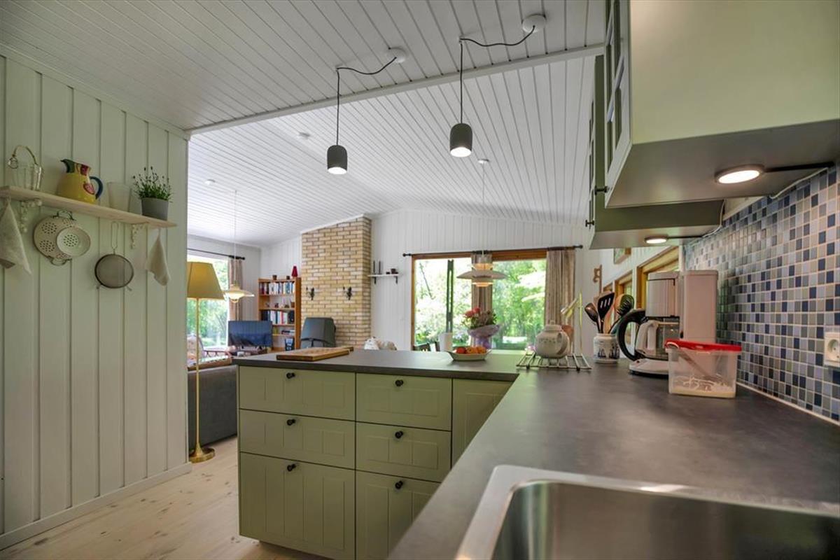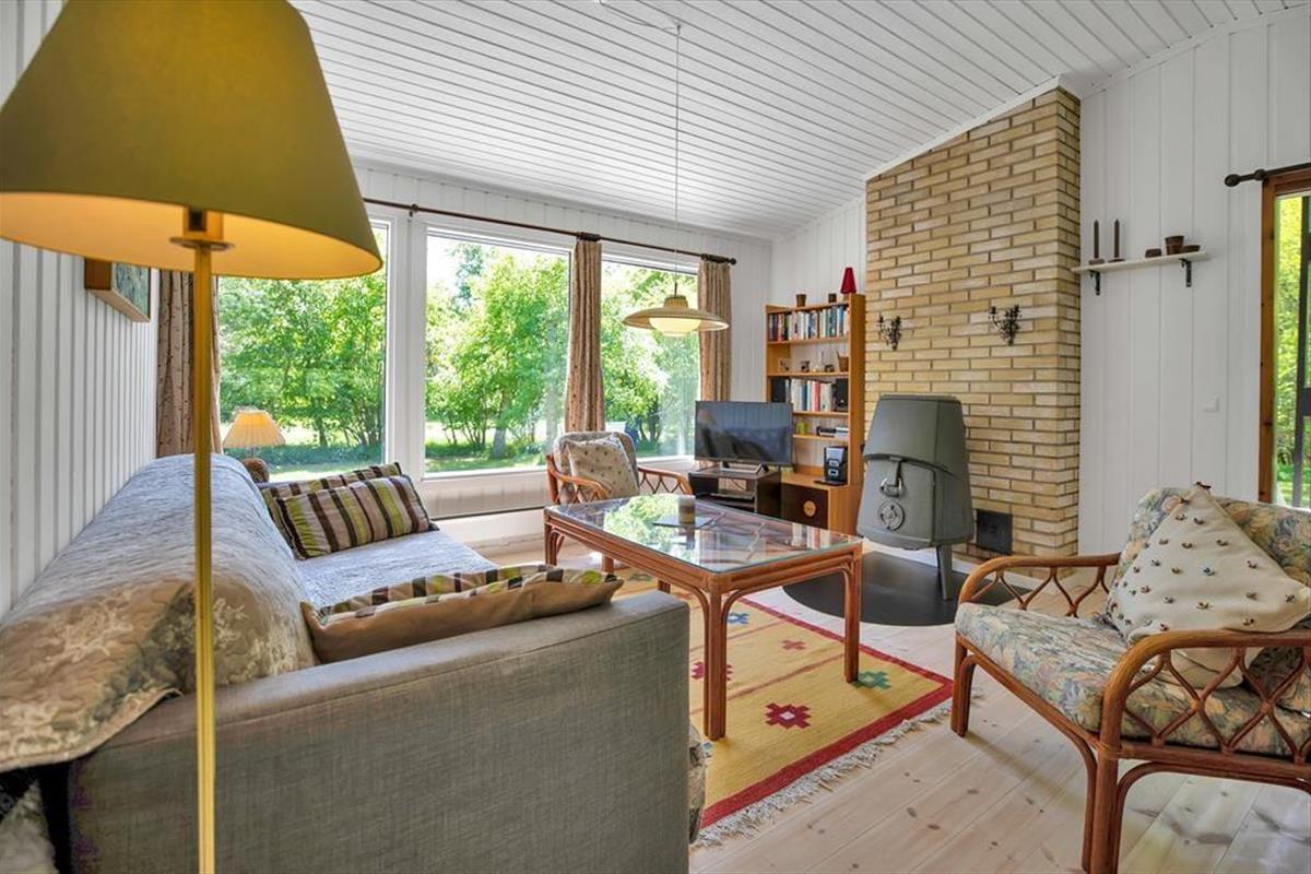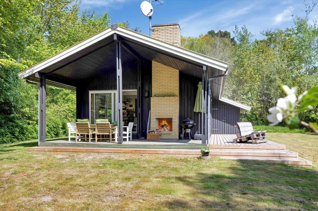 Das Haus ist mit gemütlichem Wohnraum mit Bettcouch, Holzofen und Essbereich eingerichtet. Darüber hinaus gibt es eine offene Küche und 2 Schlafzimmer mit beziehungsweise einem Doppelbett und einem Etagenbett. Badezimmer mit Dusche. Vom Wohnzimmer ab gelangen Sie auf die überdeckte Terrasse mit offenem Kamin, wo Sie die gegrillten Fische und ein Glas kaltes Weißwein und den Blick vom Garten, wo die Rehe regelmäßig kreuzen, genießen können.