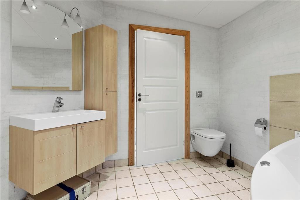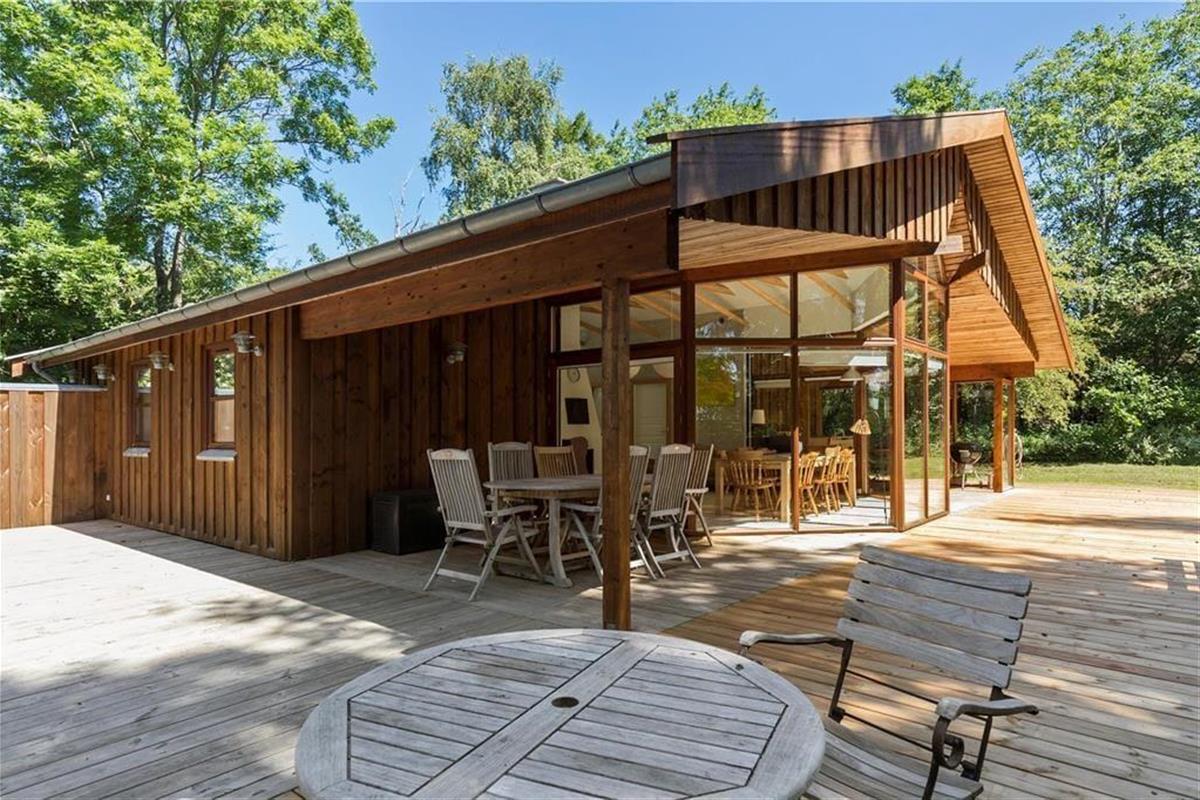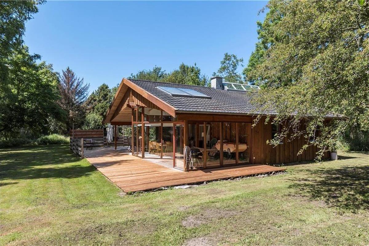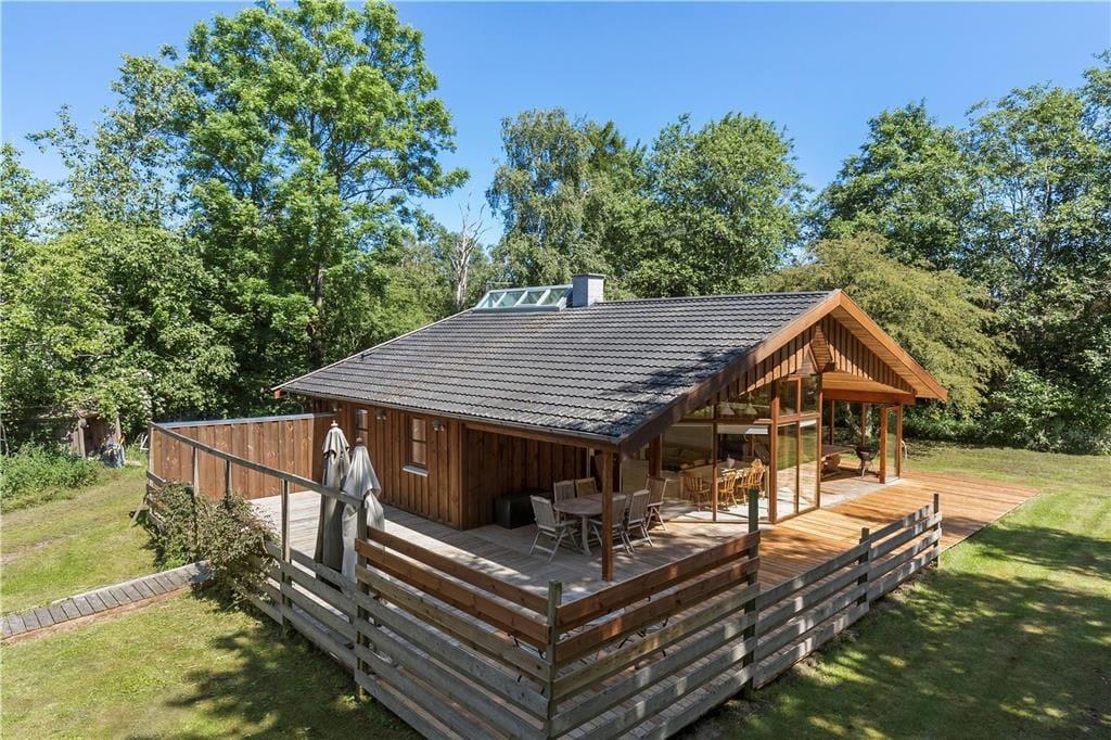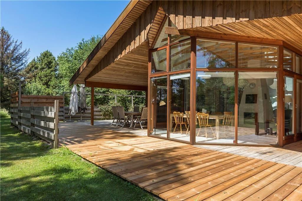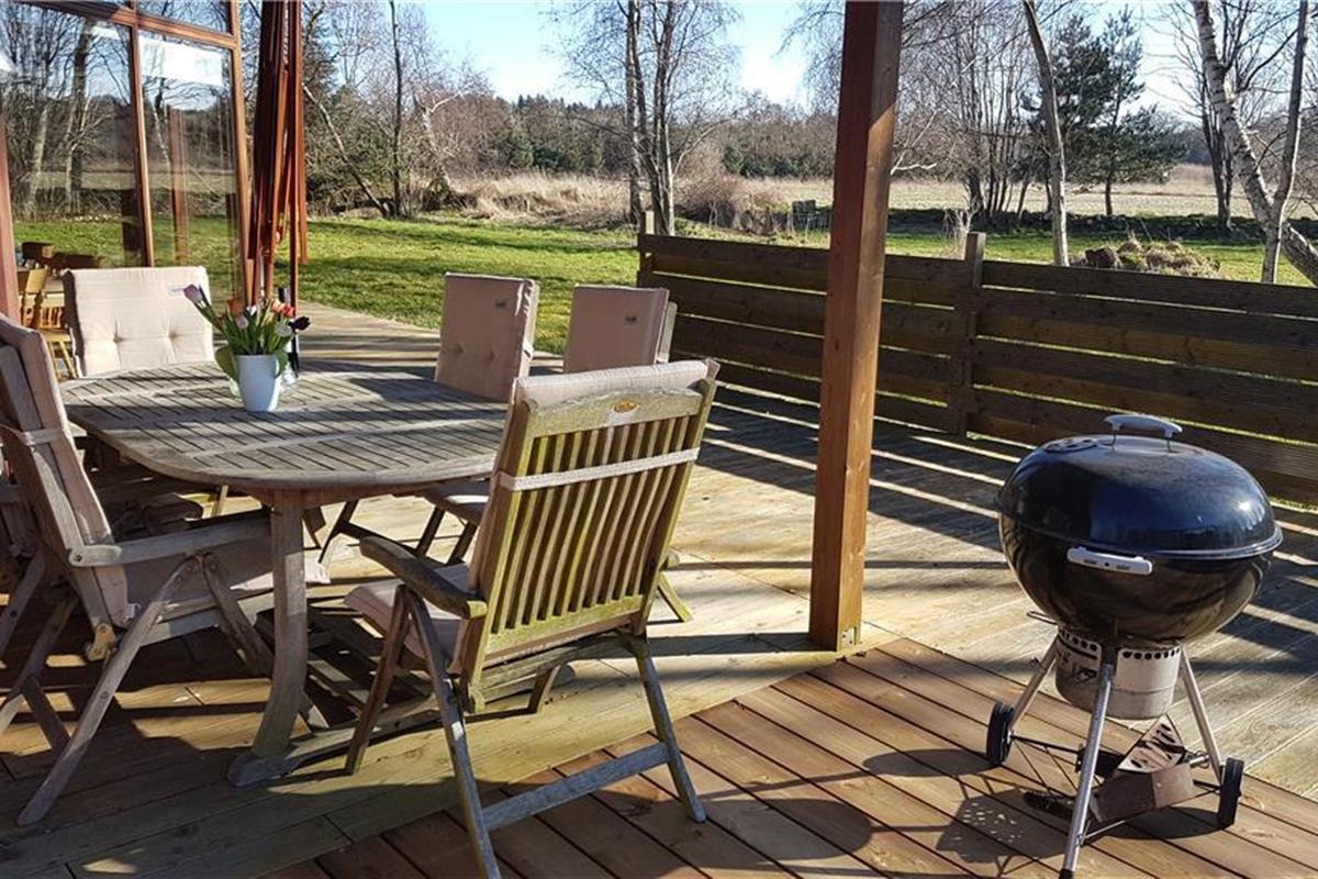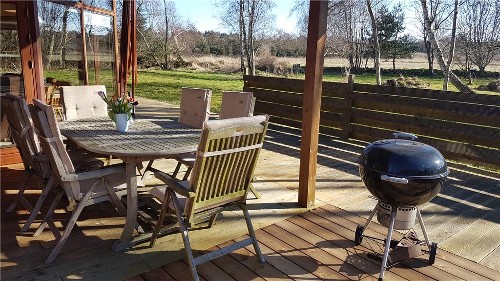 Die große Terrasse ist zu drei Seiten von einer hölzernen Umrandung umgeben. Dadurch wirst du zu jeder Zeit problemlos ein windgeschütztes Plätzchen für euer gemeinsames Frühstück, euer Mittagessen oder auch euren gemütlichen Grillabend finden. Das große Grundstück wird von Bäumen eingerahmt. Es liegt direkt an einem offenen Feld mit Tannenbäumen. Obwohl das Eckgrundstück außerdem an den öffentlichen Weg Bystedvej grenzt, ist mit keinem übermäßigen Verkehrsaufkommen zu rechnen.
