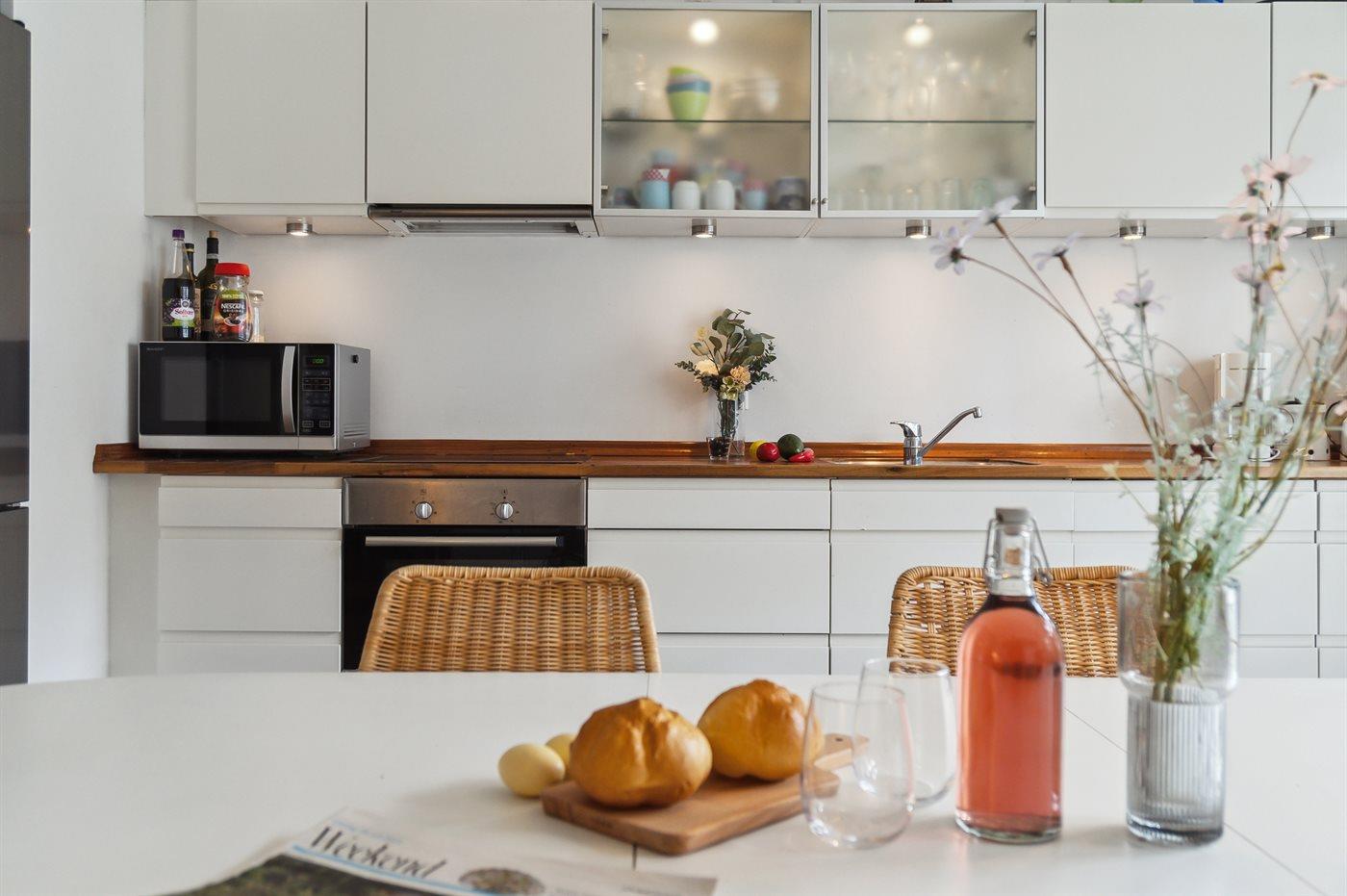 De keuken is uitgerust met koelkast Er zijn 4 keramische kookplaten, heteluchtoven en vaatwasser.