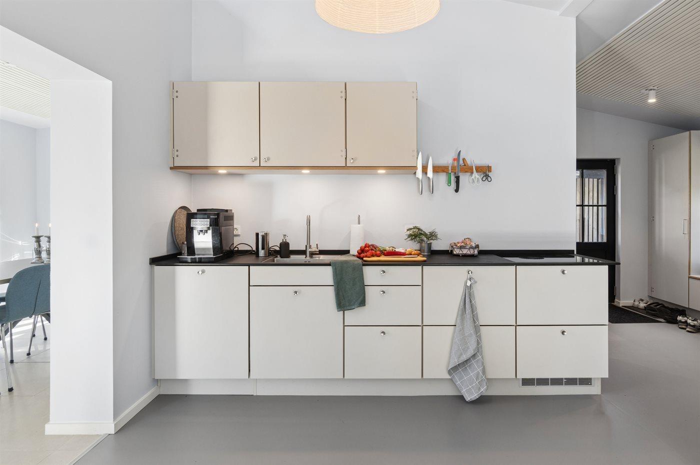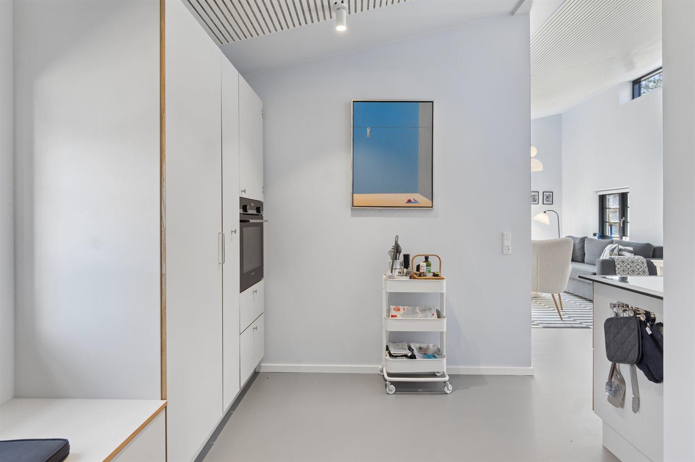 De keuken is uitgerust met koelkast Er is 4 inductiekookplaten, heteluchtoven en vaatwasser.