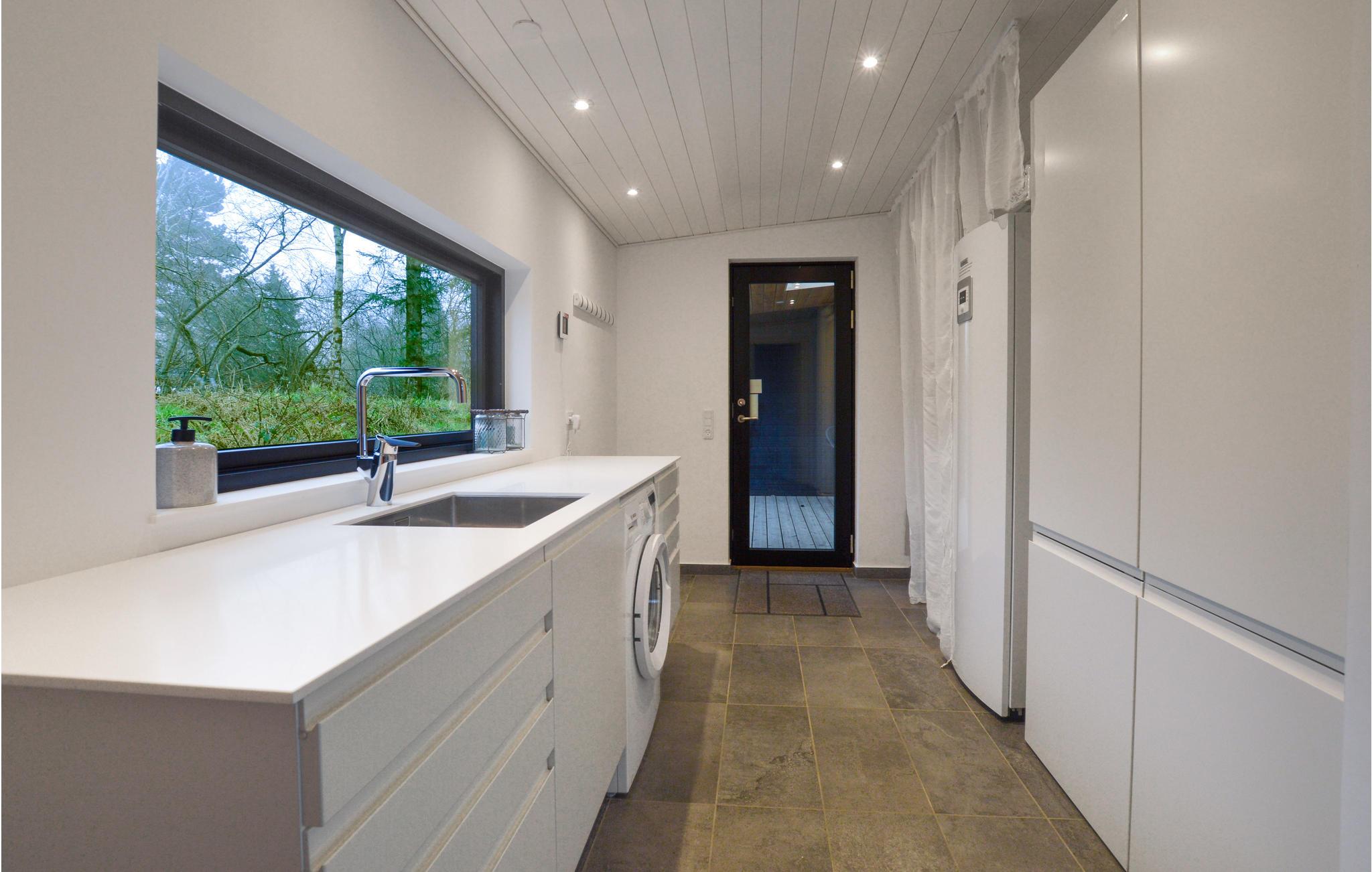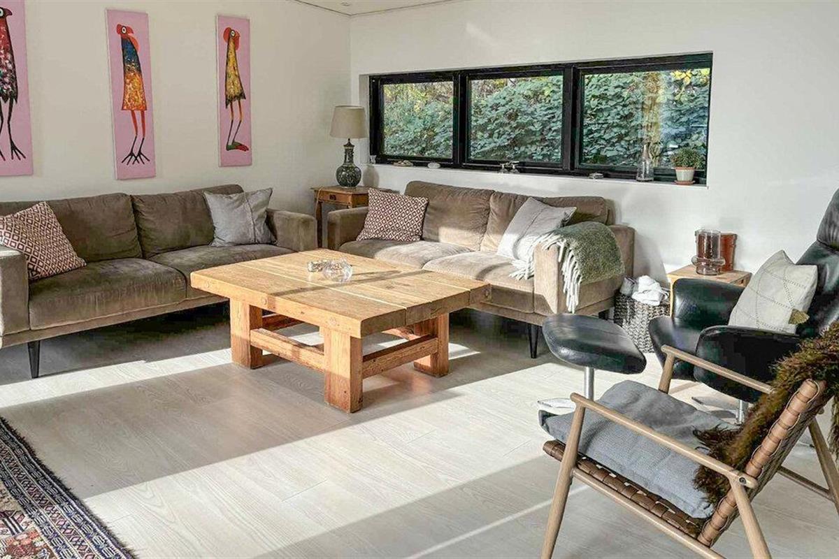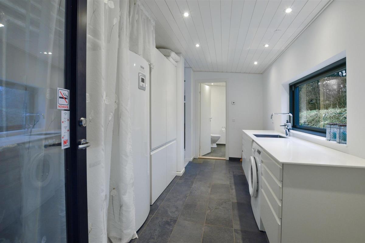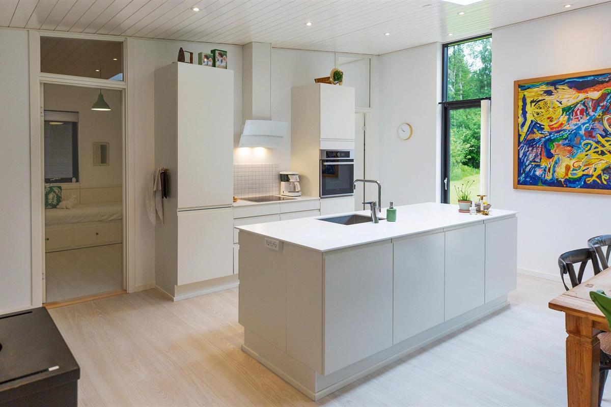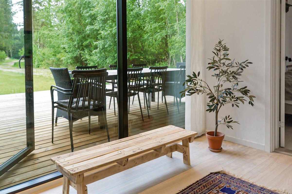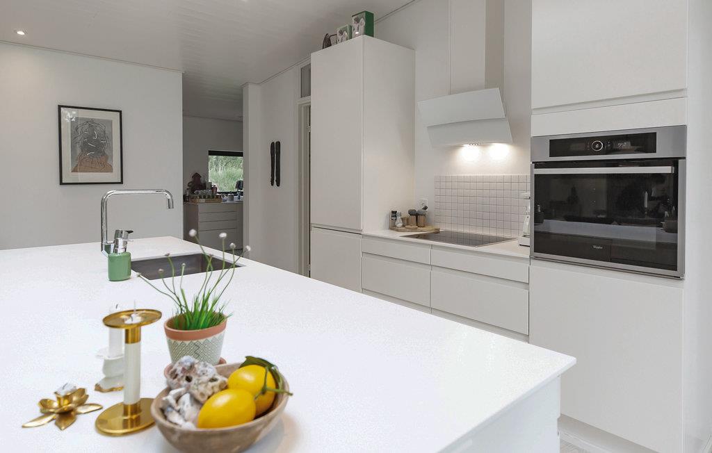 Dit prachtige vakantiehuis is geschikt voor een groot gezin. Het huis maakt een moderne, smaakvolle indruk en is licht en open. De ruime keuken-woonkamer is open en omvat een eethoek en een woongedeelte met een houtkachel. Van hieruit heeft u toegang tot het overdekte terras. In het bijgebouw, dat u via het terras bereikt, vindt u twee slaapkamers met gezellige slaapplaatsen.