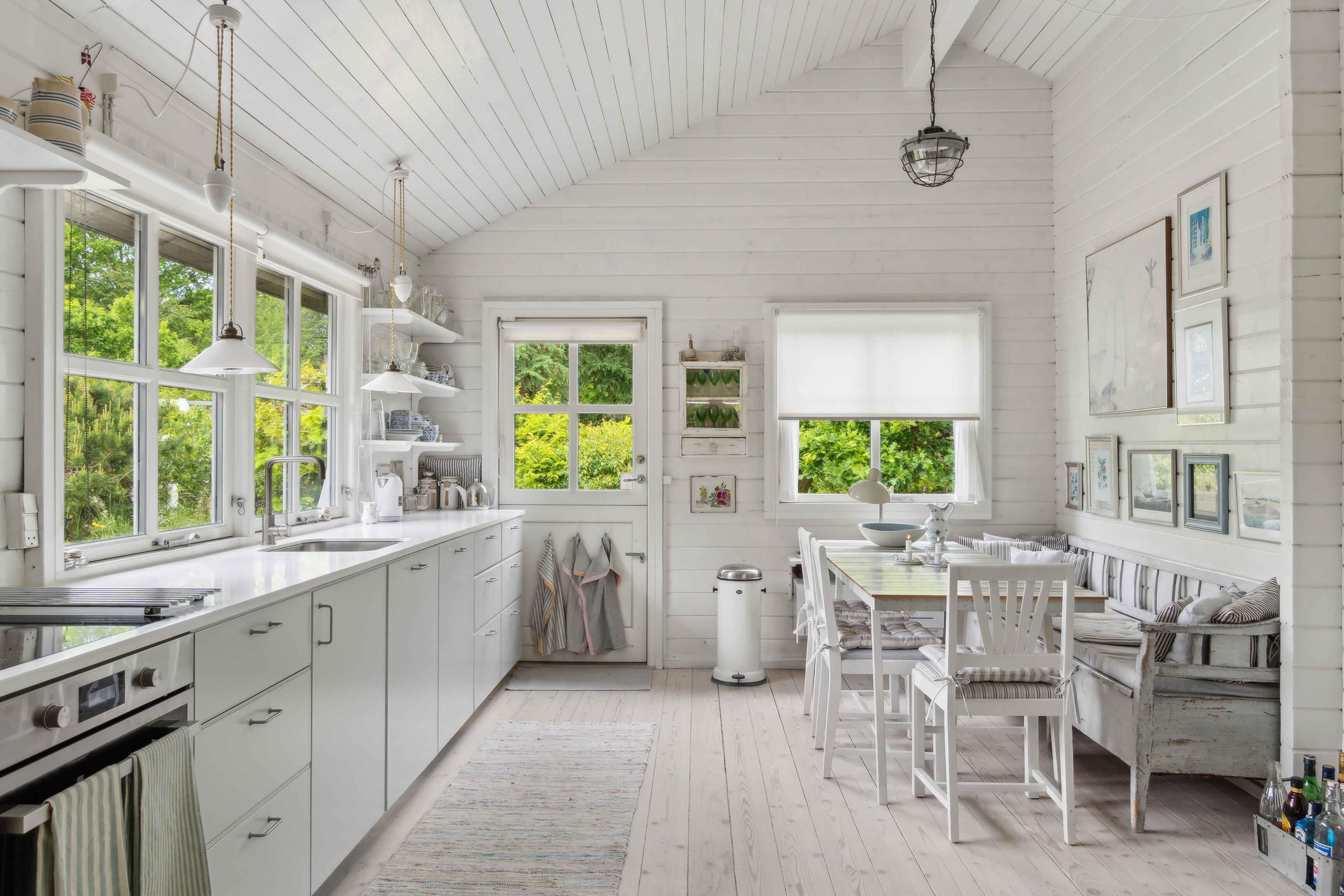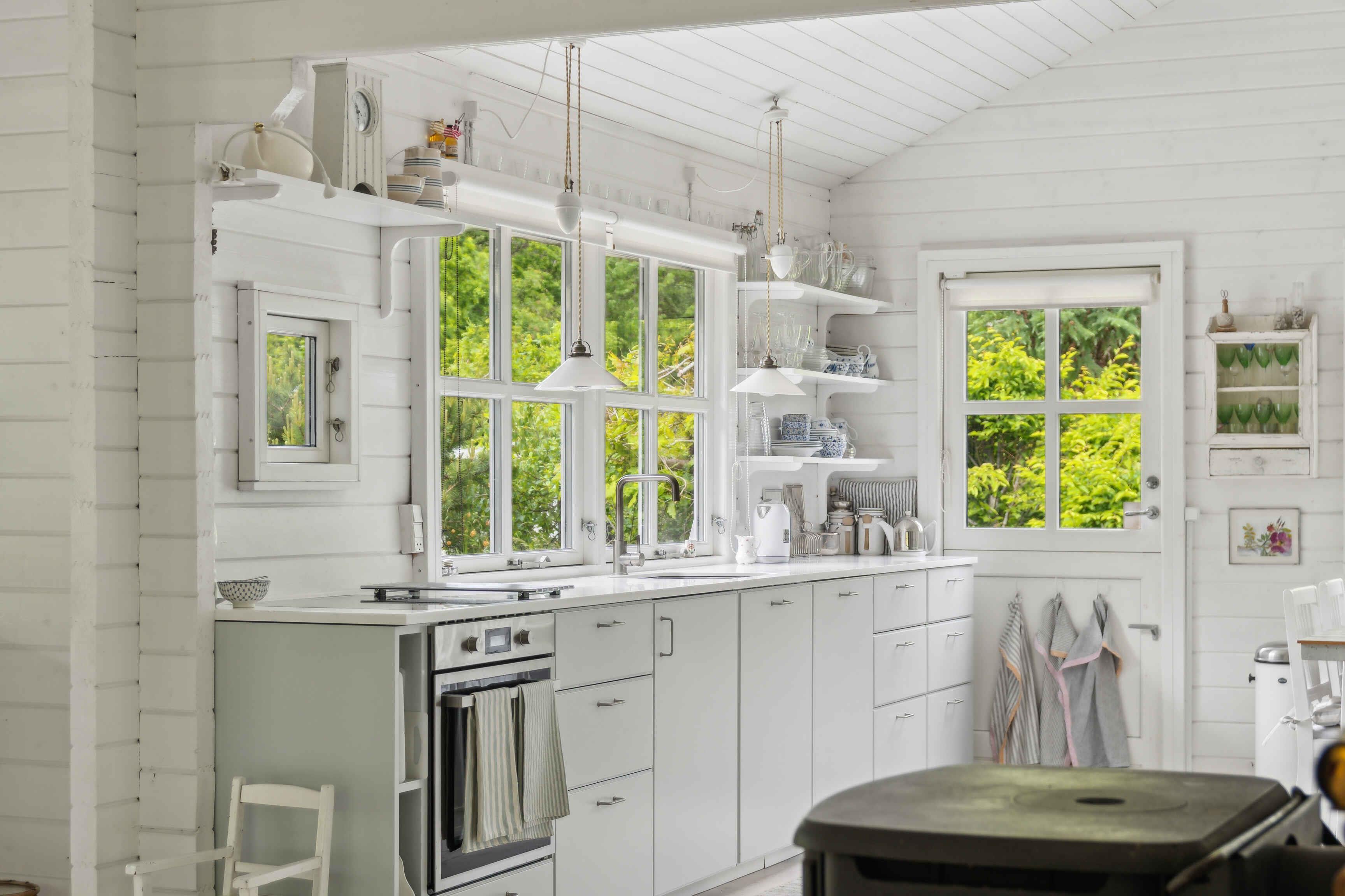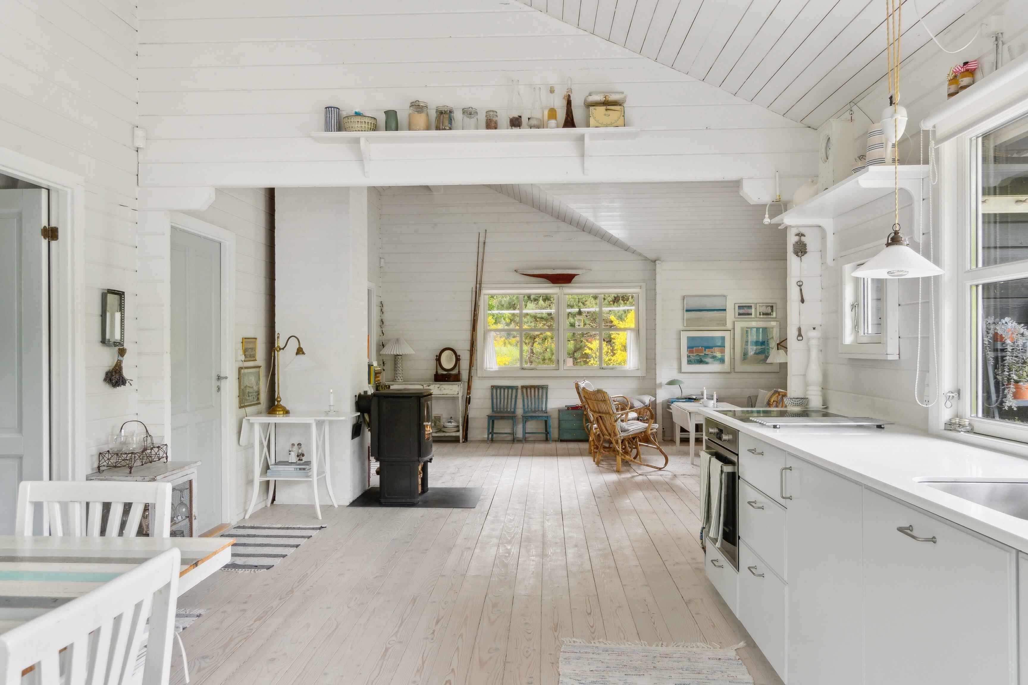 Charmant vakantiehuis op 300 m van een privéstrand met tuinmeubelen en een steiger. Het huis heeft een grote keuken, open haard, buitendouche, en een buitenkeuken met gasfornuis en barbecue. Mooi terras en meerdere slaapkamers.