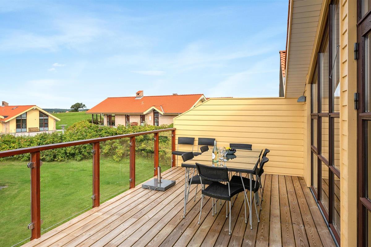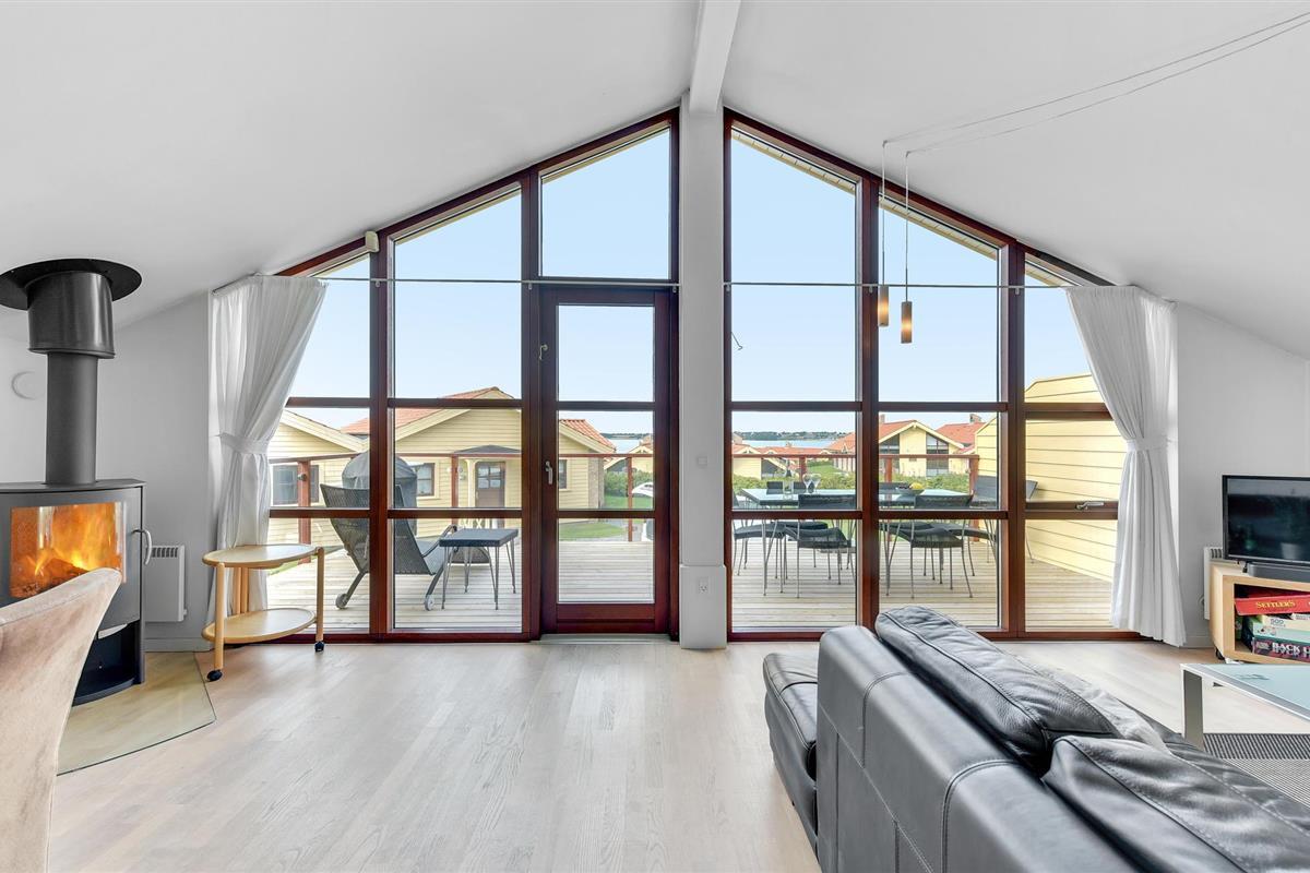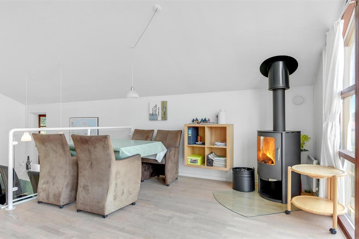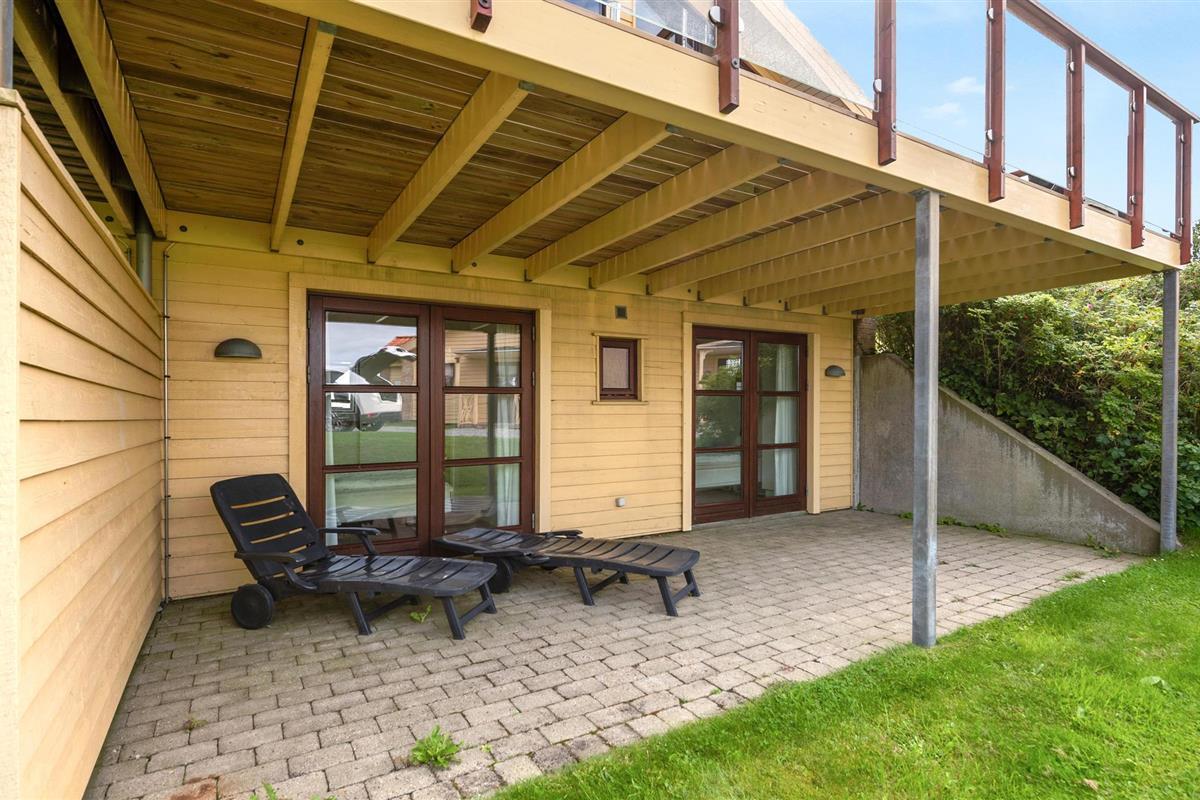 Vanuit de woonkamer heeft u toegang tot het terras met tuinmeubelen en barbecue voor zonnige middagen en lange zomeravonden. Zowel in de woonkamer als op het terras kunt u genieten van het uitzicht op het fjord. Het huis heeft ook een buitenruimte met goede speelmogelijkheden voor de kleintjes.