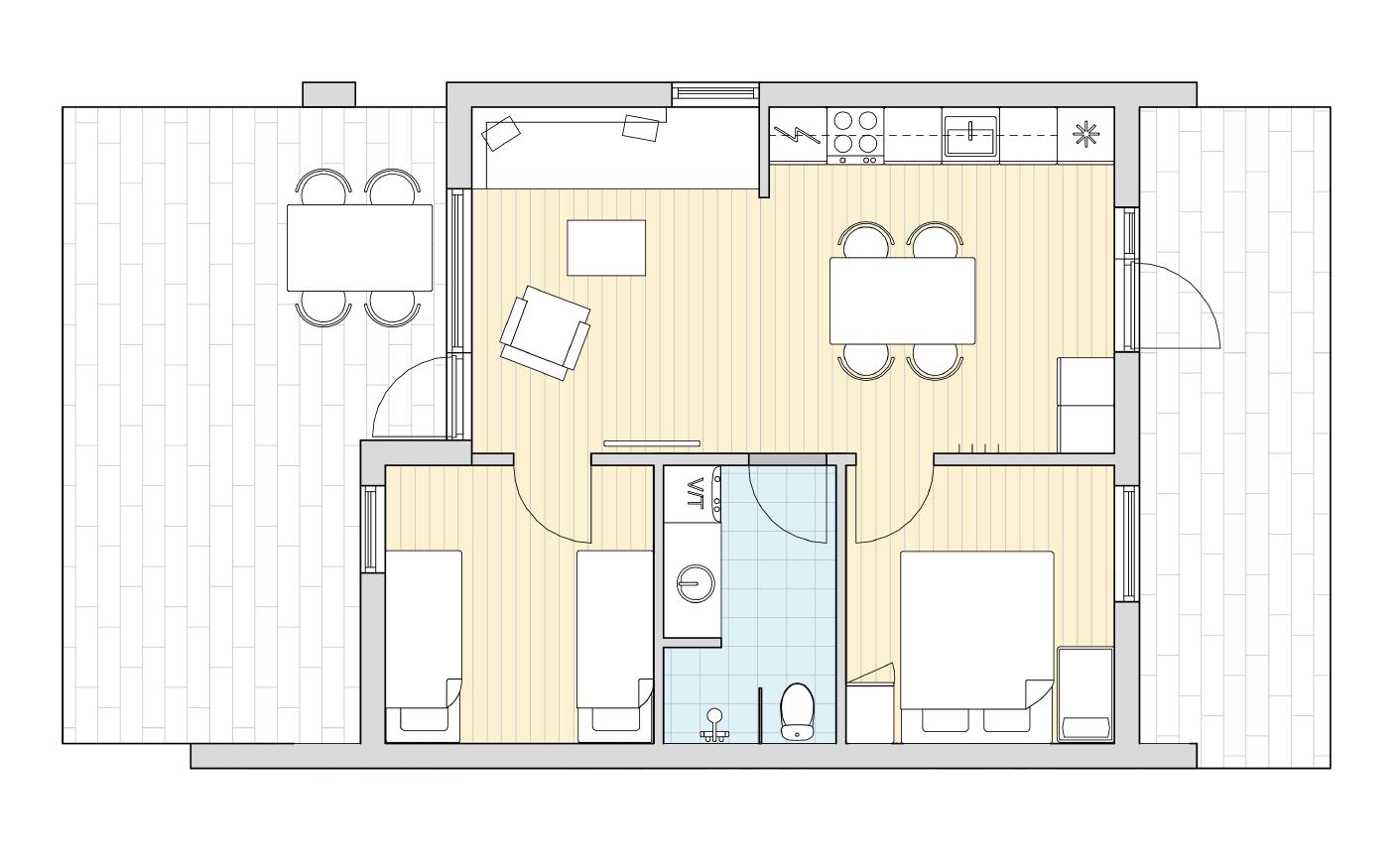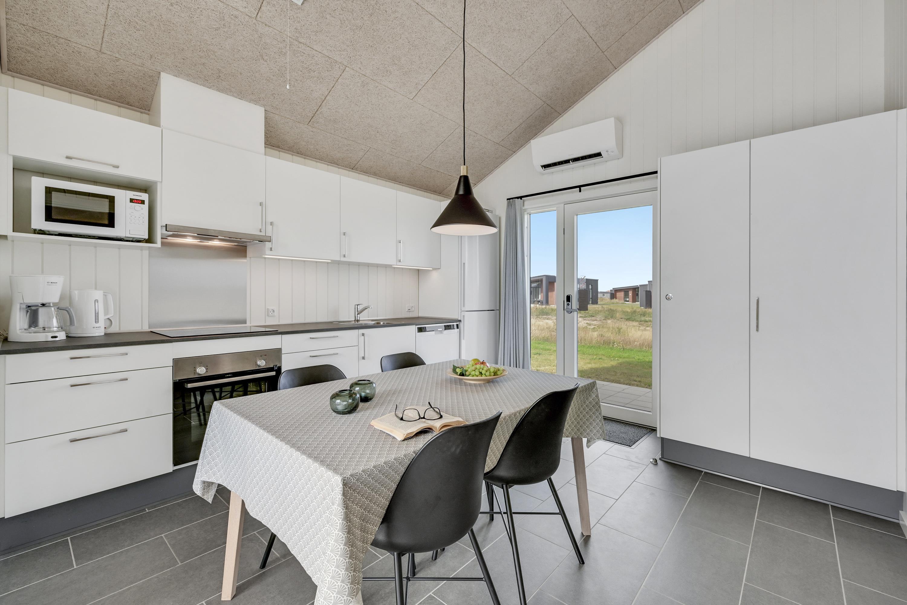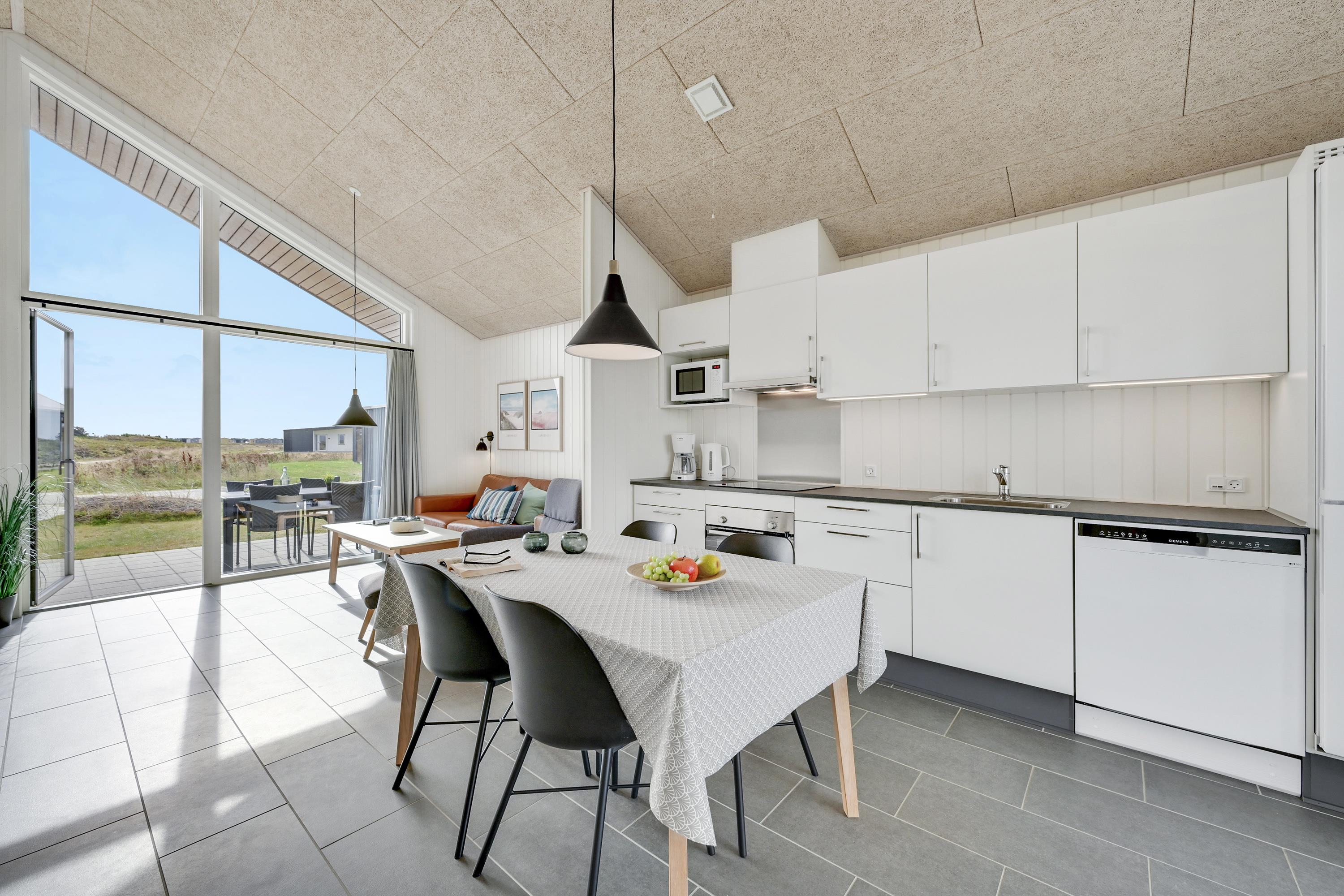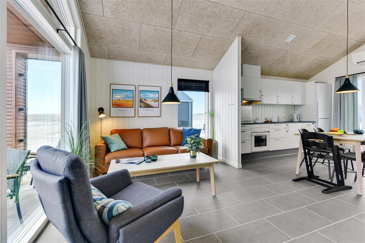 Dit vakantiehuis van 55 m² is een dubbelhuis en ideaal voor een gezin van vier personen dat wat meer ruimte wenst. Het heeft twee slaapkamers, een keuken/woonkamer en een badkamer – en het plafond loopt helemaal door tot aan het dak, waardoor er veel lichtinval is in het hele huis.