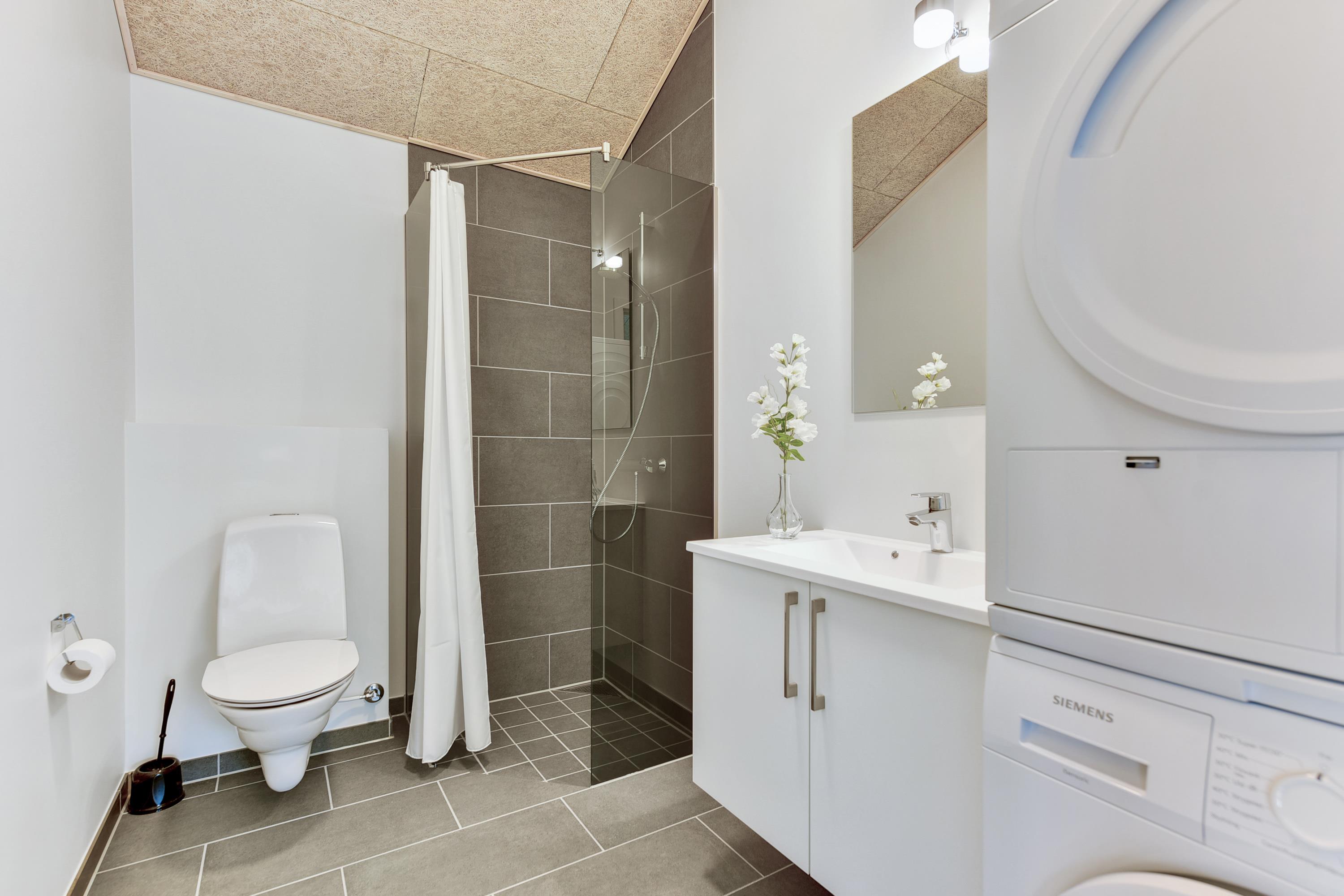 Badkamer: WC, wastafel, douchecabine en wasmachine en droger