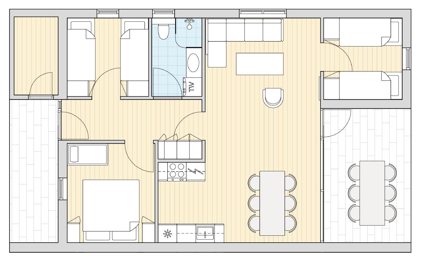 Dit vakantiehuis van 73 m² is gebouwd als een twee-onder-een-kapwoning. Met drie slaapkamers, een keuken/woonkamer en een badkamer biedt het voldoende ruimte voor een gezin van zes personen.