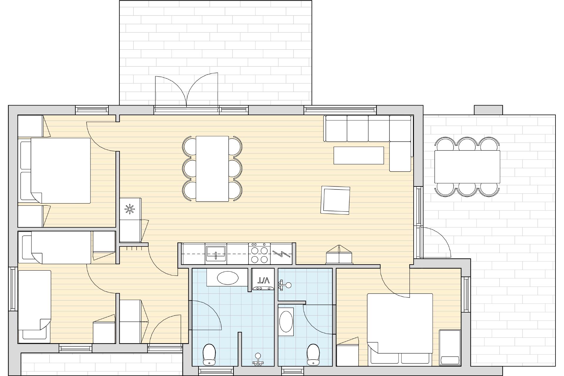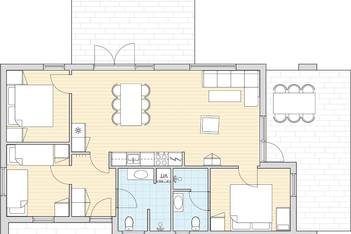 Dit vakantiehuis voor zes personen heeft drie slaapkamers, een keuken/woonkamer en twee badkamers. Als extraatje heeft het ruime Premium-vakantiehuis een extra tv in de grootste slaapkamer.