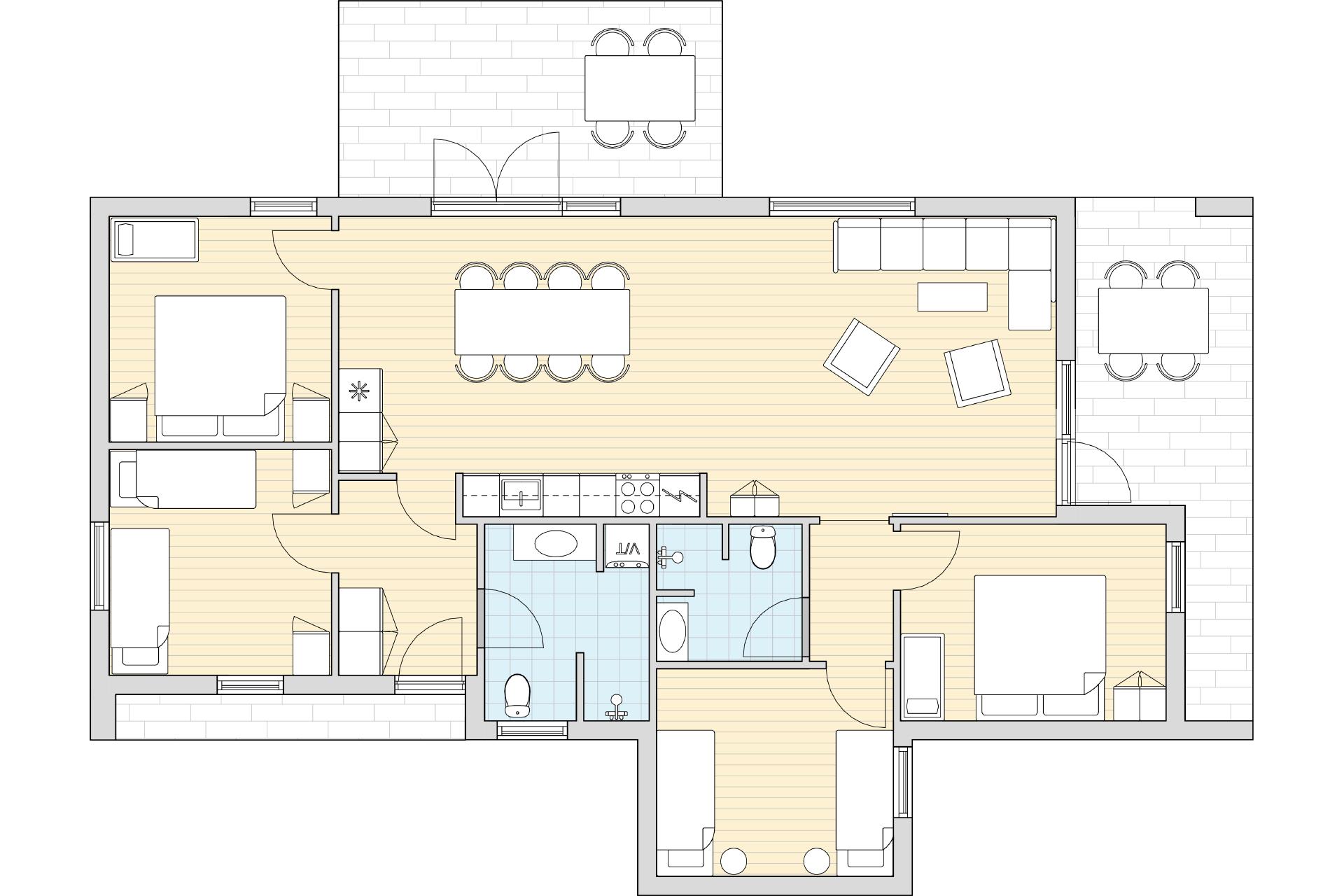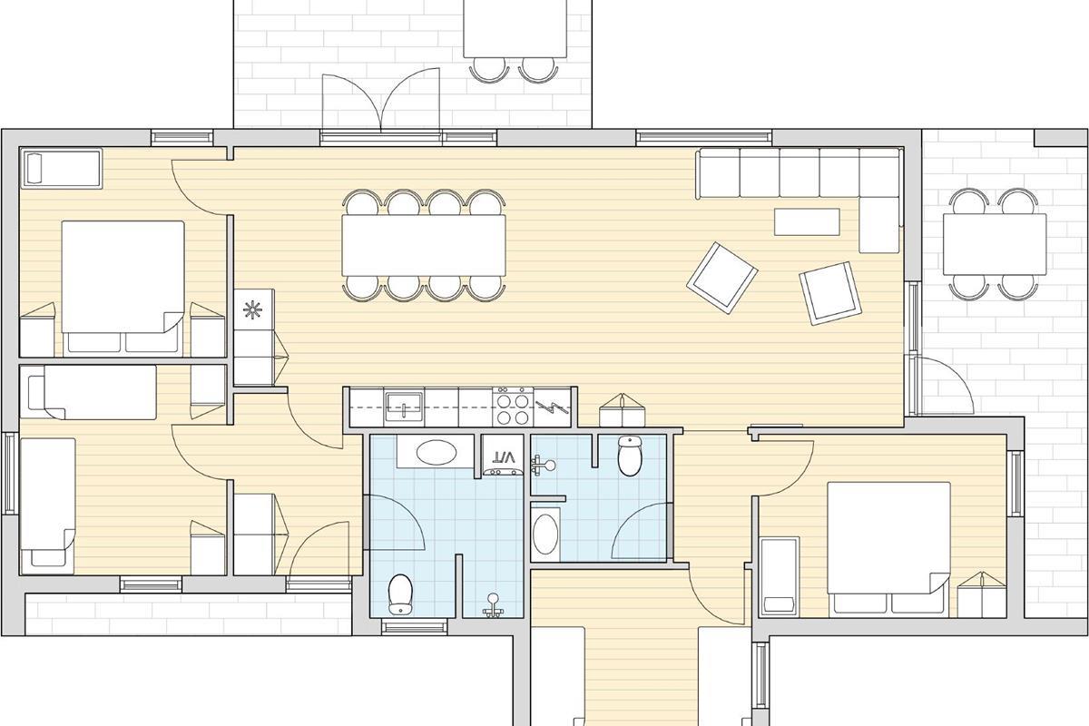 Dit vakantiehuis voor acht personen heeft vier slaapkamers, een keuken/woonkamer en twee badkamers en is perfect voor een groter gezin. Als extraatje heeft het Premium-vakantiehuis een extra tv in de grootste slaapkamer.