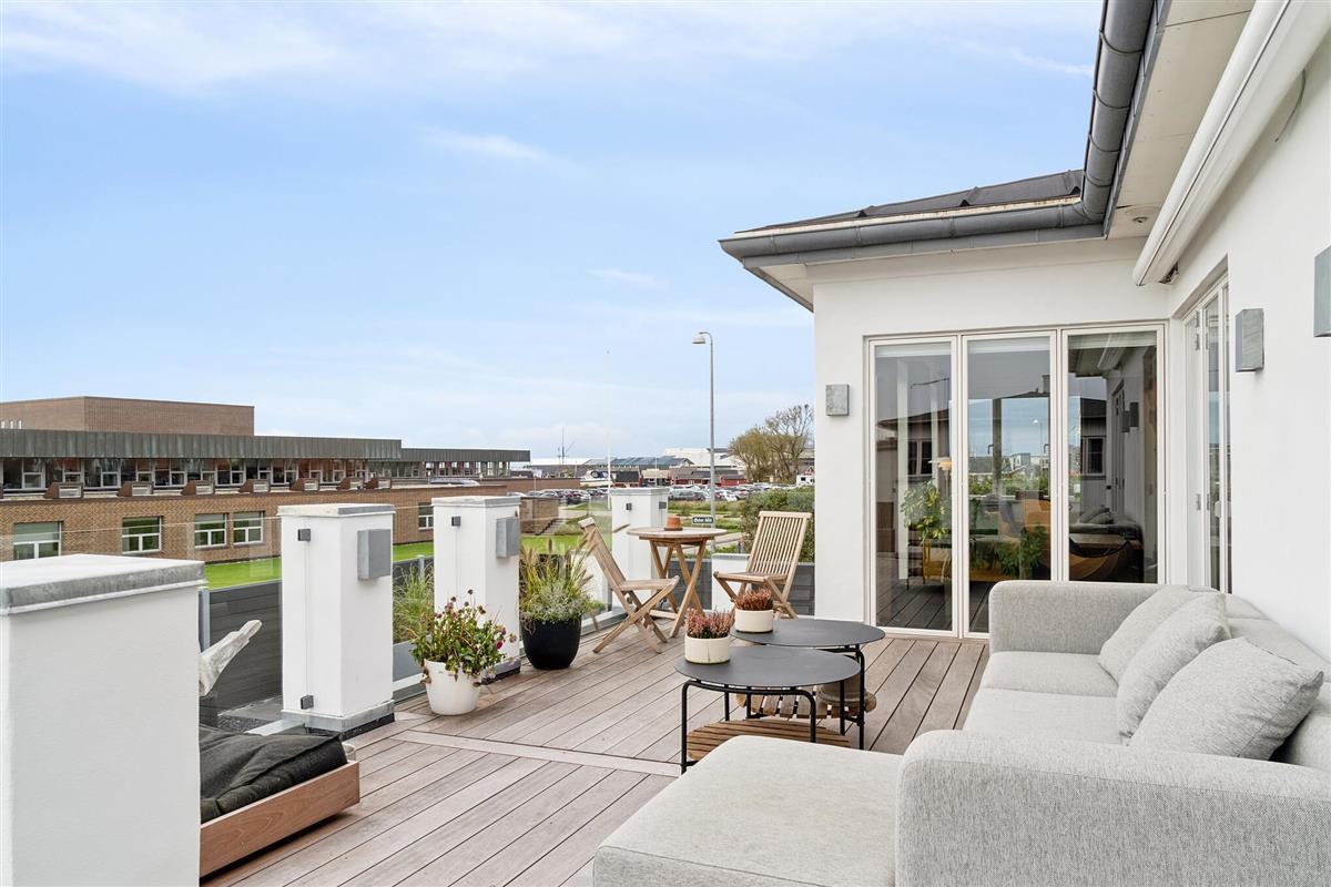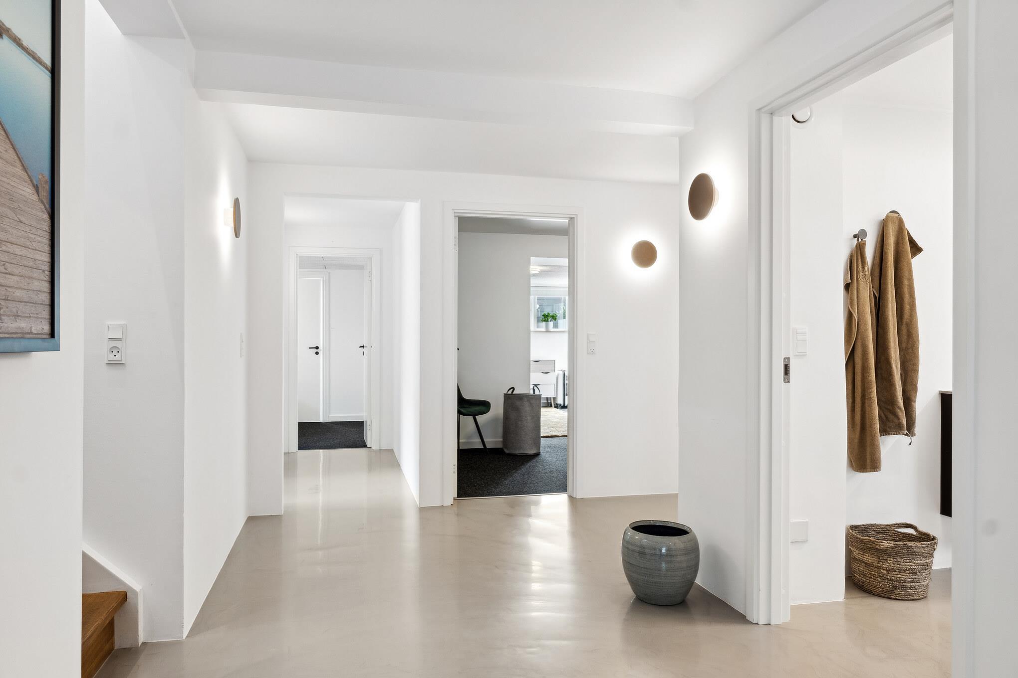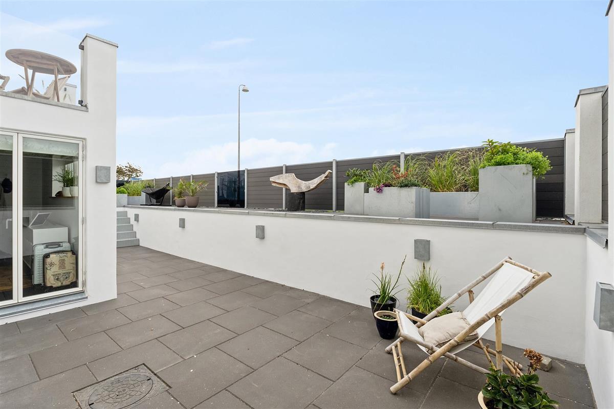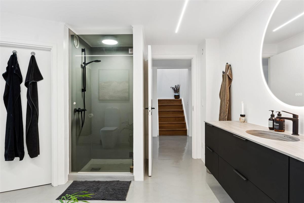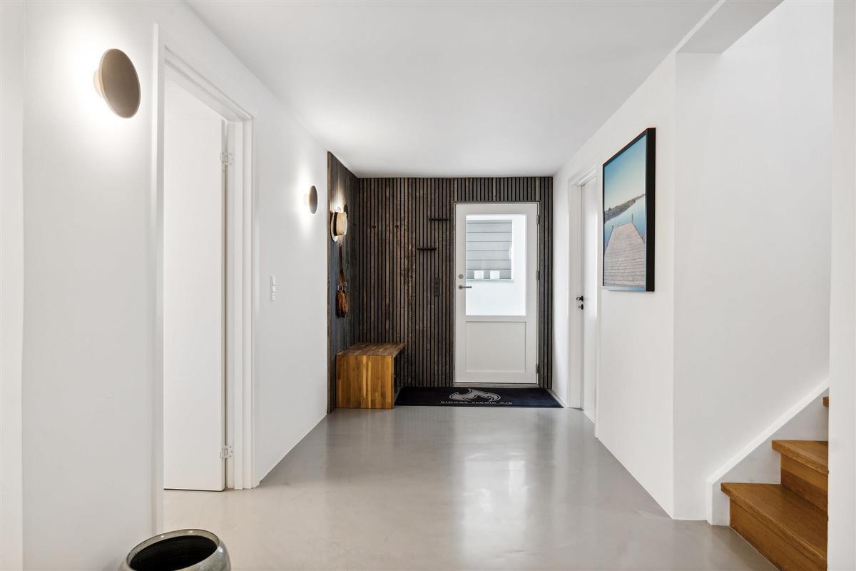 Outside, several sunny and inviting terrace areas await you. From the kitchen area, you have direct access to a raised wooden terrace facing west – ideal for morning coffee or a glass of wine at sunset. Another south-facing terrace offers sun from early morning until the afternoon and has a breathtaking view of the fjord. From here, a sweeping staircase leads down to the cosy, sunny courtyard, which is furnished with lounge furniture.