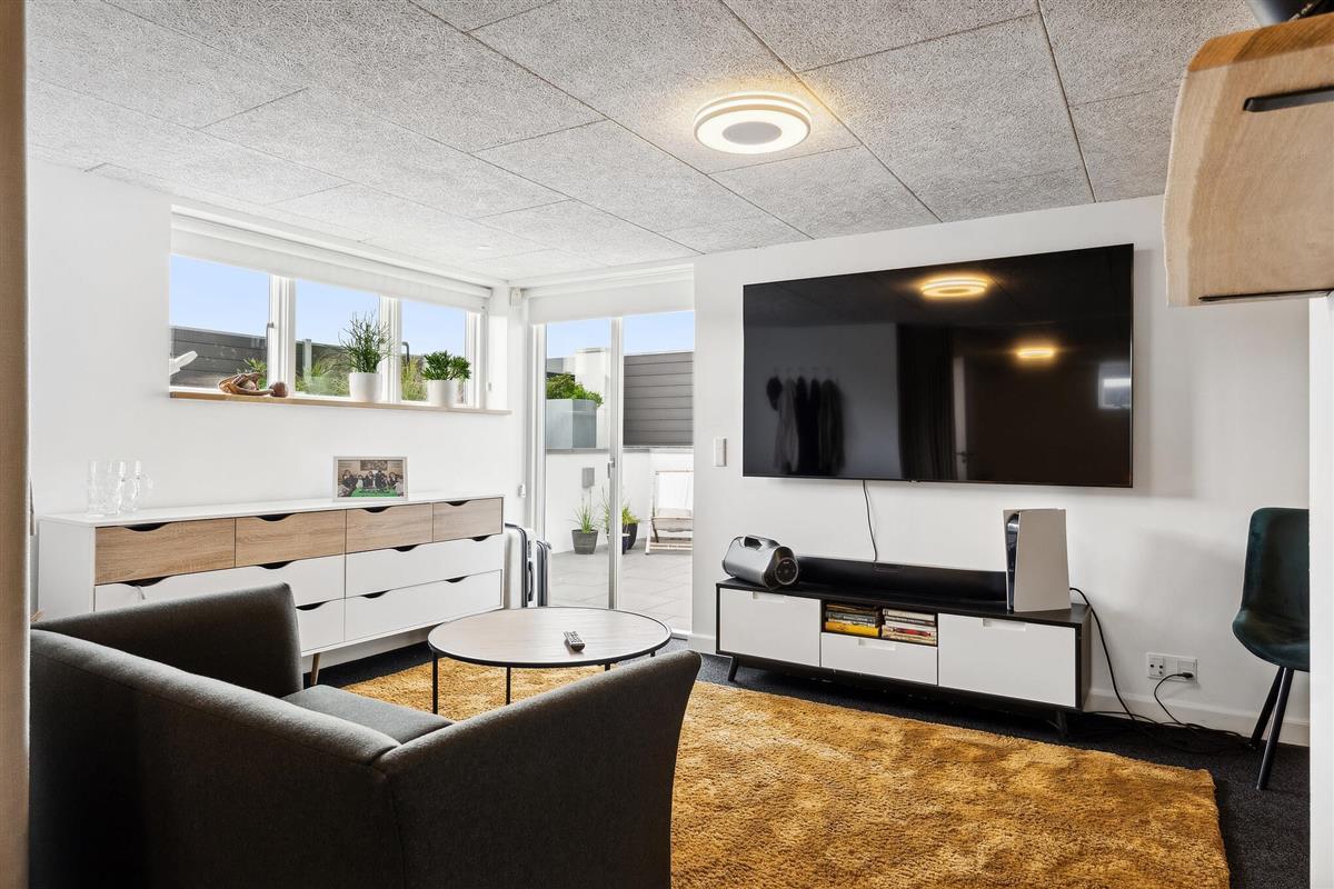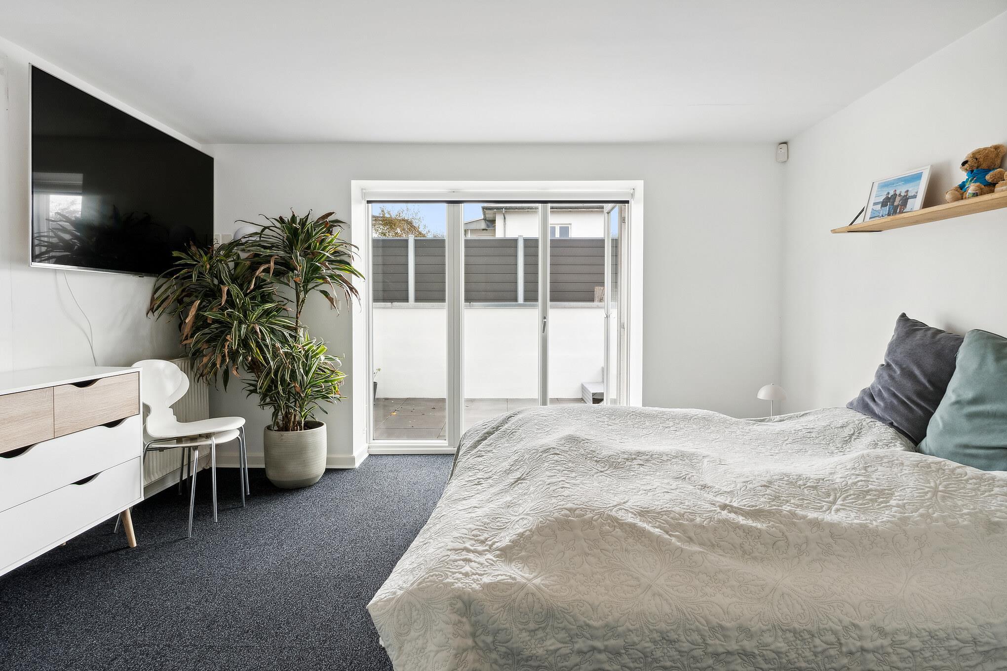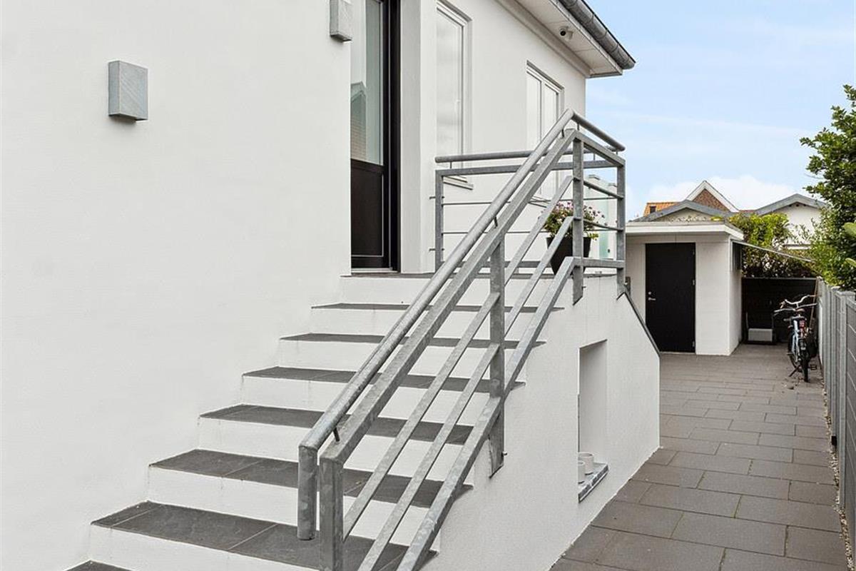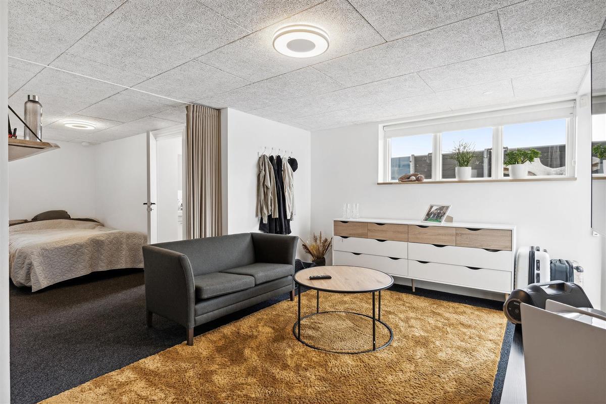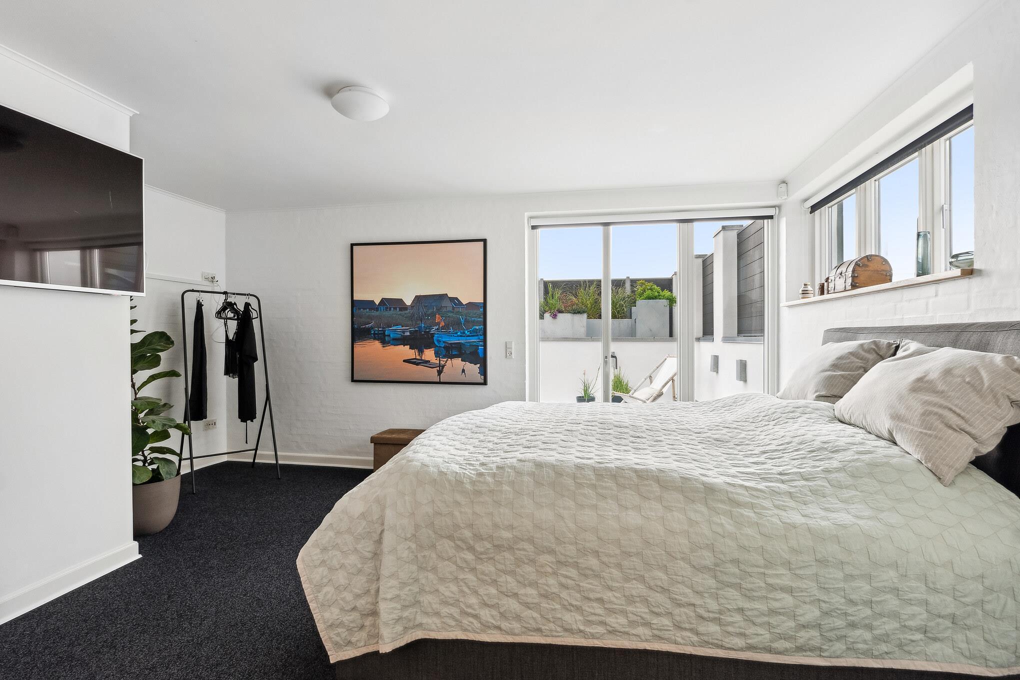 Outside, several sunny and inviting terrace areas await you. From the kitchen area, you have direct access to a raised wooden terrace facing west – ideal for morning coffee or a glass of wine at sunset. Another south-facing terrace offers sun from early morning until the afternoon and has a breathtaking view of the fjord. From here, a sweeping staircase leads down to the cosy, sunny courtyard, which is furnished with lounge furniture.