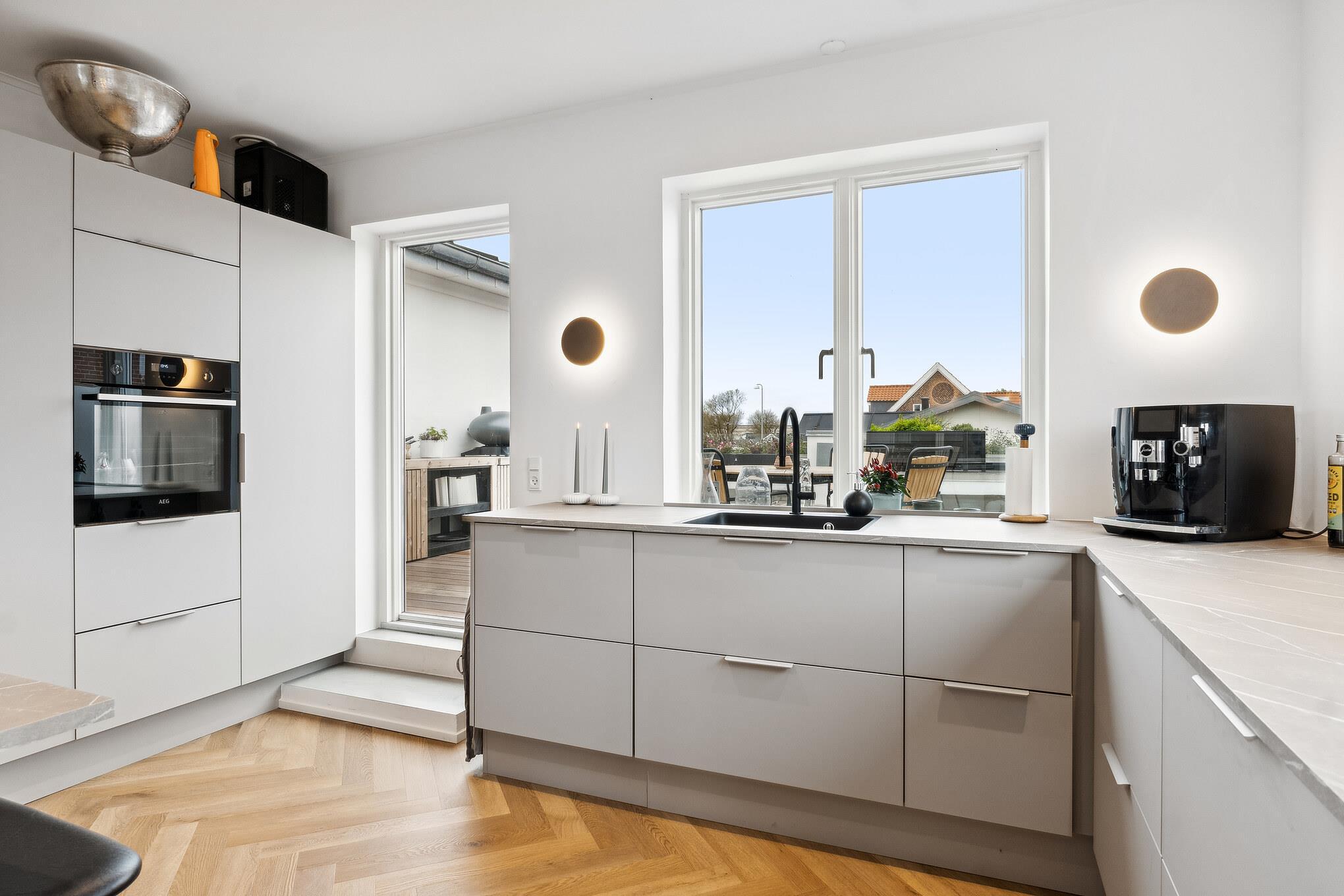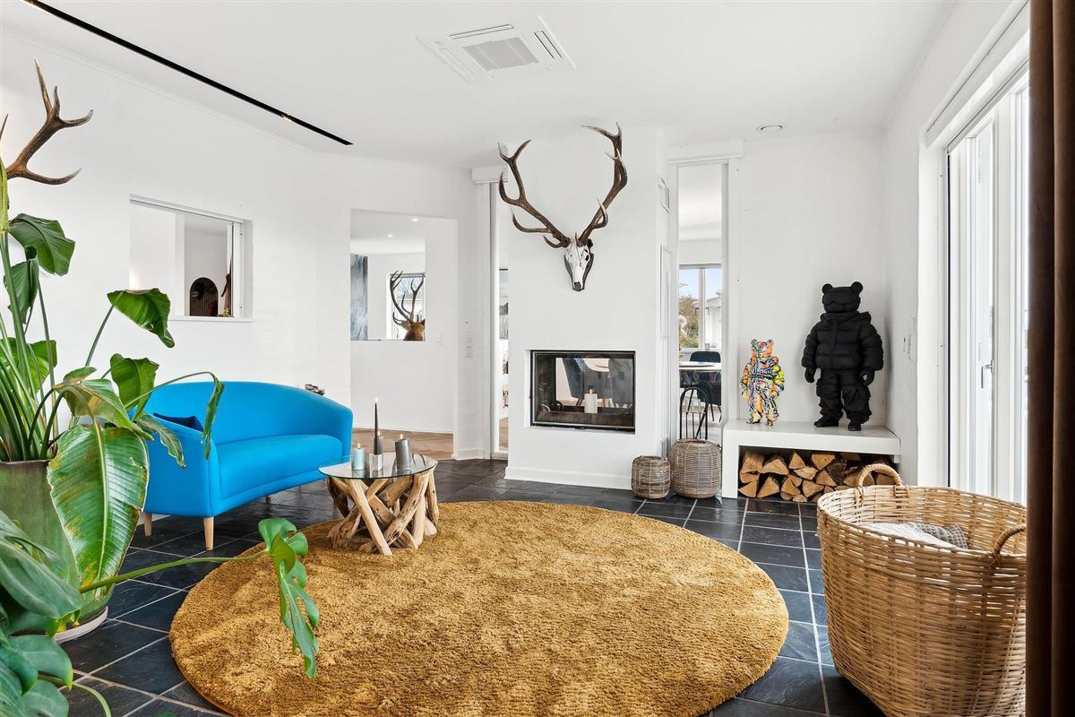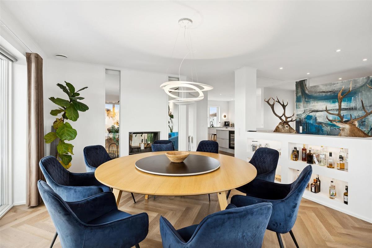 The house has a bright and stylish living and dining area with modern furnishings, elegant light grey elements and plenty of storage space. The beautiful herringbone parquet flooring extends into the adjoining living room, where large windows let in plenty of daylight and offer a magnificent view of the fjord. It's a wonderful place to eat together, relax or simply enjoy the peaceful atmosphere.