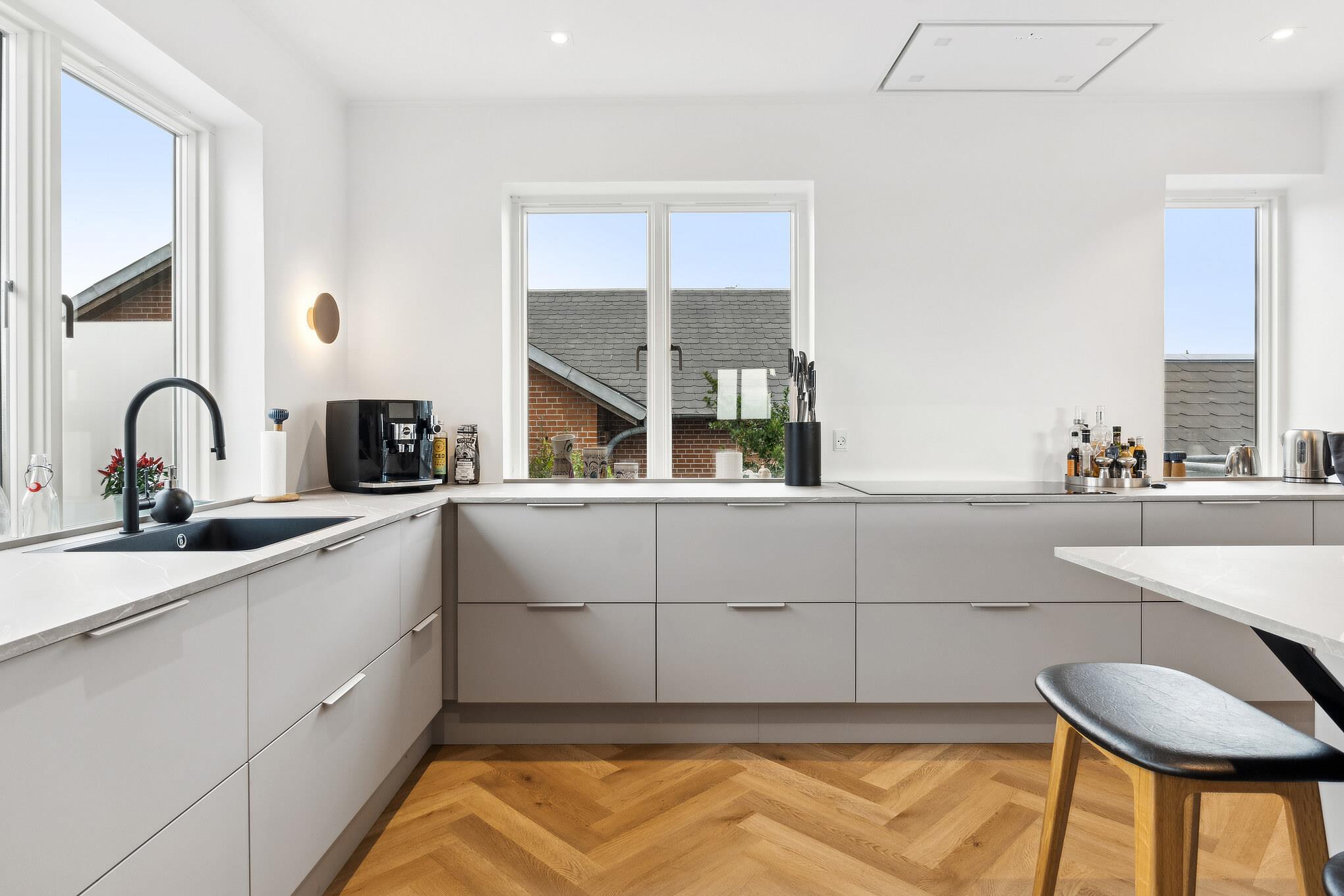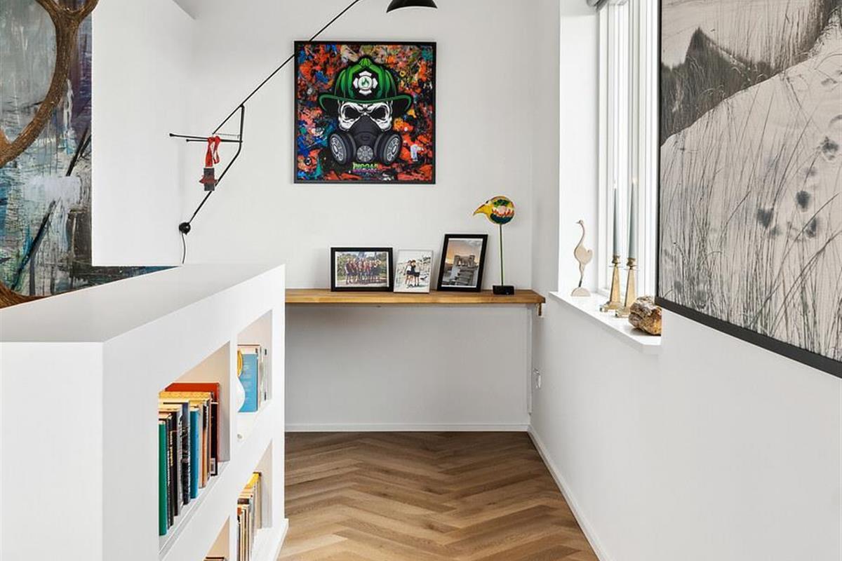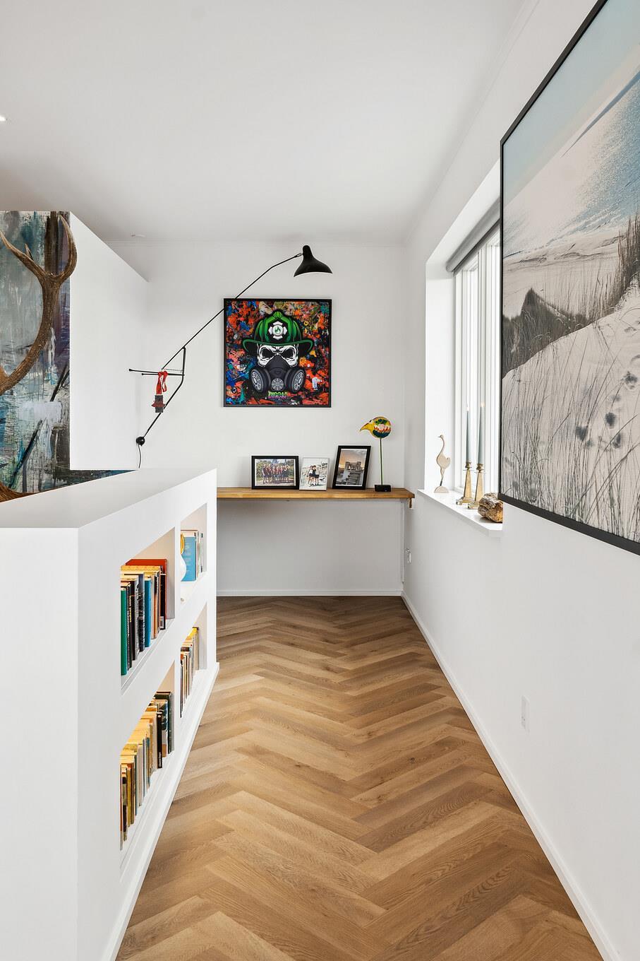 The house has a bright and stylish living and dining area with modern furnishings, elegant light grey elements and plenty of storage space. The beautiful herringbone parquet flooring extends into the adjoining living room, where large windows let in plenty of daylight and offer a magnificent view of the fjord. It's a wonderful place to eat together, relax or simply enjoy the peaceful atmosphere.
