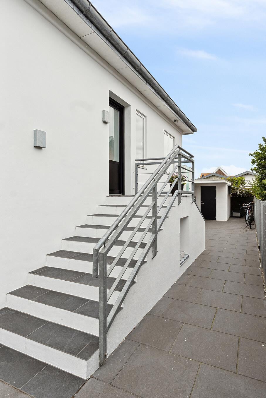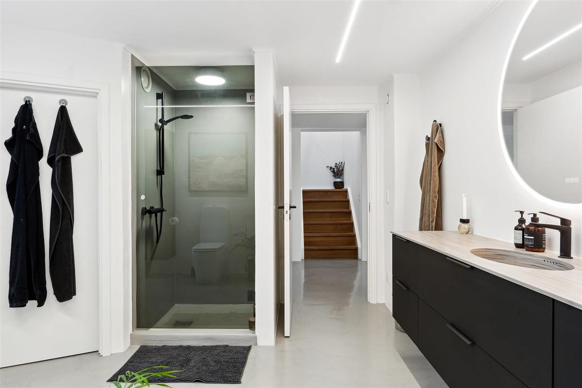 Outside, you’ll enjoy several inviting outdoor spaces. From the kitchen, step directly onto a raised wooden terrace facing west, where the breathtaking view of the fjord is perfect for morning coffee or an evening glass of wine. A staircase leads down to a sunny courtyard that can easily be arranged with lounge furniture. Another terrace facing south offers sunshine for most of the day.