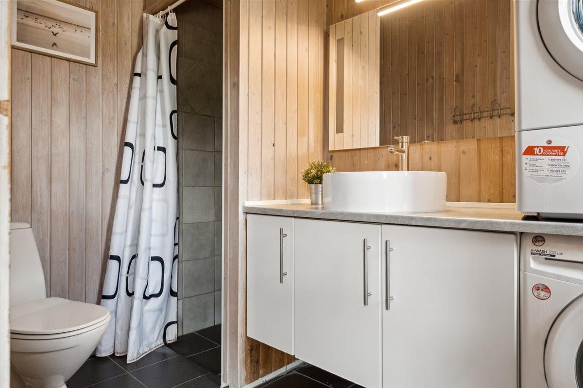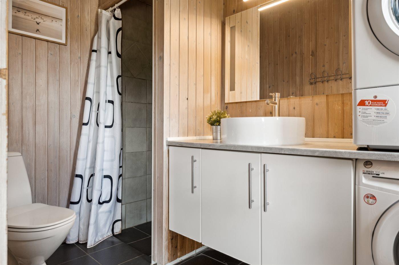 Er is 1 badkamers met vloerverwarming, douchehoek en toilet, een aparte douchehoek in het zwembadgedeelte en 1 gastentoilet met vloerverwarming. De sauna biedt de gelegenheid tot ontspanning.