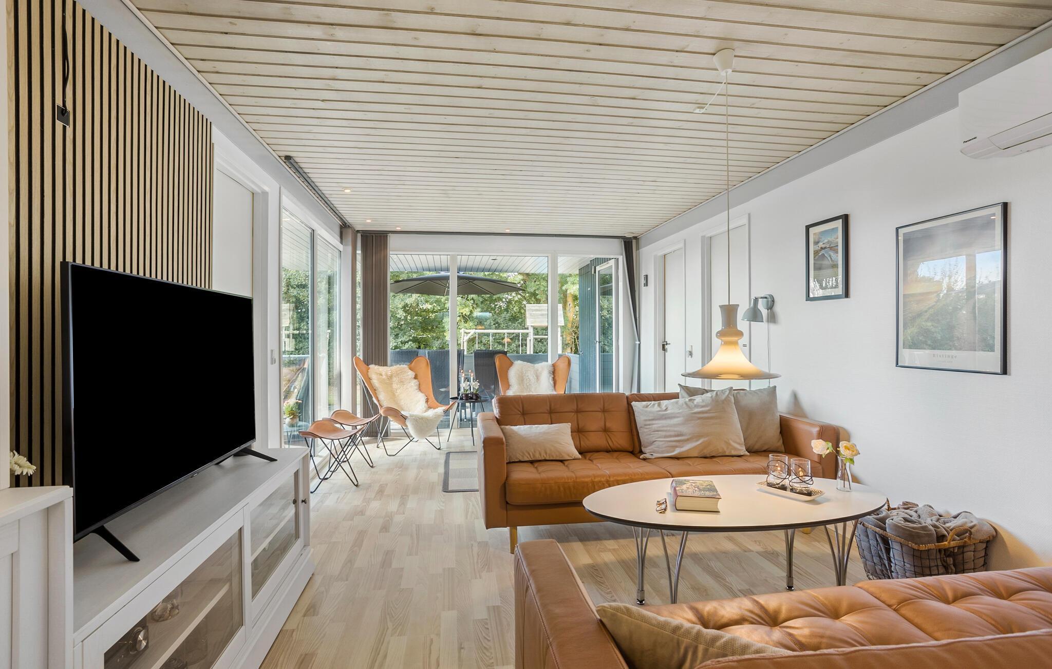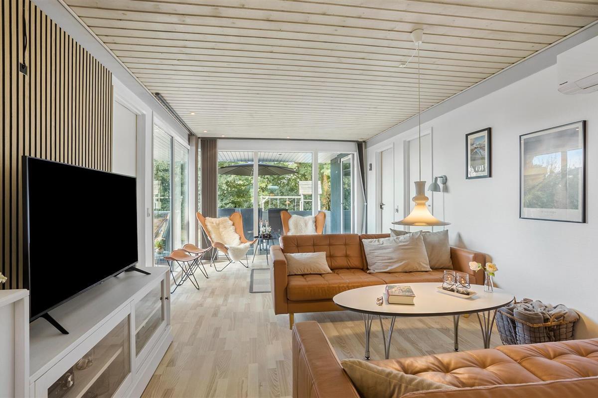 Ruim en gezellig houten vakantiehuis met zwembad, sauna en whirlpool in natuurgebied bij Ristinge.