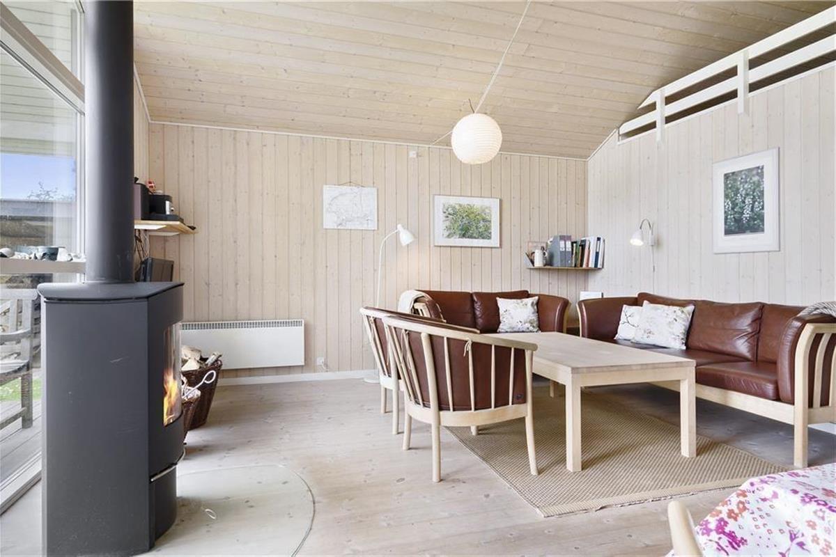 Wohnzimmer mit Aussicht über das Wasser, Kaminofen, TV mit dänischen Programmen und Radio.