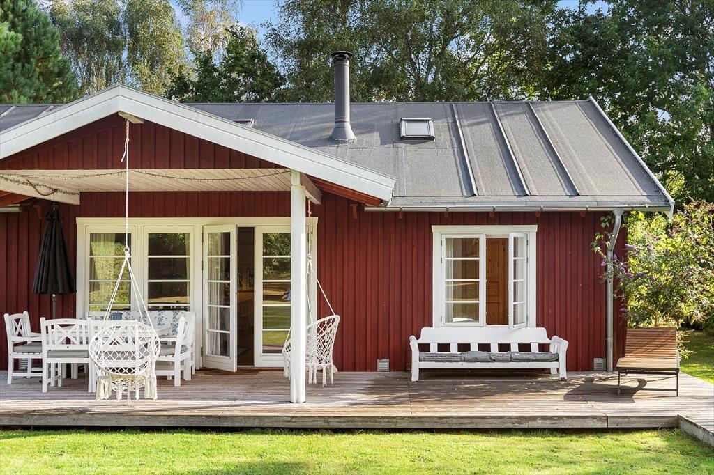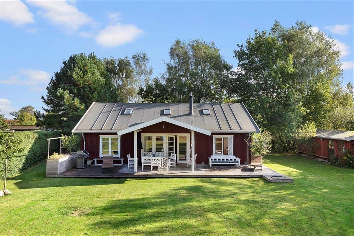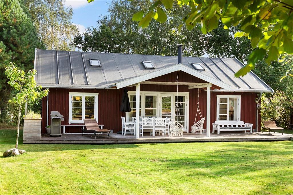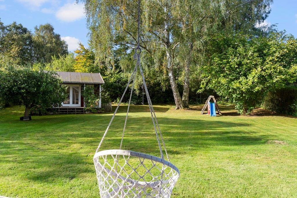 Hier erwartet Sie der schöne, geschlossene Garten – Sandkasten, Schaukeln und Rutsche zur großen Freude der Kleinen – genießen Sie ein Lagerfeuer im Garten, das den Rahmen für einen gemütlichen Abend mit Snobrød bildet.