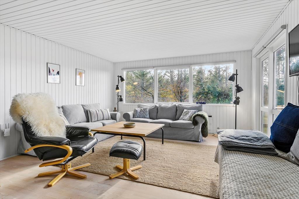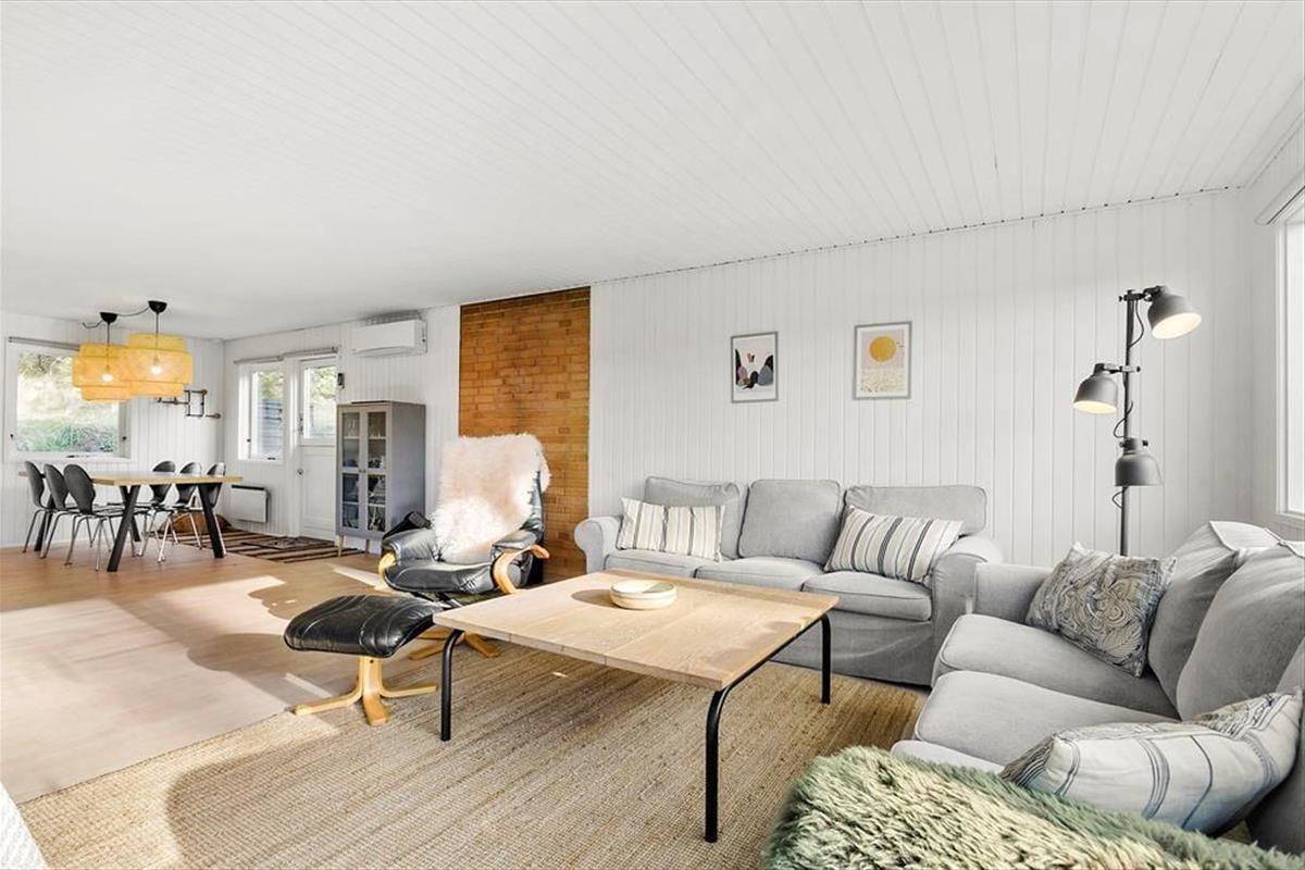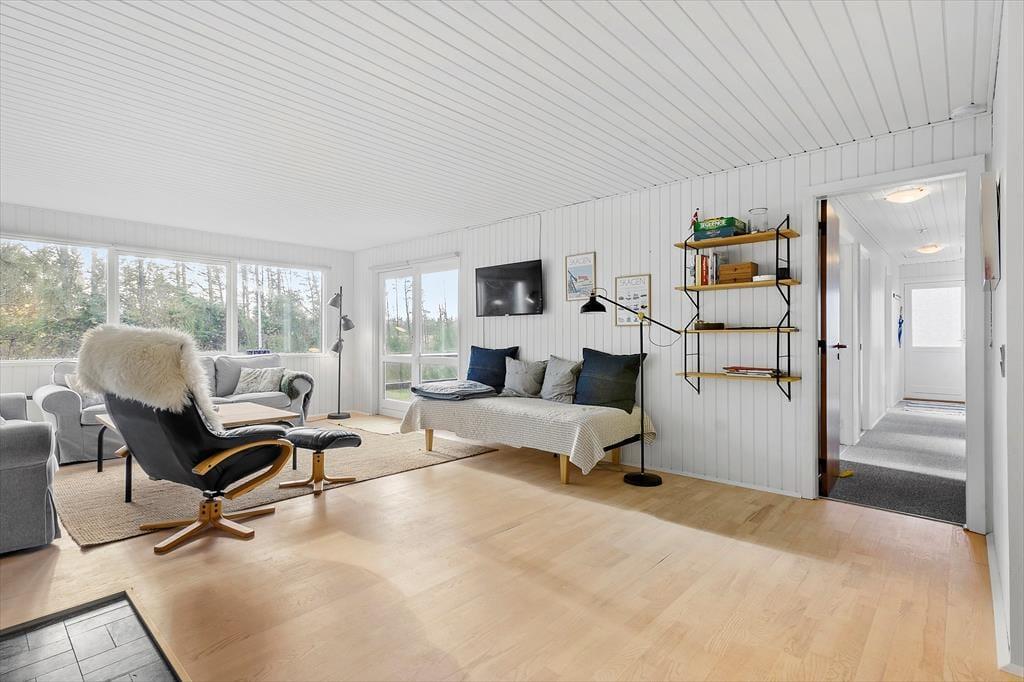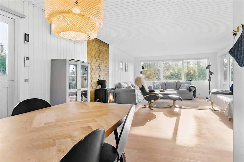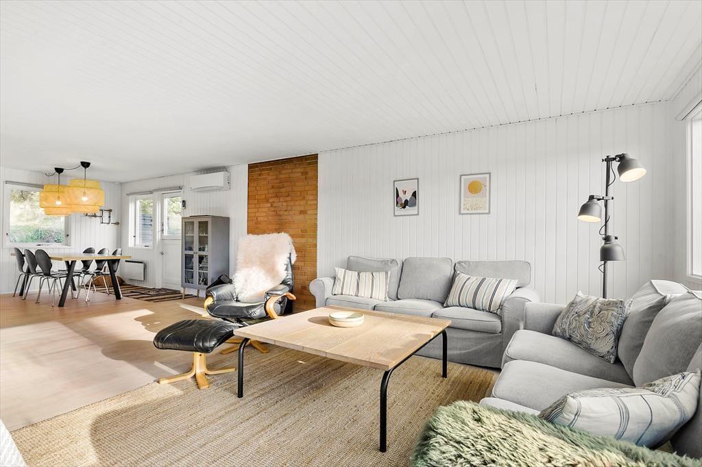 Das 90 m² große Haus hat eine wunderbare Atmosphäre und eine gut funktionierende Einrichtung, sodass es sich drinnen gut leben lässt. Der Grundriss ist perfekt für sechs Personen: Es gibt vier Schlafzimmer und ein Badezimmer mit Dusche und Fußbodenheizung direkt daneben. Der größte Raum im Haus ist das Wohnzimmer, das mit schönen Möbeln, einem Kaminofen und einer funktionalen offenen Küche mit Geschirrspüler, Kühlschrank mit Gefrierfach, Mikrowelle und vielem mehr ausgestattet ist. Das Licht, das in den Wohnraum fällt, ist hier angenehm, und die beiden Terrassentüren machen es einfach, die beiden Terrassen des Hauses zu nutzen.